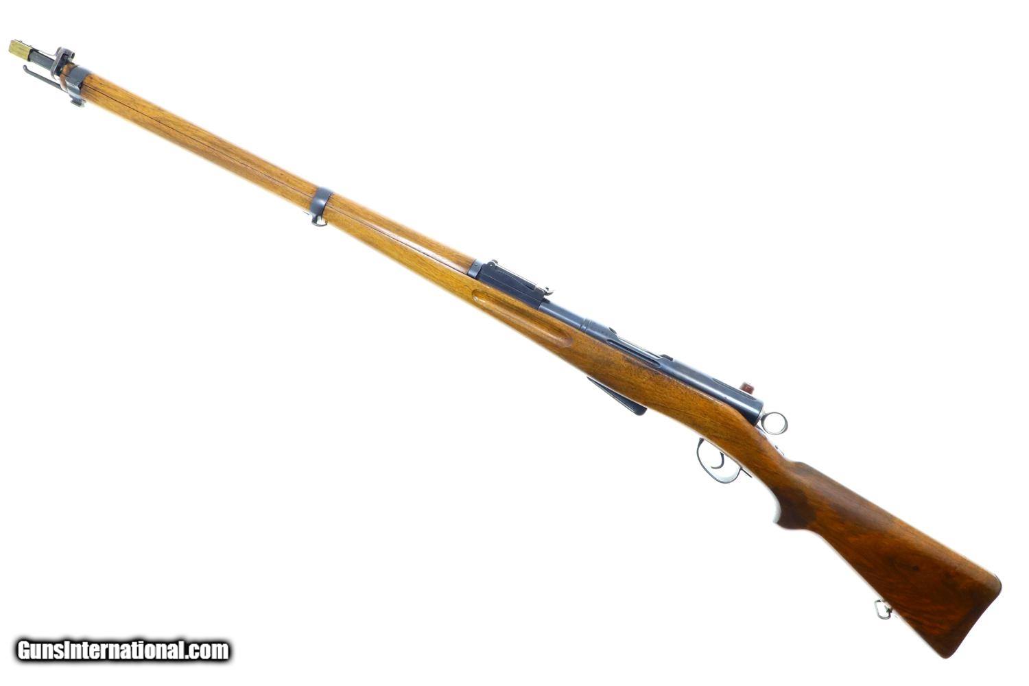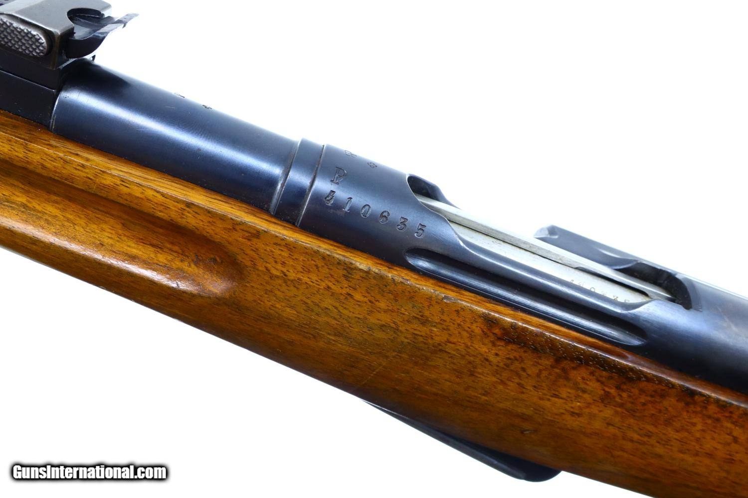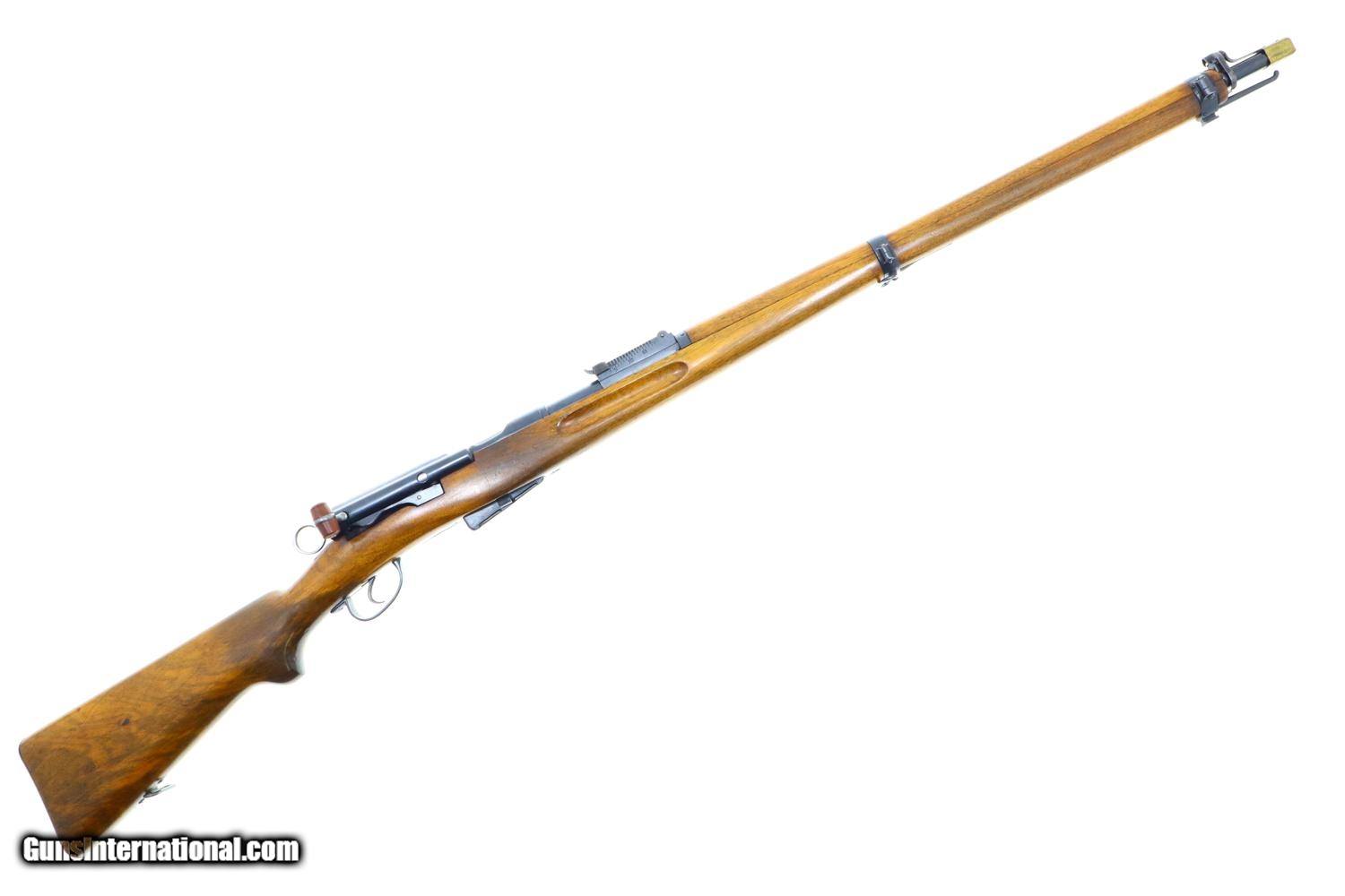 Description: Standard configuration and matching 1911 rifle, caliber 7.5x55, with barrel length 30.7'/overall length 51.5'/6-shot detachable magazine, made 1912 to 1919, total production estimated at 127,000, this example made 1916, with tangent rear sight graduated 1-15, straight pull bolt, detachable magazine, brass muzzle cap and metal buttplate. The left side of receiver is marked 410635, the same number repeated on the barrel, bolt, and bottom of the magazine. Walnut stock, military accepted. Metal buttplate. Correct muzzle cap. Synopsis: Bern, 1911, Swiss Military Rifle, 410635, I-1038 Condition: VG+ original blue with comparable condition stock. Dull bore sharp rifling. Perfect manual mechanics. A classic and early Swiss military rifle, much better than most, perfect for your collection! ~~Insured shipping fee of $75; most packages shipped using FedEx 2nd Day.~~ SOLD Curio/Relic: Yes Manufacturer: Bern Serial Number: 410635 Caliber Info: 7.5x55 |