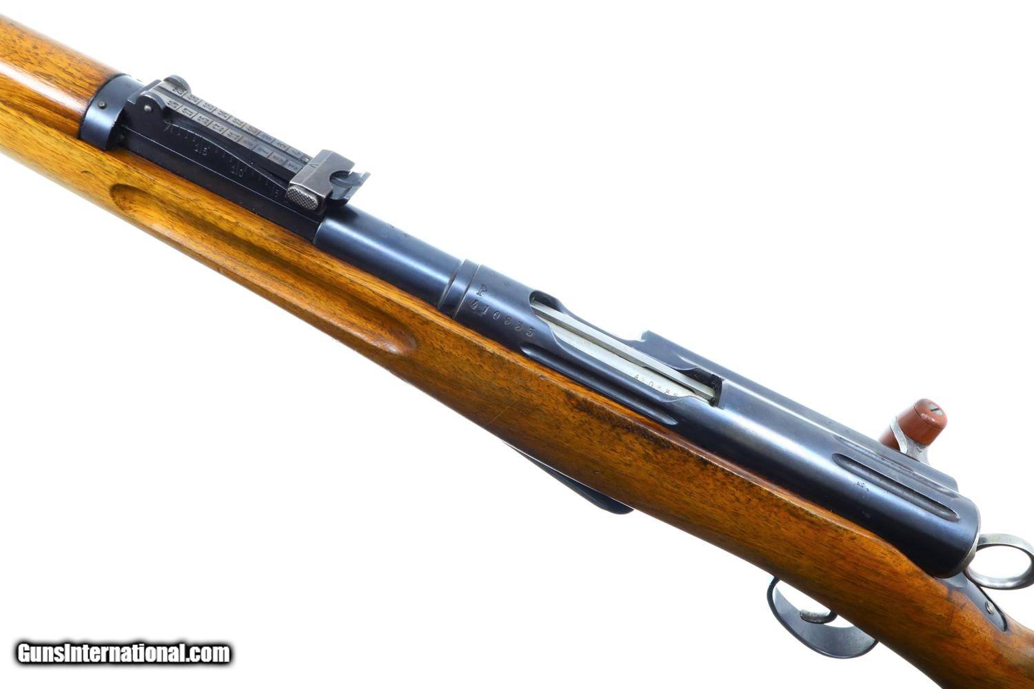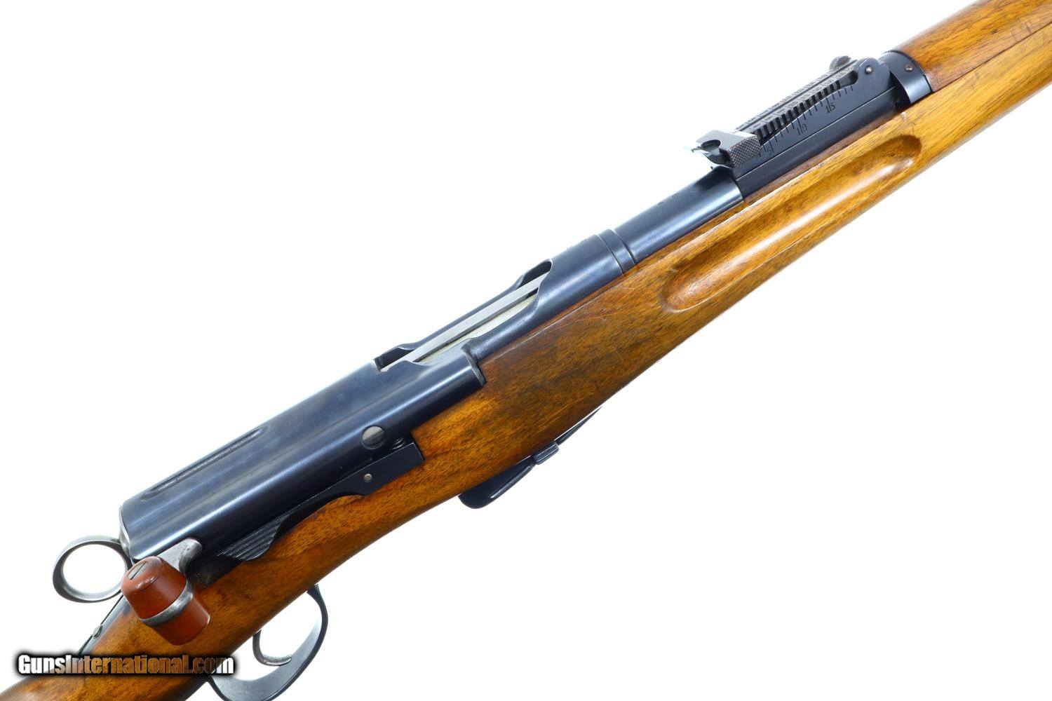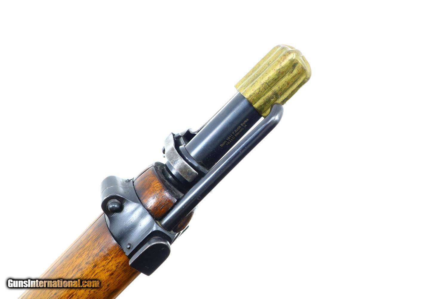 Description: Standard configuration and matching 1911 rifle, caliber 7.5x55, with barrel length 30.7'/overall length 51.5'/6-shot detachable magazine, made 1912 to 1919, total production estimated at 127,000, this example made 1916, with tangent rear sight graduated 1-15, straight pull bolt, detachable magazine, brass muzzle cap and metal buttplate. The left side of receiver is marked 410635, the same number repeated on the barrel, bolt, and bottom of the magazine. Walnut stock, military accepted. Metal buttplate. Correct muzzle cap. Synopsis: Bern, 1911, Swiss Military Rifle, 410635, I-1038 Condition: VG+ original blue with comparable condition stock. Dull bore sharp rifling. Perfect manual mechanics. A classic and early Swiss military rifle, much better than most, perfect for your collection! ~~Insured shipping fee of $75; most packages shipped using FedEx 2nd Day.~~ SOLD Curio/Relic: Yes Manufacturer: Bern Serial Number: 410635 Caliber Info: 7.5x55 |