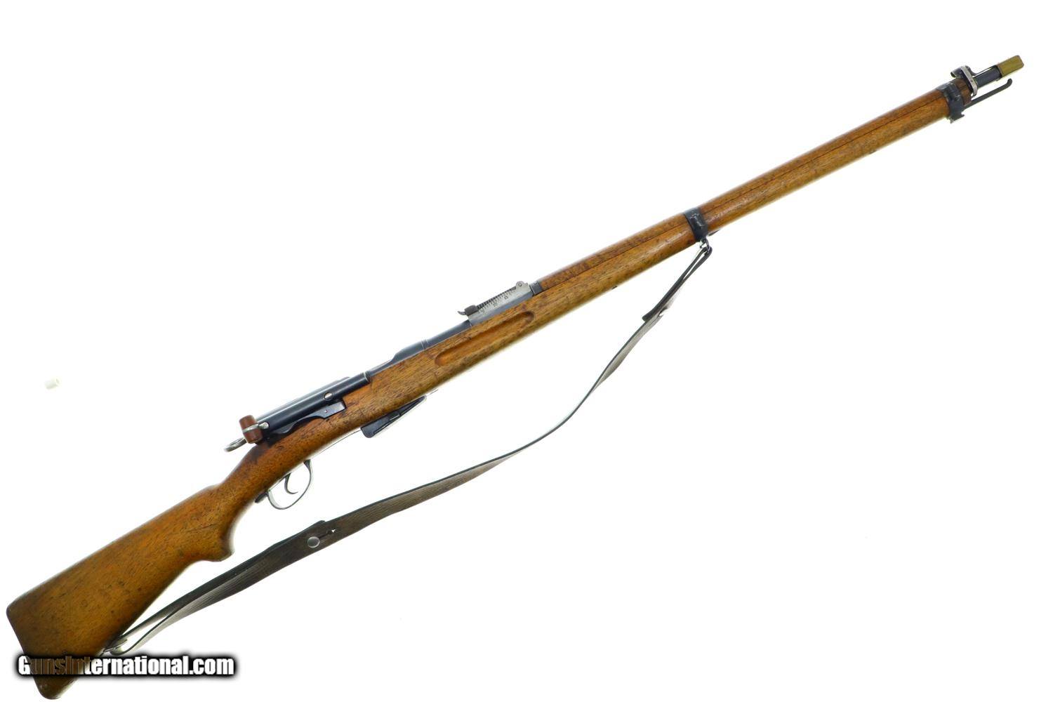 Description: Standard configuration and matching 1911 rifle, caliber 7.5x55, with barrel length 30.7'/overall length 51.5'/6-shot detachable magazine, made 1912 to 1919, total production estimated at 127,000, this example made 1918, with tangent rear sight graduated 1-15, straight pull bolt, detachable magazine, brass muzzle cap and metal buttplate. The left side of receiver is marked 471395, the same number repeated on the barrel, bolt, and bottom of the magazine. Walnut stock, military accepted. Metal buttplate. Correct muzzle cap. Leather sling. Synopsis: Bern, 1911, Swiss Military Rifle, 471395, I-1047 Condition: G original blue. Dull bore.with sharp rifling Perfect manual mechanics. A classic and early Swiss military rifle, much better than most, perfect for your collection! ~~Insured shipping fee of $75; most packages shipped using FedEx 2nd Day.~~ SOLD Curio/Relic: Yes Serial Number: 471395 Caliber Info: 7.5x55 |
