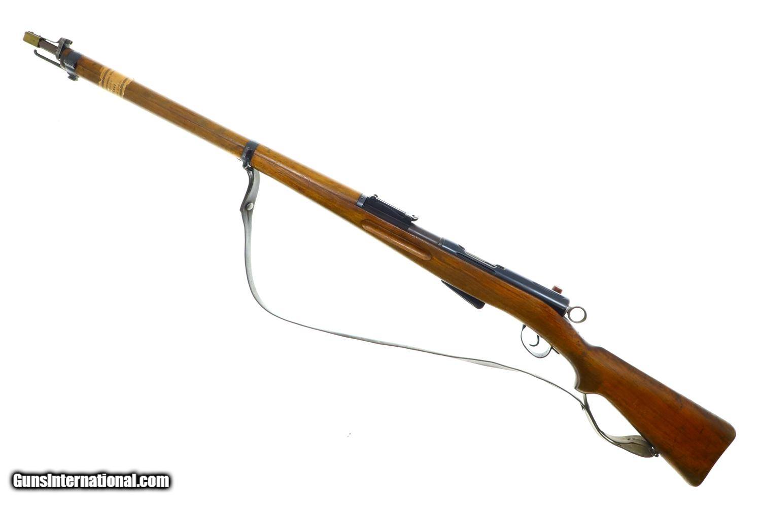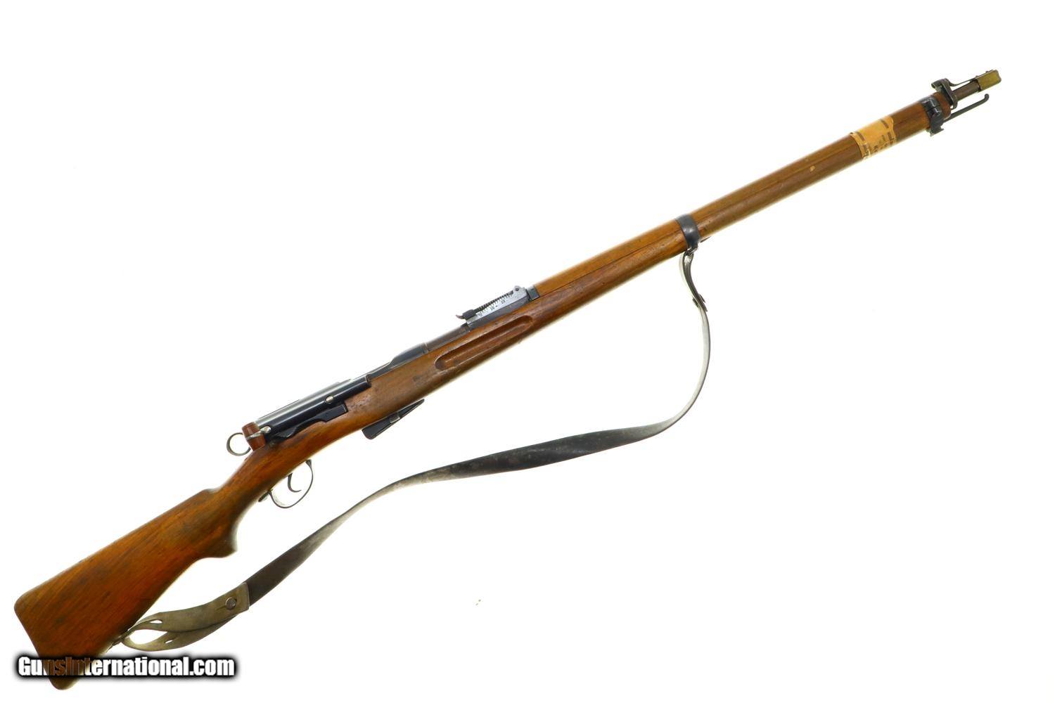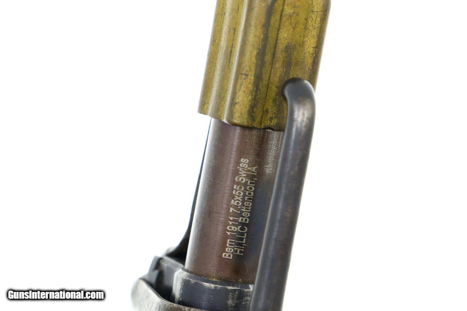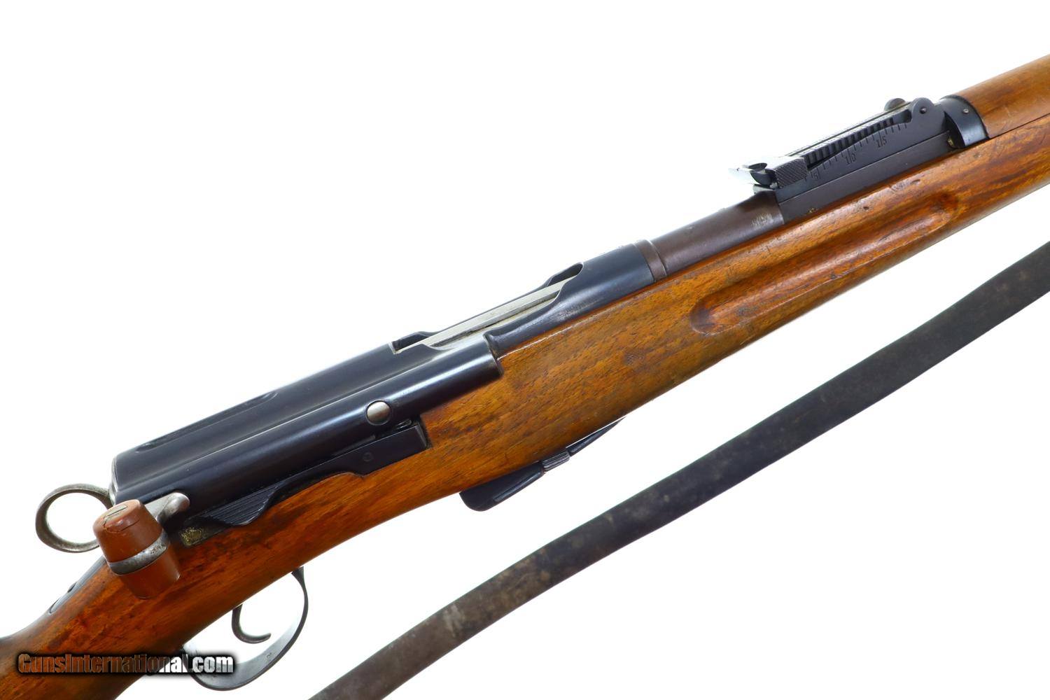 Description: Standard configuration and matching 1911 rifle, caliber 7.5x55, with barrel length 30.7'/overall length 51.5'/6-shot detachable magazine, made 1912 to 1919, total production estimated at 127,000, with tangent rear sight graduated 1-15, straight pull bolt, detachable magazine, brass muzzle cap and metal buttplate. The left side of receiver is marked P. 7382, the same number repeated on the barrel, bolt, and bottom of the magazine. Competion sticker near muzzle dated 1951. Ownership marking on reciever as imaged. Walnut stock. Metal buttplate. Leather sling. Synopsis: Bern, 1911, Swiss Military Rifle, P7382, I-1149 Condition: VG+ arsenal reblue with fading and handling marks as photographed. Dull bore with sharp rifling. Perfect manual mechanics. A classic and early Swiss military rifle. ~~Insured shipping fee of $75; most packages shipped using FedEx 2nd Day.~~ SOLD Curio/Relic: Yes Manufacturer: Bern Serial Number: P7382 Caliber Info: 7.5x55 |