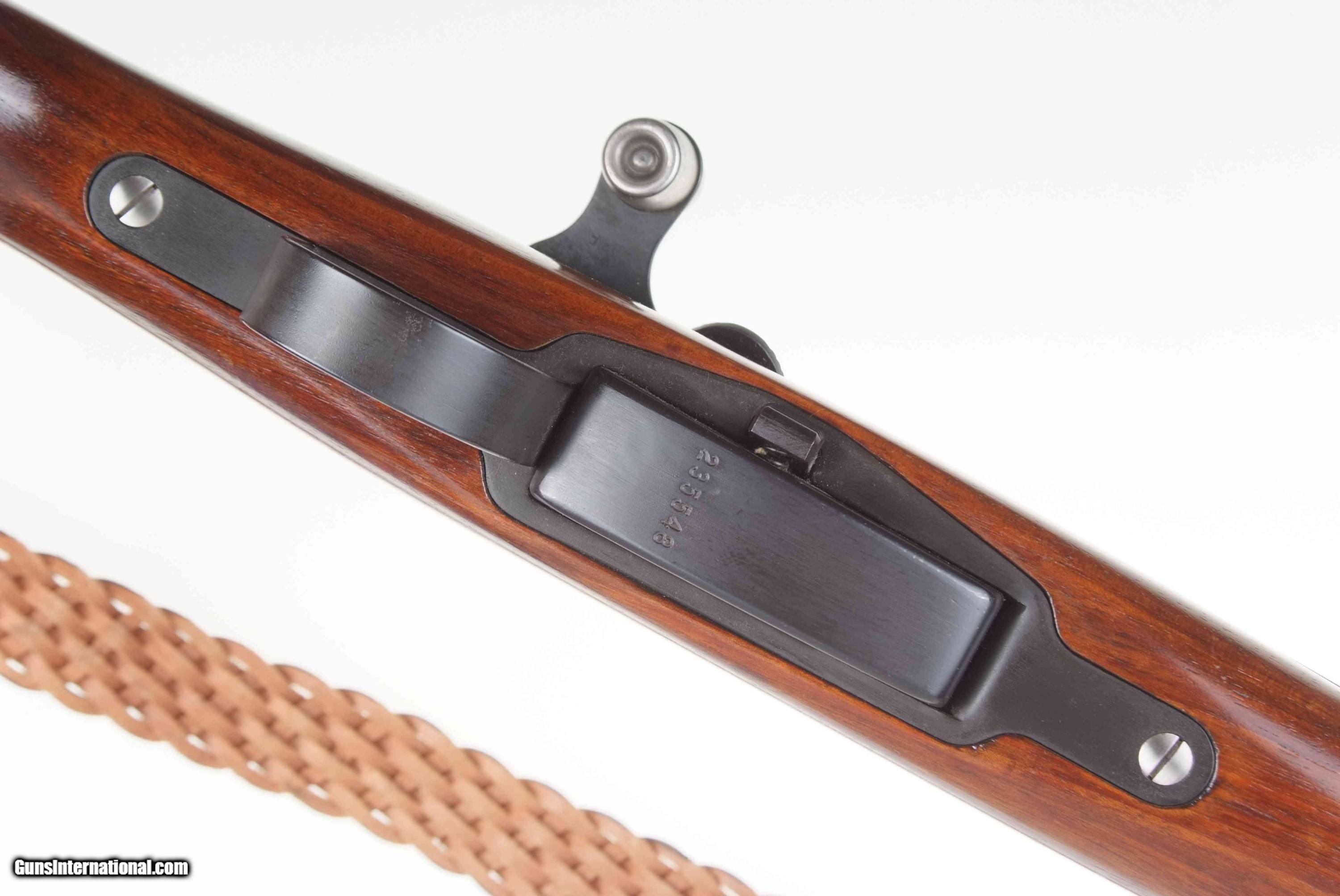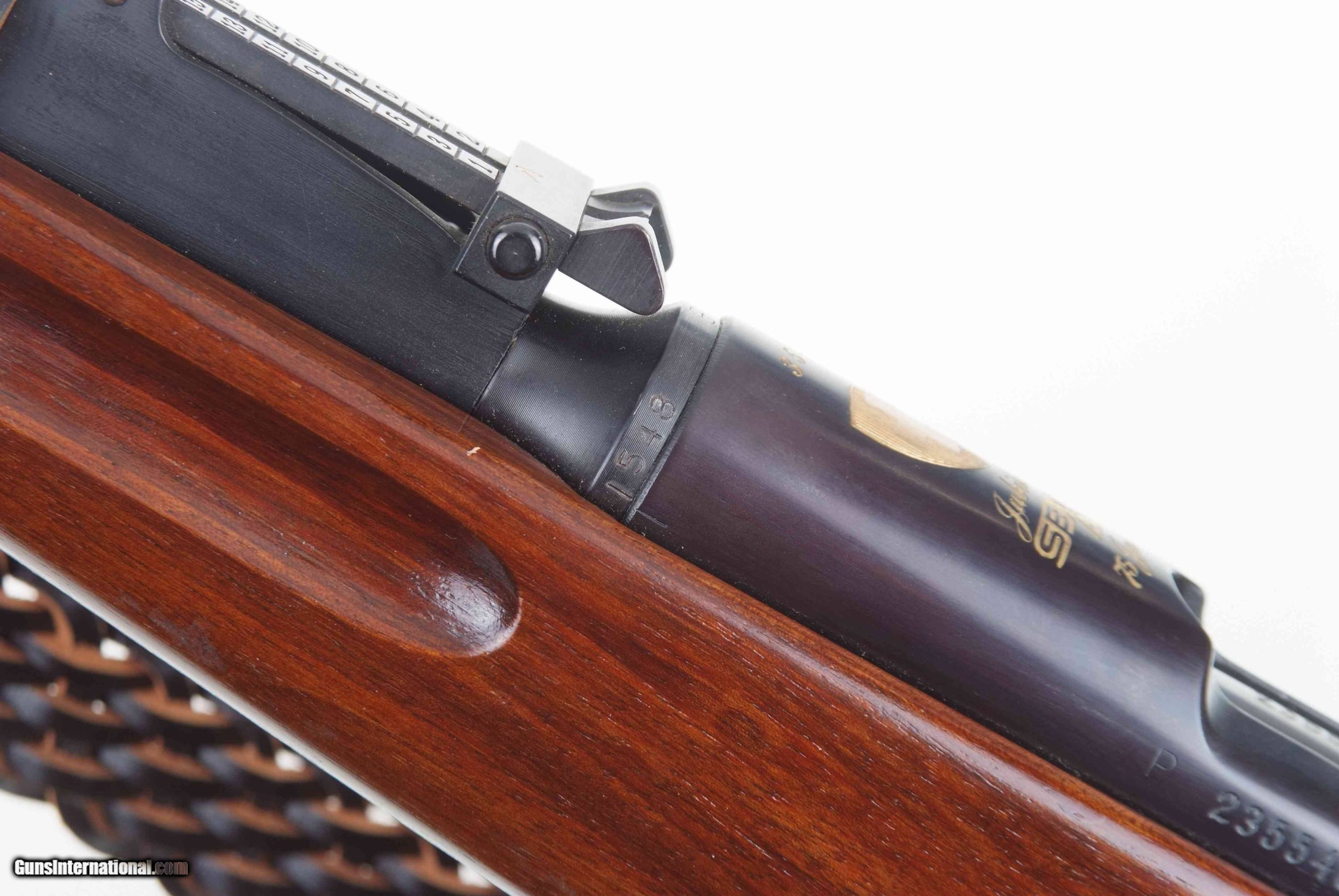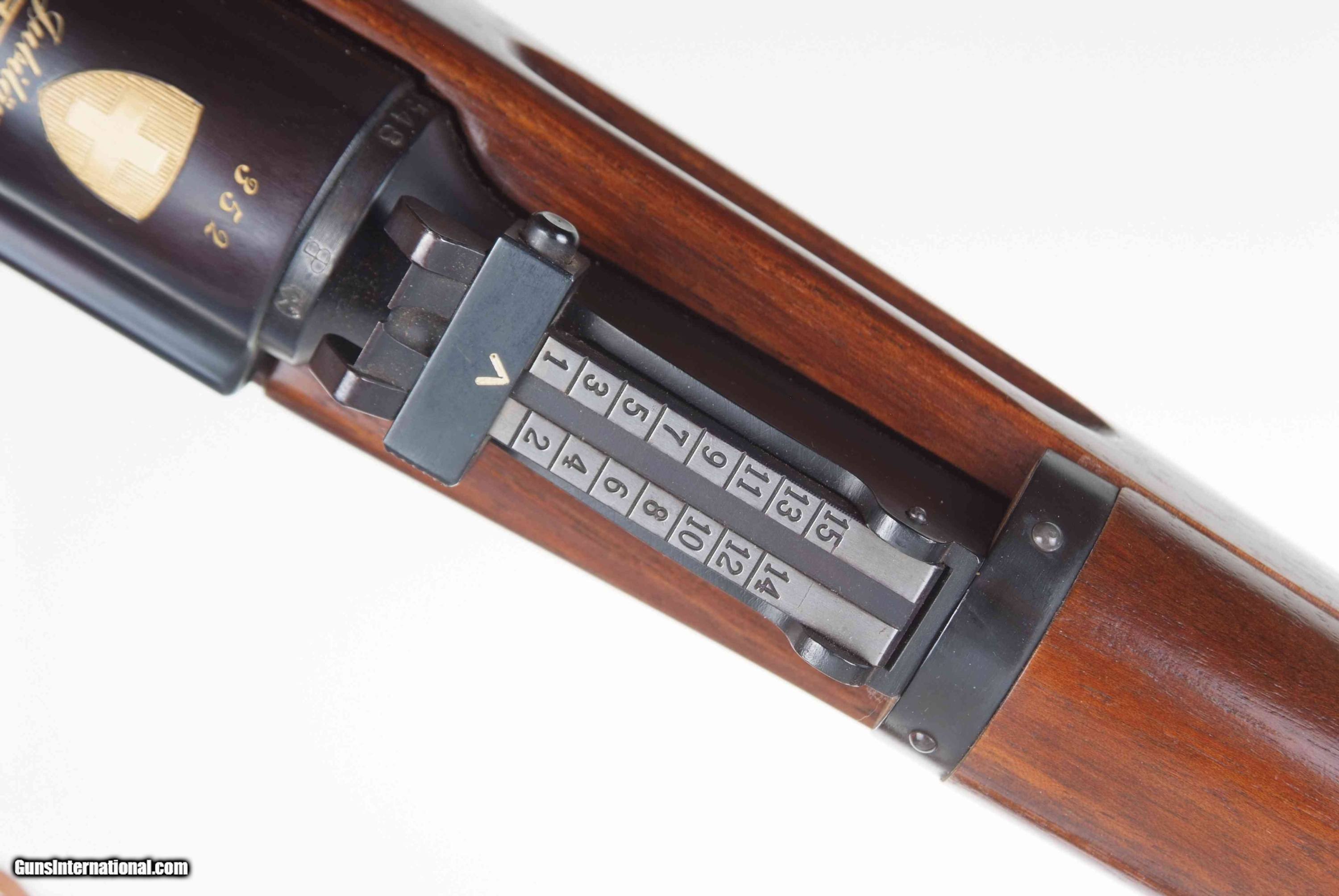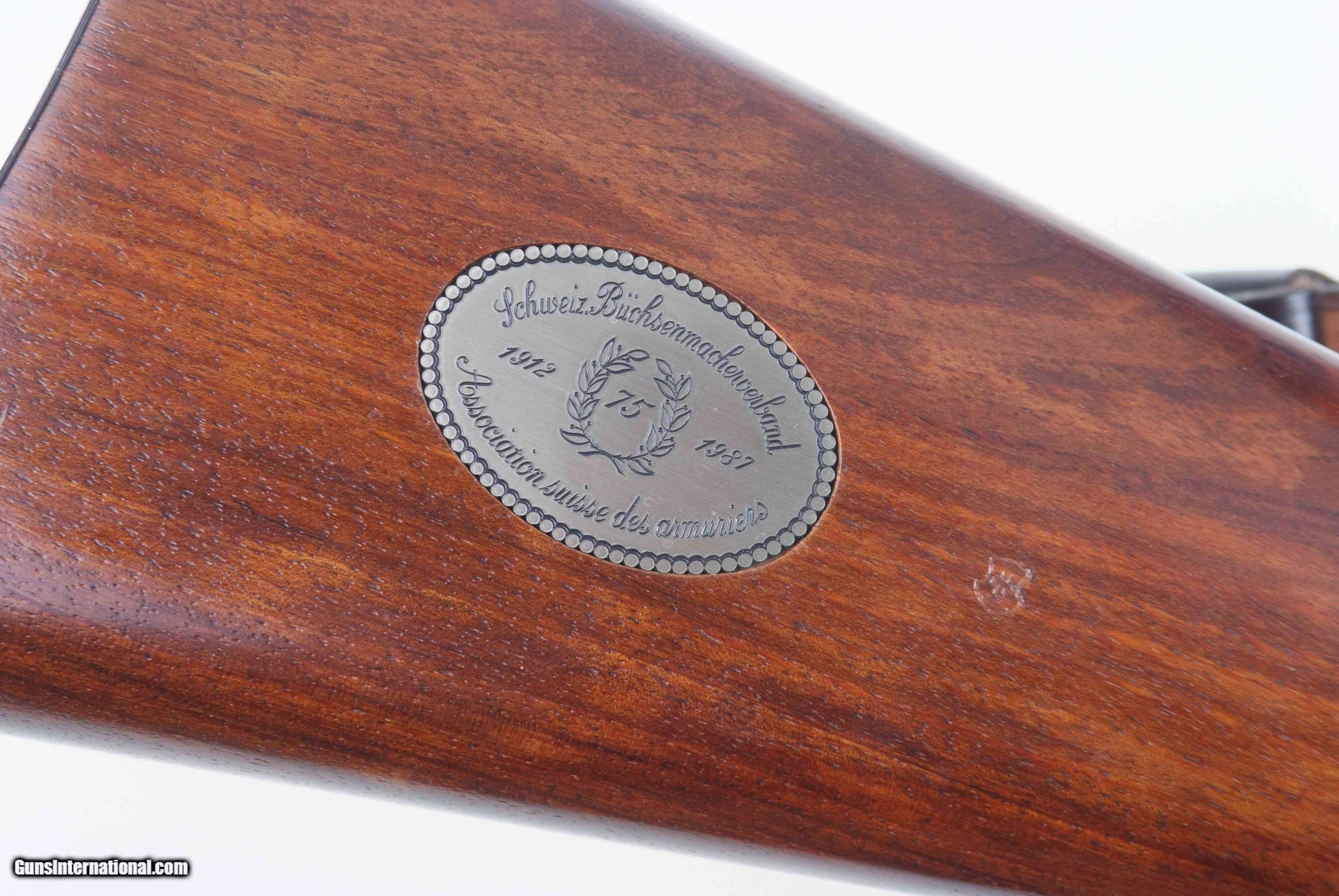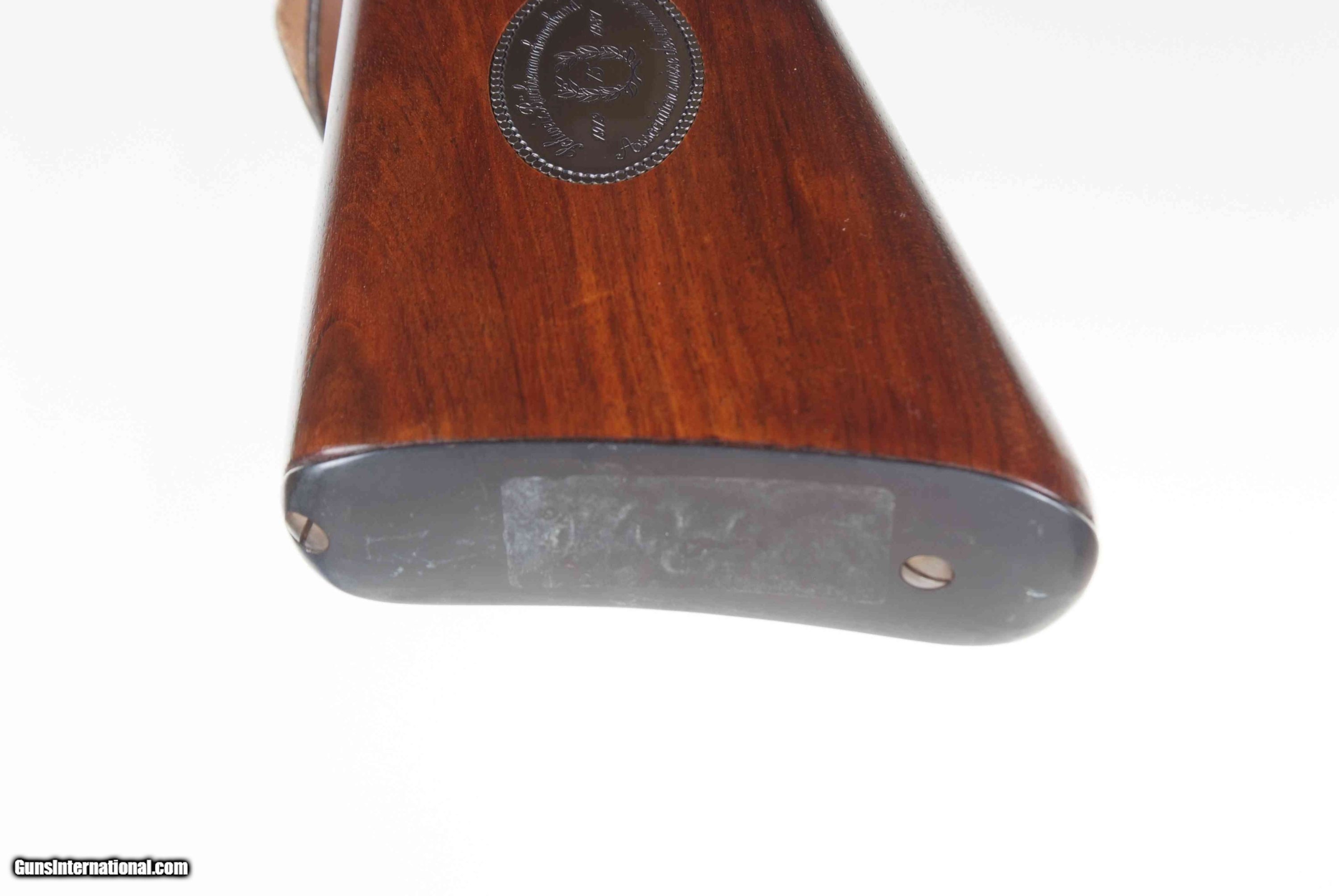 Description: This very scarce K31, numbered as a commercial firearm as reflected by the “P” serial number prefix, was one of just 500 pieces made to commemorate 75 years of the Swiss Arms Makers Association, from 1912-1987. Standard configuration straight pull carbine with 1-15 rear sight, matching barrel and magazine. Chamber embellished with gold inlaid “352” along with Swiss Cross in Shield over chamber surmounting “Jubilaum/SBV ASA/75 Jahre”. Special gold plaque inset into the right side of buttstock referencing 75th year commemorative, adjacent military inspection marking. Blued steel and brass muzzle cap with Swiss Cross. Factory braided sling as usually attached to the higher grade commemoratives. A fabulous and super-impressive K31 commemorative, sure to please any collector of Swiss arms. Synopsis: Swiss K31, 75th year, Jubilee Commemorative, Swiss Armorers Association, with gold inlaid Swiss Cross in Shield over chamber and 75th year plaque in buttstock, in near new condition with sling. MATCHES THE 50TH YEAR ANNIVERSARY, A-1416, OFFERED SEPARATELY. Condition: Rifle is excellent-near new with only a few small handling marks and a very small chip near the toe, adjacent to buttplate, as photographed. If you want a fantastic, K31 with a super-impressive factory gold crest on the chamber, a little different from most commemoratives, that matches a 50th aniversary rifle, this is your chance! this is your chance! ~~Insured shipping fee of $105; most packages shipped using FedEx 2nd Day.~~ SOLD Curio/Relic: Yes Manufacturer: Bern Serial Number: P235548 Caliber Info: 7.5x55 |