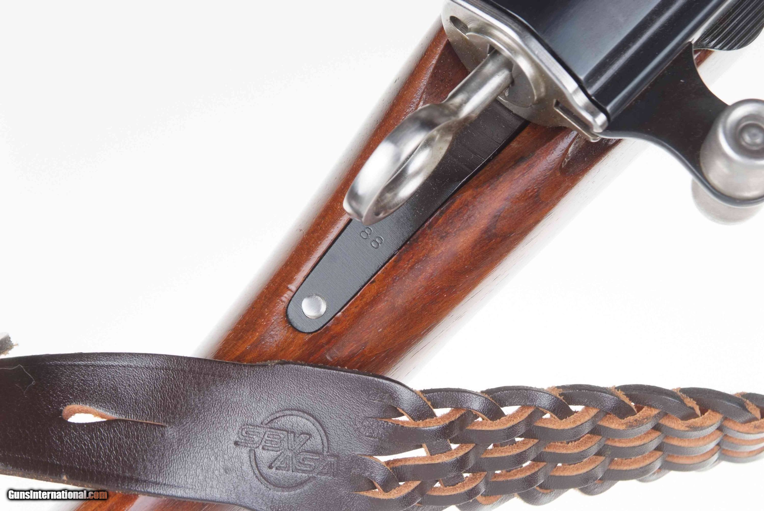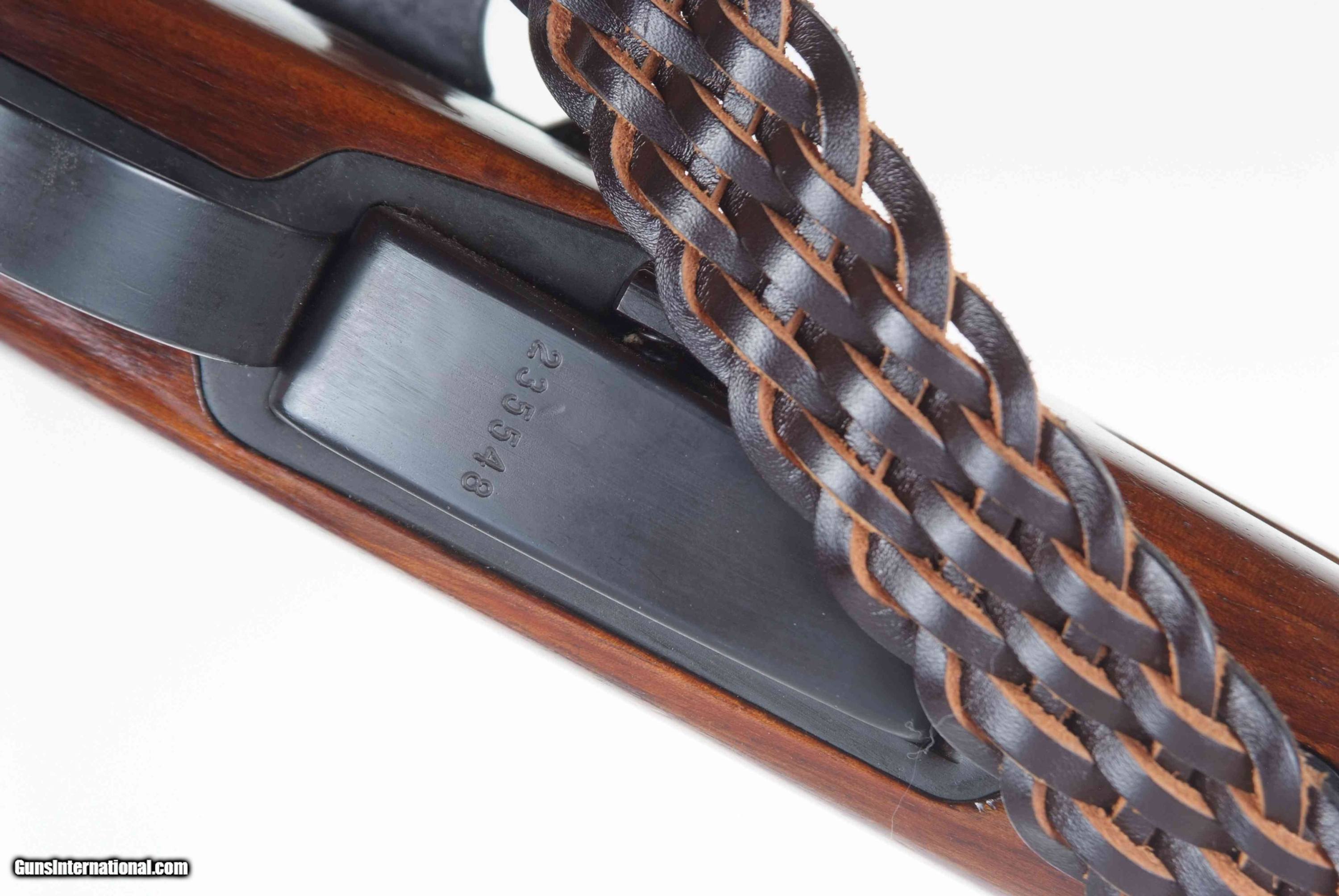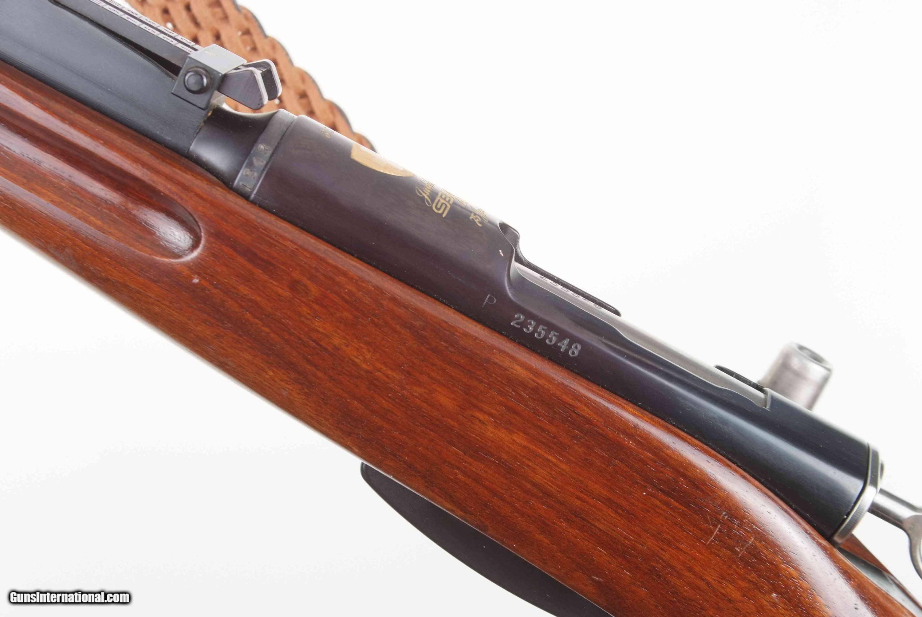 This very scarce K31, numbered as a commercial firearm as reflected by the “P” serial number prefix, was one of just 500 pieces made to commemorate 75 years of the Swiss Arms Makers Association, from 1912-1987. Standard configuration straight pull carbine with 1-15 rear sight, matching barrel and magazine. Chamber embellished with gold inlaid “352” along with Swiss Cross in Shield over chamber surmounting “Jubilaum/SBV ASA/75 Jahre”. Special gold plaque inset into the right side of buttstock referencing 75th year commemorative, adjacent military inspection marking. Blued steel and brass muzzle cap with Swiss Cross. Factory braided sling as usually attached to the higher grade commemoratives. A fabulous and super-impressive K31 commemorative, sure to please any collector of Swiss arms.