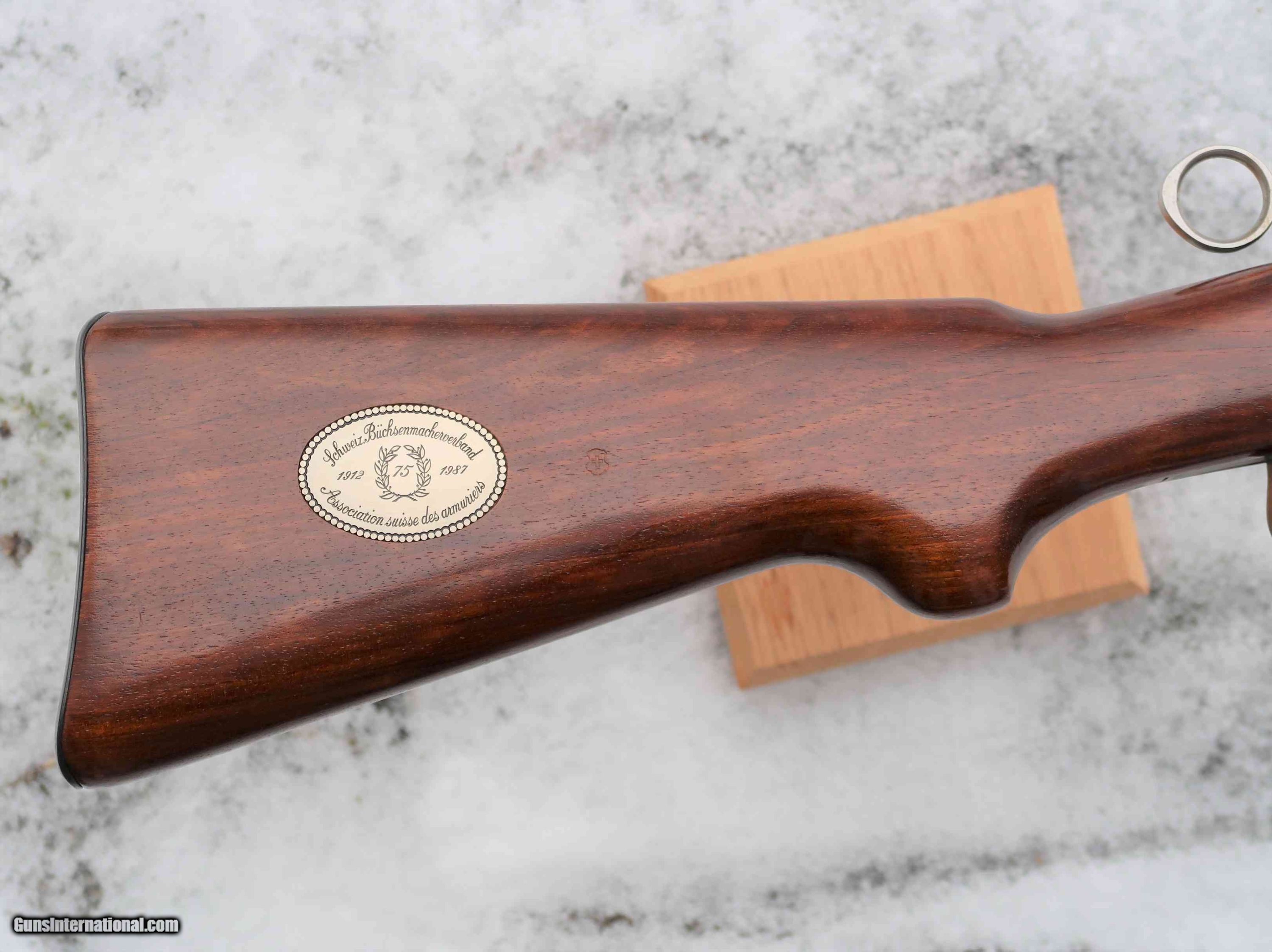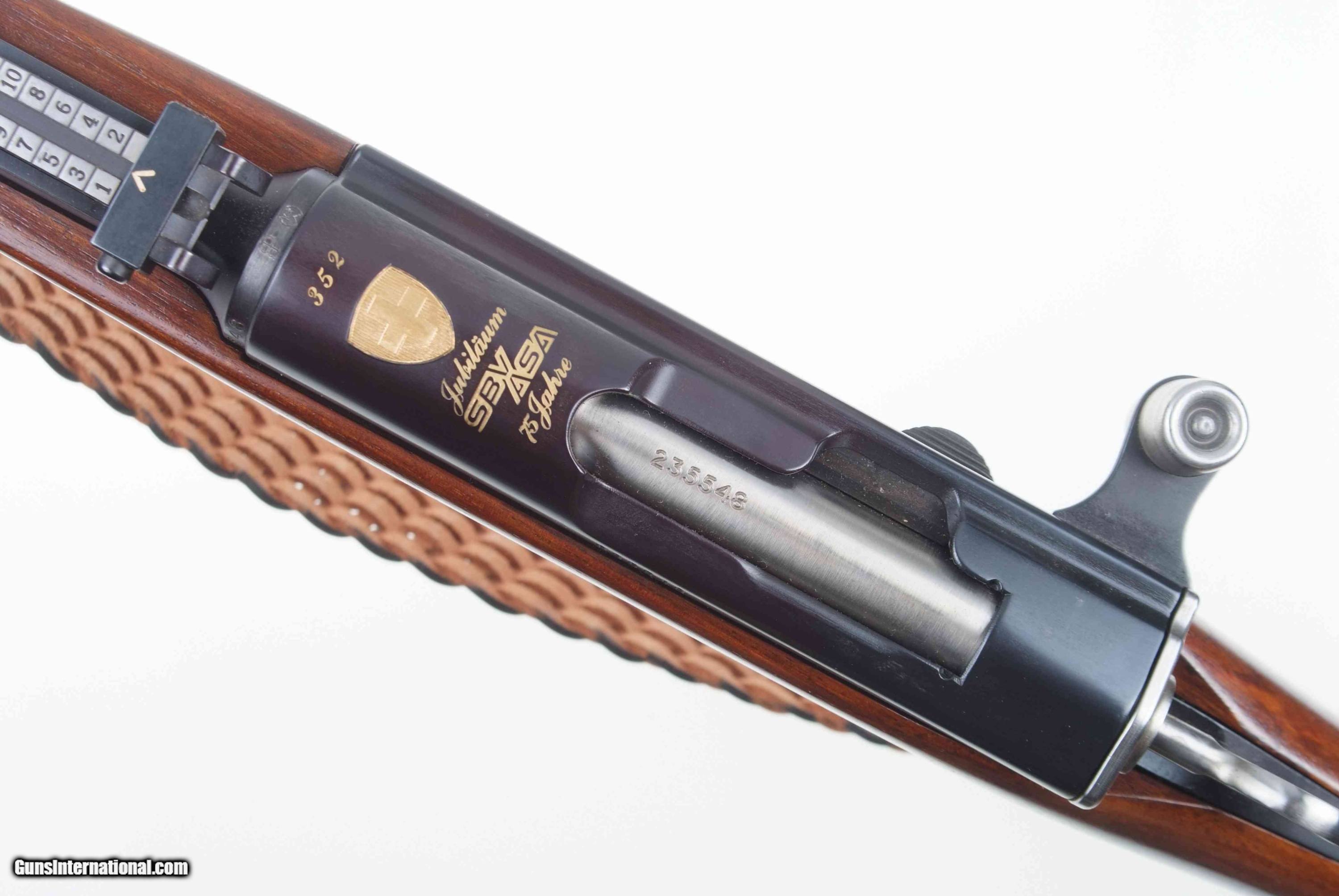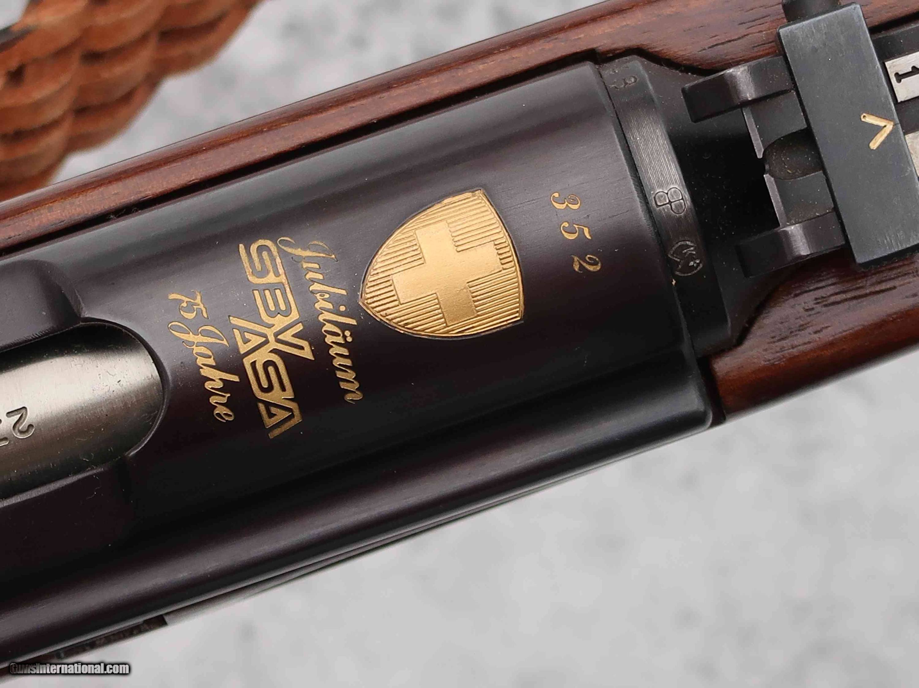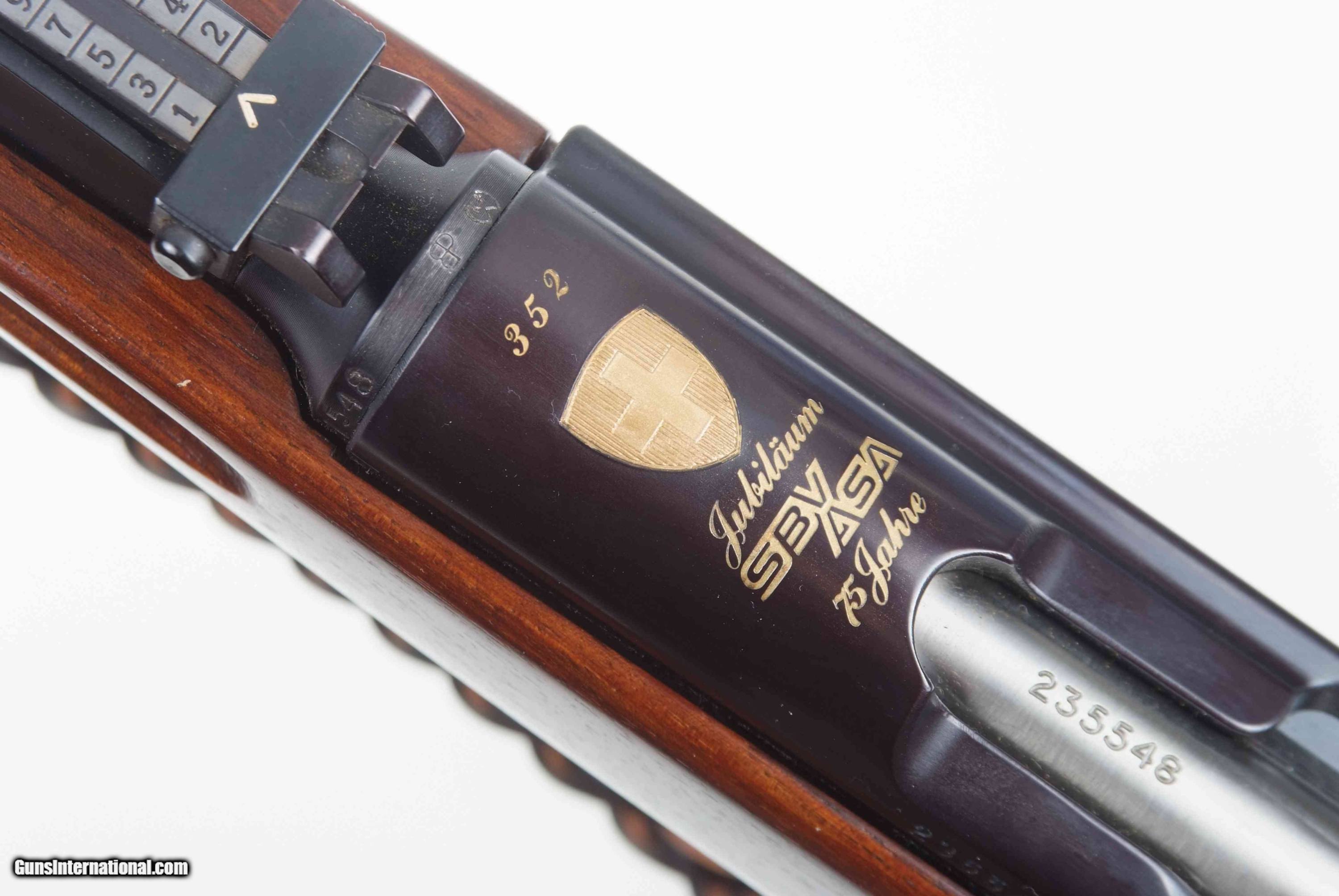Swiss K31, 75th year, Jubilee Commemorative, Swiss Armorers Association, with gold inlaid Swiss Cross in Shield over chamber and 75th year plaque in buttstock, in near new condition with sling. MATCHES THE 50TH YEAR ANNIVERSARY, A-1416, OFFERED SEPARATELY.