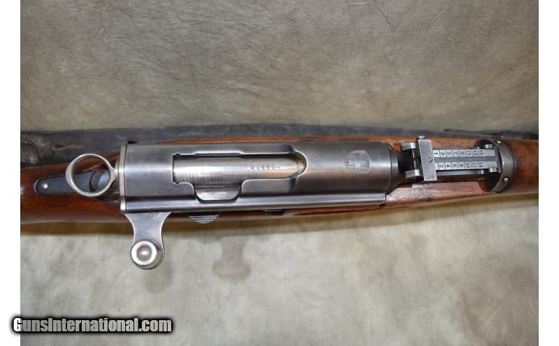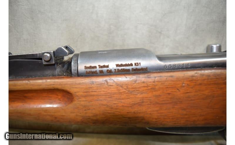 Description: Switzerland manufacture Waffenfabrik Bren model K31 is a straight pull bolt action rifle chambered in 7.5x55mm Swiss. The K31 is in 90% overall condition and is all matching. Does have the shield and + stamped on the buttstock. The K31 can hold 6 rounds and has a 24" barrel length. 7.5x55mm Swiss SOLD Curio/Relic: Yes Metal Condition: 90% or Better Wood Condition: 95% or Better Bore Condition: 90% or Better Barrels: 24 Butt Pad: Metal Butt Pad Weight: 7 lb Sights: Adjustable rear and front post Item Location: Chesterfield, MI |