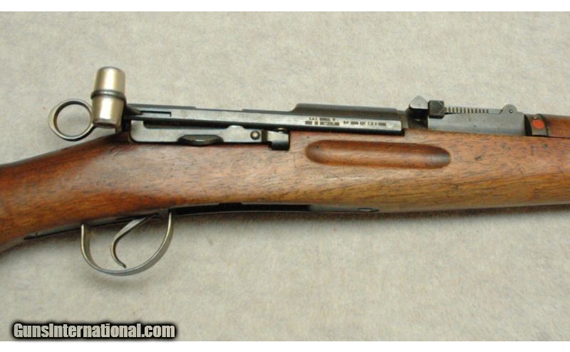 Description: he Schmidt Rubin Model 1889/96 was the replacement for the 1889. The biggest change was moving the locking lugs from the rear of the bolt sleeve to the front of the bolt sleeve. This allowed the receiver to be shortened by a small amount. In addition the change allowed the bolt and receiver to handle more pressure. When the cartridge was modified in 1908 to increase the velocity of the bullet the 1896 bolt system was used. Almost all the model 89/96 rifles were converted to 96/11. Only a few remain in the original configuration and almost all of those are private series rifles that were never military issue. SOLD Curio/Relic: Yes Caliber Info: 7.5×55mm. Chambers: Bolt action. Metal Condition: Very good, some battle wear, small nicks & small scratches. Wood Condition: Stock is in very good condition. Bore Condition: Bright. Barrels: 26" Barrel. Triggers: Standard military trigger. Stock: Original type wood stock. Stock Dimensions: 13 1/2" LOP. Fore End: Wood handguards. Butt Pad: Metal butt plate. Weight: 8 Lbs 8 ozs. Sights: Adjustable military iron sights. Extras: With one mag. Item Location: La Vista, NE |