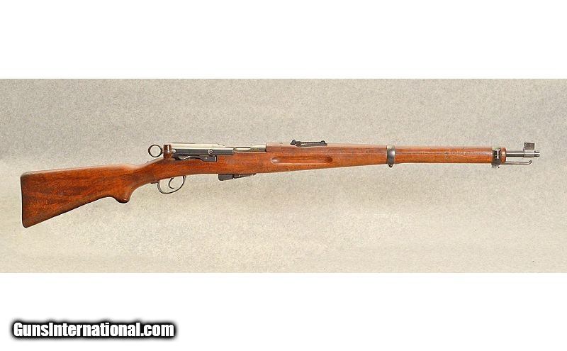 Description: Waffenfabrik Bern K11 — the Schmidt Rubin Model 1889/96 was the replacement for the 1889. The biggest change was moving the locking lugs from the rear of the bolt sleeve to the front of the bolt sleeve. This allowed the receiver to be shortened by a small amount. In addition, the change allowed the bolt and receiver to handle more pressure. Production of the K11 included conversion of the model 1900 and 1905 short rifles to the newer specifications of the carbine. When the cartridge was modified in 1908 to increase the velocity of the bullet the 1896 bolt system was used. Almost all the model 89/96 rifles were converted to 96/11. Only a few remain in the original configuration and almost all of those are private series rifles that were never military issue. This rifle has matching number on receiver, bolt, magazine, front sight and trigger guard. 7.5x55mm Swiss SOLD Chambers: 6-round magazine Metal Condition: Good — Very Good Wood Condition: Good Bore Condition: Very Good Barrels: 23 Triggers: Two-Stage military trigger Stock Dimensions: 12 1/2" LOP Fore End: Wood Hand guards Butt Pad: Metal butt plate Sights: "Tangent rear sight, protected and wind adjustable blade front sight Item Location: Garner, NC |
