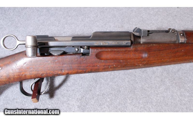 Description: This Waffenfabrik Model K31 Swiss Karabiner is a straight pull bolt action rifle in 7.5x55mm Swiss Cal. It has a 25.7 inch barrel with adjustable front and middle iron sights. The stock is a smooth hardwood pistol grip. It has a two stage trigger. It was the standard issue rifle of the Swiss armed forces from 1933 until 1958. This rifle shows some dings, dents and field wear. This rifle makes a great recreational shooting gun for target matches. SOLD Curio/Relic: Yes Caliber Info: 7.5x55mm Swiss Chambers: Bolt Action 6+1 detachable magazine Metal Condition: Good For it's age Wood Condition: Fair, Normal usage and handling marks. Dents & Dings Bore Condition: Bright and shiny, with good rifling. Barrels: 25.7 inches with sights Triggers: Two stage Stock Dimensions: 12.5" Lop Fore End: Smooth two piece hardwood with finger grooves and two bands Butt Pad: Smooth steel butt plate. Weight: 8.75 Lbs. Sights: Adjustable blade front with protective sides. Adjustable Tangent rear Extras: 1 Mag Item Location: Rapid City, SD |