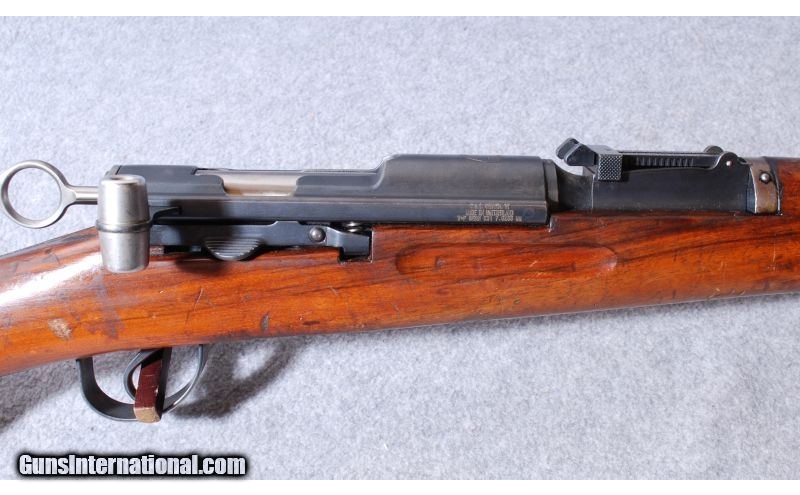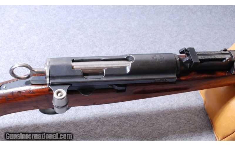 Description: This Waffenfabrik Model K31 Swiss Karabiner is a straight pull bolt action rifle in 7.5x55mm Swiss Cal. It has a 25.7 inch barrel with adjustable front and middle iron sights. The stock is a smooth hardwood pistol grip. It has a two stage trigger. It was the standard issue rifle of the Swiss armed forces from 1933 until 1958. This rifle shows some dings, dents and field wear. This rifle makes a great recreational shooting gun for target matches. SOLD Caliber Info: 7.5x55mm Swiss Chambers: Bolt Action 6+1 detachable magazine Metal Condition: Good For it's age Wood Condition: Good, Numerous scratches and dents but not out of the ordinary. None are severe Bore Condition: Bright and shiny, with good rifling. Barrels: 24 Triggers: Factory Trigger Stock Dimensions: 12.5" Lop Fore End: Smooth two piece hardwood with finger grooves and two bands Butt Pad: Smooth steel butt plate. Weight: 8.5 Lbs Sights: Adjustable blade front with protective sides. Adjustable Tangent rear Extras: 1 Mag Item Location: Rapid City, SD |
