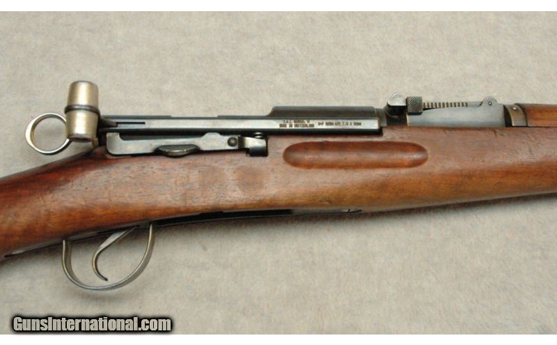 Description: The Karabiner Model 1931 (K31) is a magazine-fed, straight-pull bolt action rifle. It was the standard issue rifle of the Swiss armed forces from 1933 until 1958 though examples remained in service into the 1970s. It has a 6-round removable magazine, and is chambered for the 7.5×55mm Swiss Gewehrpatrone 1911 or GP 11, a cartridge with ballistic qualities similar to the 7.62×51mm NATO/.308 Winchester cartridge. Each rifle included a 6-round detachable box magazine with matching stamped serial number. A charger is used to load the magazine from the top of the receiver. The Karabiner Model 1931 replaced both the Model 1911 rifle and carbine and was gradually replaced by the Stgw 57 from 1958 onwards. SOLD Curio/Relic: Yes Caliber Info: 7.5×55mm. Chambers: Bolt action. Metal Condition: Very good, some battle wear, small nicks & small scratches. Wood Condition: Stock is in very good condition. Bore Condition: Bright. Barrels: 26" Barrel. Triggers: Standard military trigger. Stock: Original type stock. Stock Dimensions: 12 1/2" LOP. Fore End: Wood handguards. Butt Pad: Metal butt plate. Weight: 8 Lbs 8 ozs. Sights: Adjustable iron sights. Extras: With matching mag. Item Location: La Vista, NE |