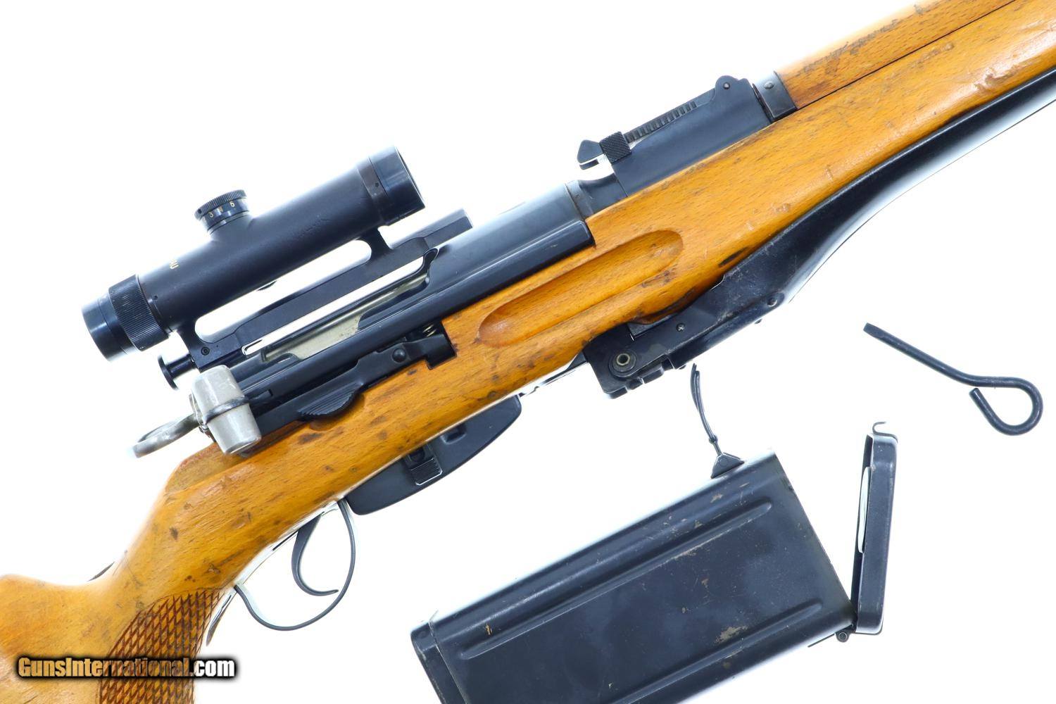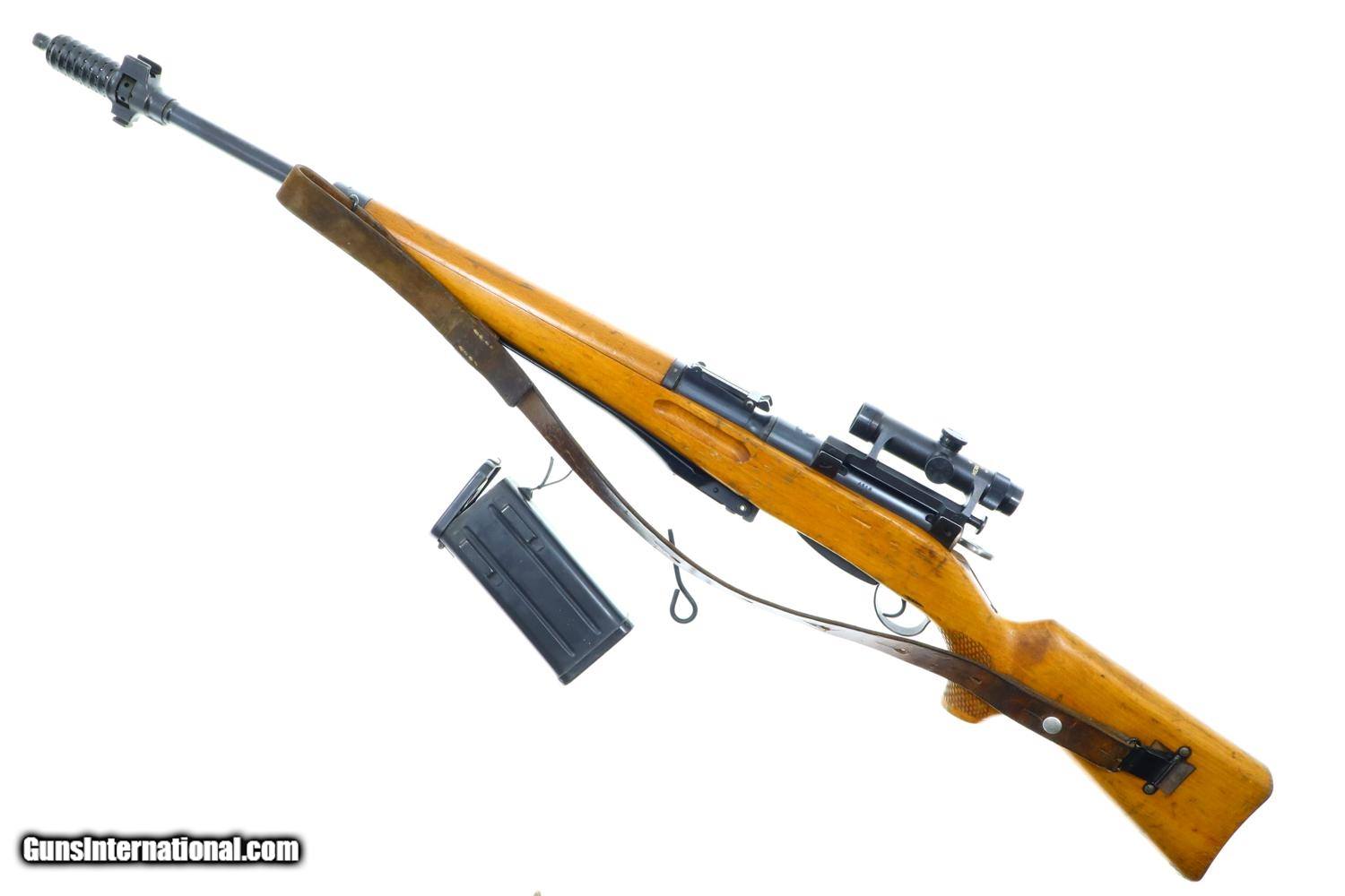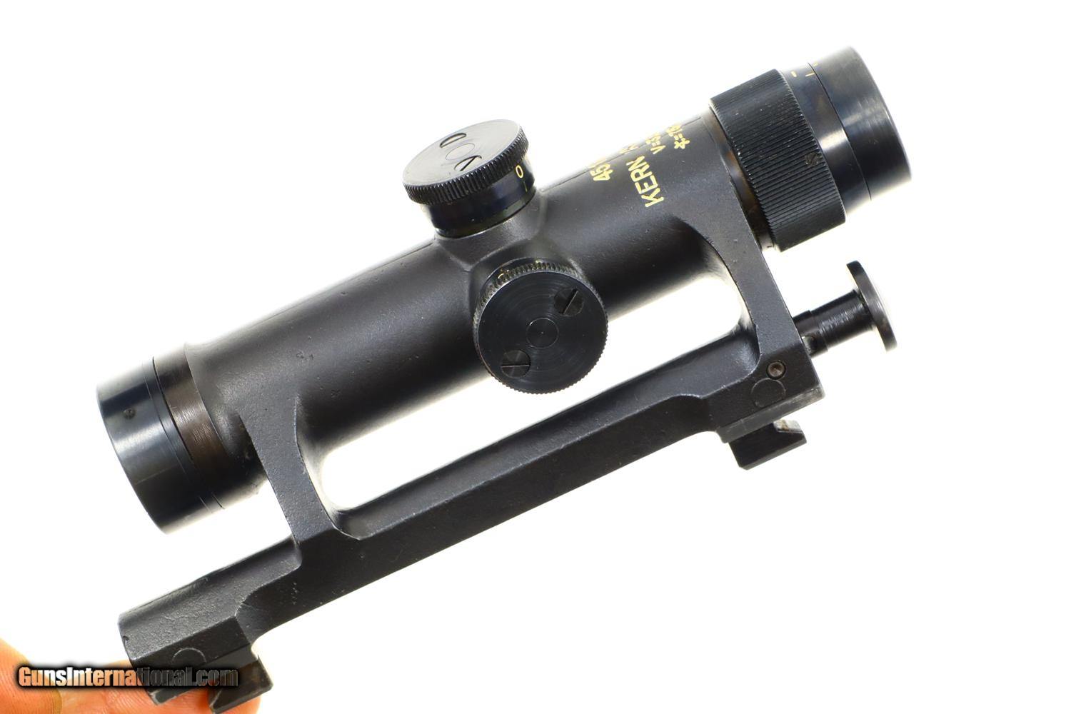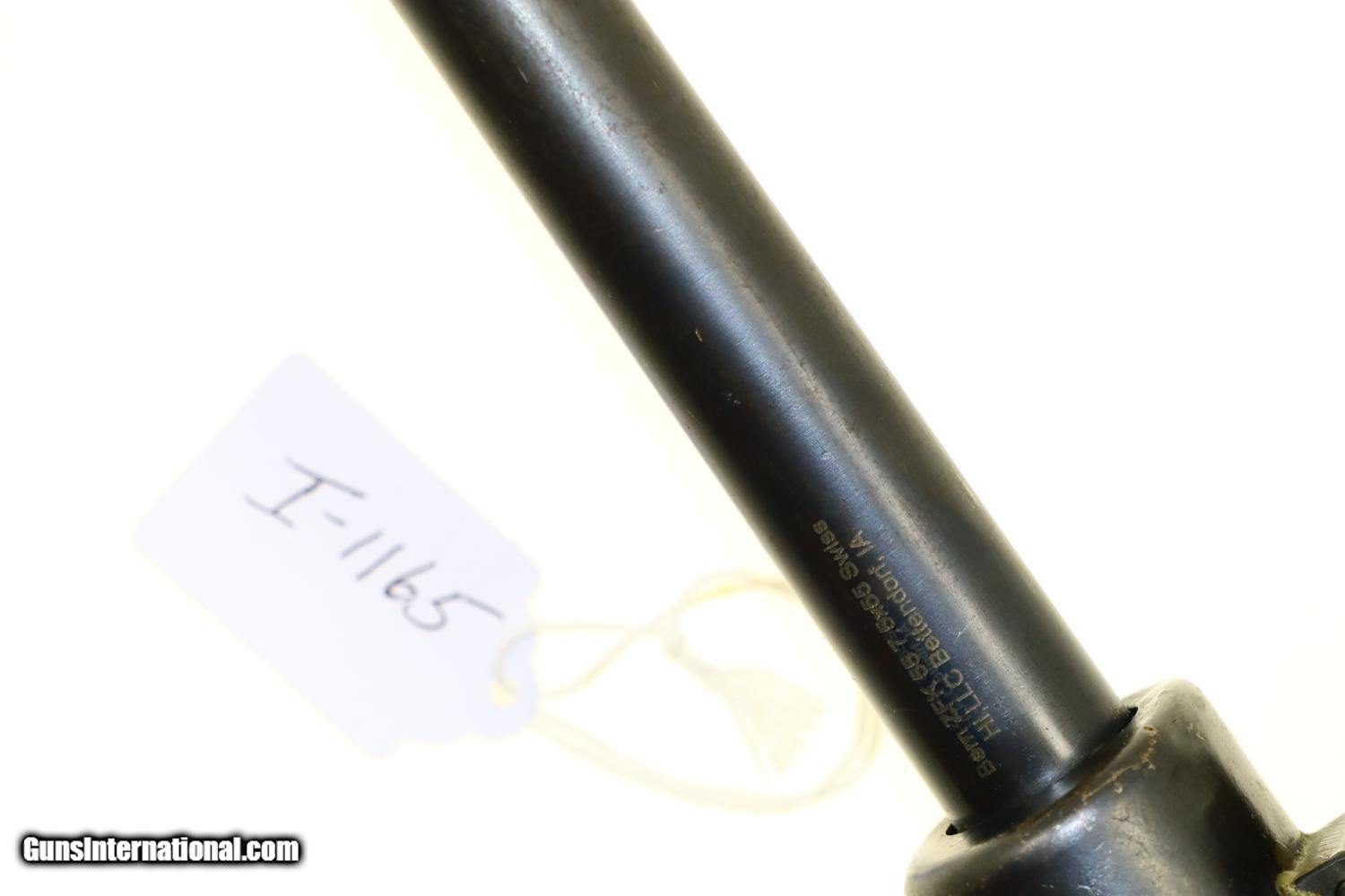 Description: Standard configuration ZFK 31/55, one of approximately 5000 such rifles, an evolution of the K31 /42 and K31/43 sniper rifles, this one with telescopic sights, heavy barrel, flash suppressor/muzzle brake, and center-mounted foldable bipod. In addition to the standard K31 rear sight calibrated from 1-15, these guns were fitted with a quick detachable 3.5 power Kern telescopic sight, with serial numbering on top surface, whose reticle includes a thick central post with two horizontal hairs. The receiver has a Swiss “cross over chamber” with full serial number on left receiver and bolt. Matching barrel, magazine, scope, scope can (that includes the screw driver). Correct sling dated 51. Synopsis: VG+ Swiss Bern ZFK 31/55 sniper rifle, fully matching, crisp optics, correct sling! Condition: VG+ rifle with 95-97% original rust blue, blonde stock with scattered handling marks, foldable bipod with usual scuffs through black painted finish. Comparable condition sling. Comparable condition scope and can, very bright and crisp optics. Near Mirror bore. Perfect Manual mechanics. An extremely attractive and fully matching ZFK 55 rifle, including scope and carrying can. ~~Insured shipping fee of $140; most packages shipped using FedEx 2nd Day.~~ SOLD Manufacturer: Bern Serial Number: 4518 Caliber Info: 7.5 x 55 |