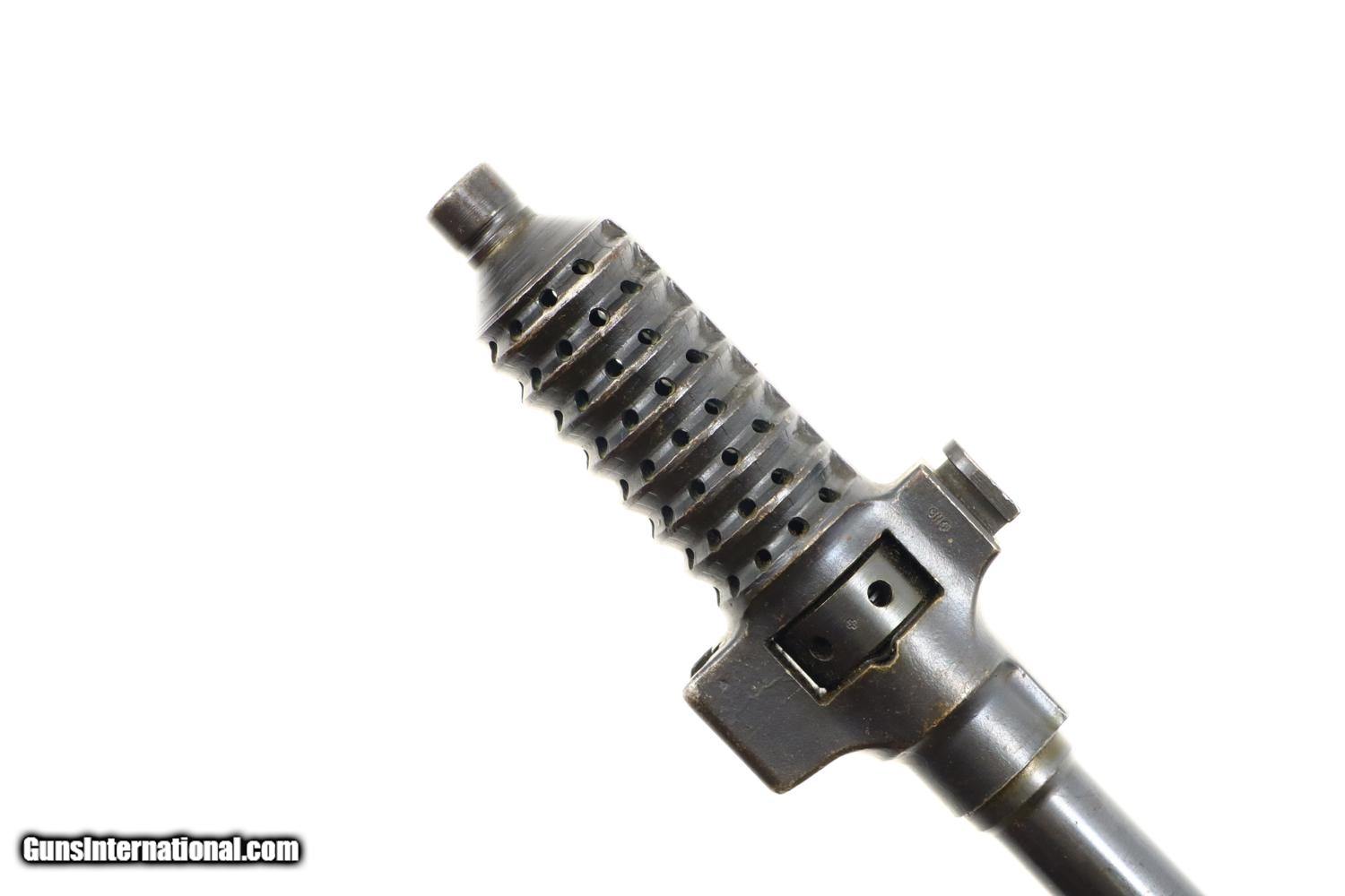 Description: Description: Standard configuration ZFK 31/55, one of approximately 5000 such rifles, an evolution of the K31 /42 and K31/43 sniper rifles, this one with telescopic sights, heavy barrel, flash suppressor/muzzle brake, and center-mounted foldable bipod. In addition to the standard K31 rear sight calibrated from 1-15, these guns were fitted with a quick detachable 3.5 power Kern telescopic sight, with serial numbering on top surface, whose reticle includes a thick central post with two horizontal hairs. The receiver has a Swiss “cross over chamber” with full serial number on left receiver and bolt. Matching barrel, magazine, scope, scope can (that includes the screw driver). Correct sling dated 51. Synopsis: VG+ Swiss Bern ZFK 31/55 sniper rifle, fully matching, crisp optics, correct sling! Condition: VG+ rifle with 95-97% original rust blue, blonde stock with scattered handling marks, foldable bipod with usual scuffs through black painted finish. Comparable condition sling. Comparable condition scope and can, very bright and crisp optics. Near Mirror bore. Perfect Manual mechanics. An extremely attractive and fully matching ZFK 55 rifle, including scope and carrying can. SOLD Manufacturer: Bern Serial Number: 4518 Caliber Info: 7.5 x 55 |