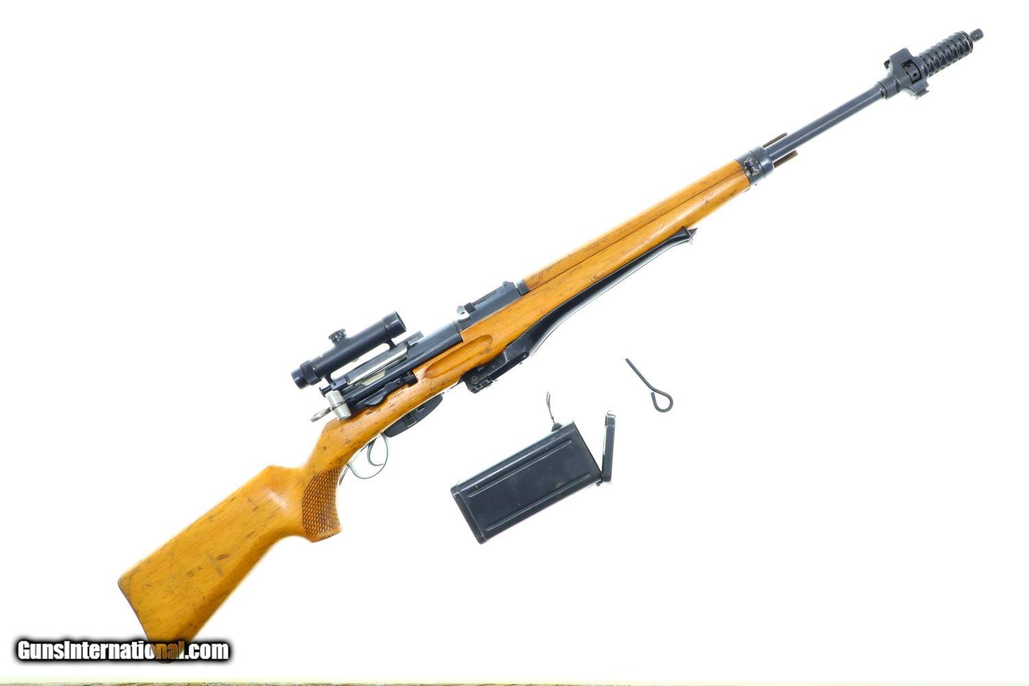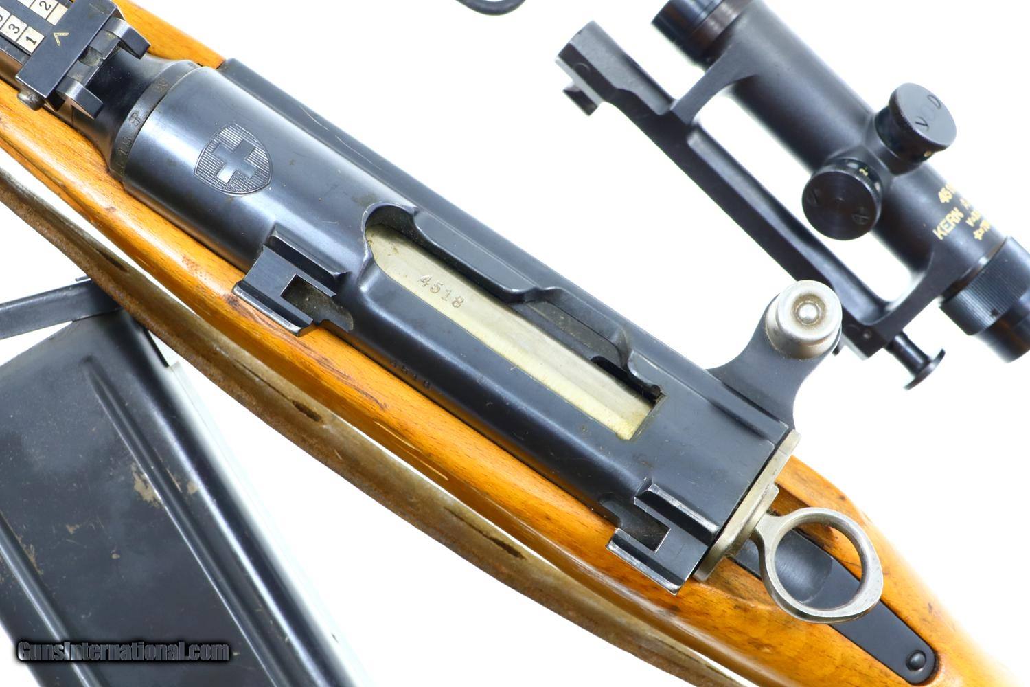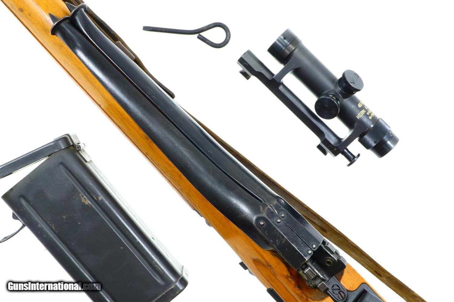 Standard configuration ZFK 31/55, one of approximately 5000 such rifles, an evolution of the K31 /42 and K31/43 sniper rifles, this one with telescopic sights, heavy barrel, flash suppressor/muzzle brake, and center-mounted foldable bipod. In addition to the standard K31 rear sight calibrated from 1-15, these guns were fitted with a quick detachable 3.5 power Kern telescopic sight, with serial numbering on top surface, whose reticle includes a thick central post with two horizontal hairs. The receiver has a Swiss “cross over chamber” with full serial number on left receiver and bolt. Matching barrel, magazine, scope, scope can (that includes the screw driver). Correct sling dated 51.