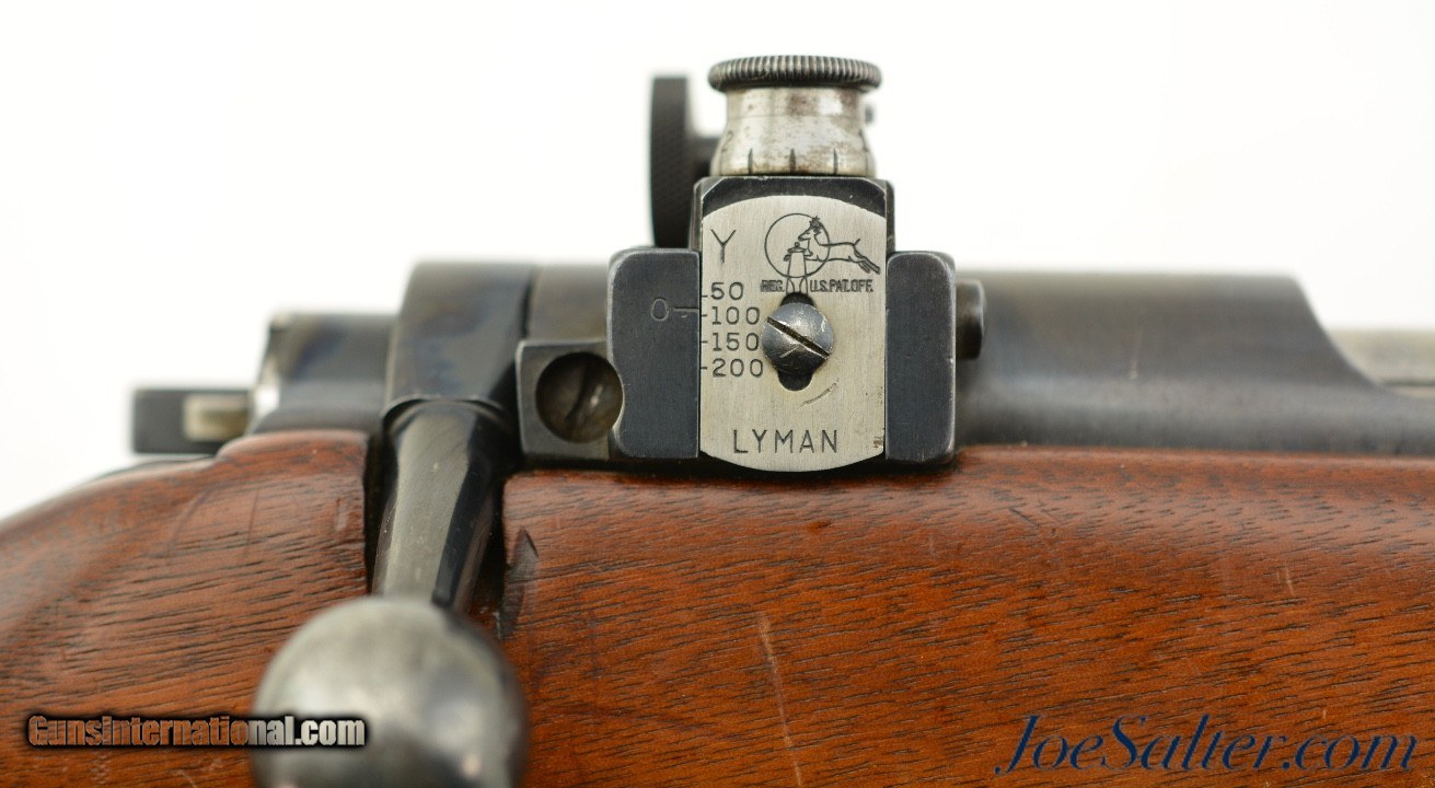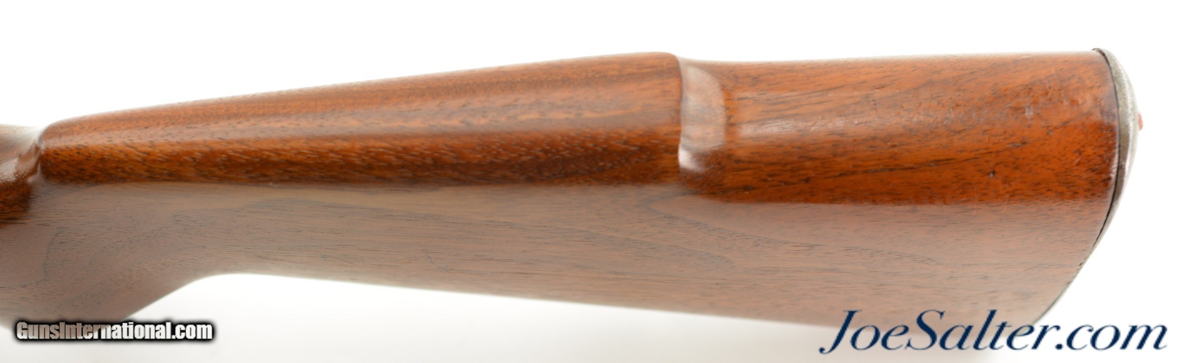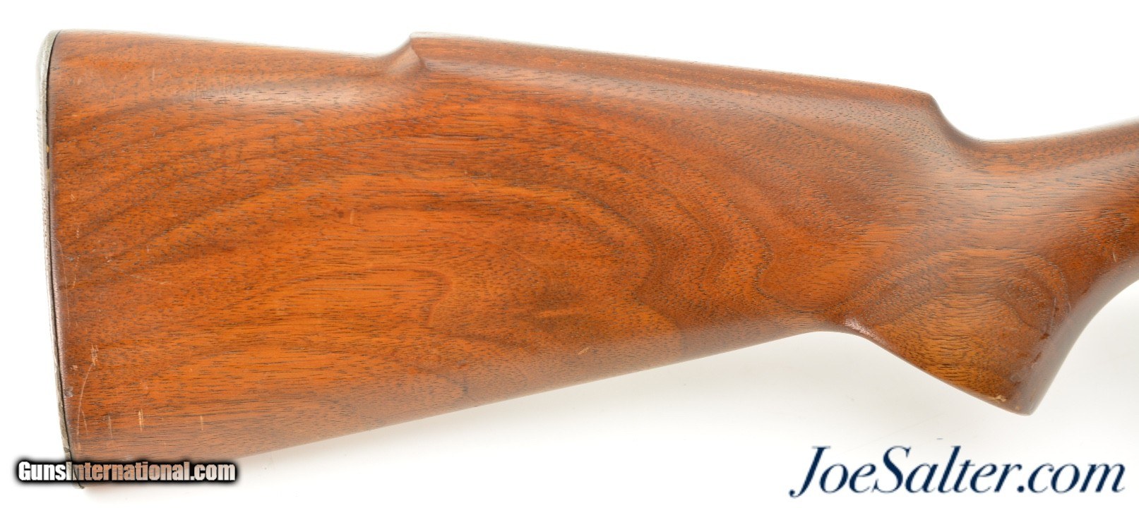 Description: Serial #22680, .22 LR, 25 ½ inch barrel with a bright, excellent bore. This is the Walther single shot "Sportmodell" target rifle that is Crown "N" nitro proofed manufactured in pre-war Germany featuring a heavy barrel and three position safety. In very good condition the barrel and action retain about 80-85% of a nicely done re-finished blue with scattered light use marks and scratches. The walnut stock is solid with light surface level scratches and contusions. It is sighted with a receiver mounted Lyman aperture peep sight and is drilled and tapped on the barrel for optics. The action functions properly and has a great trigger with light, crisp pull. A very well built Walther target rifle. FFL or C&R; Curio/Relic: Yes Price: $745.00 Contact Seller |