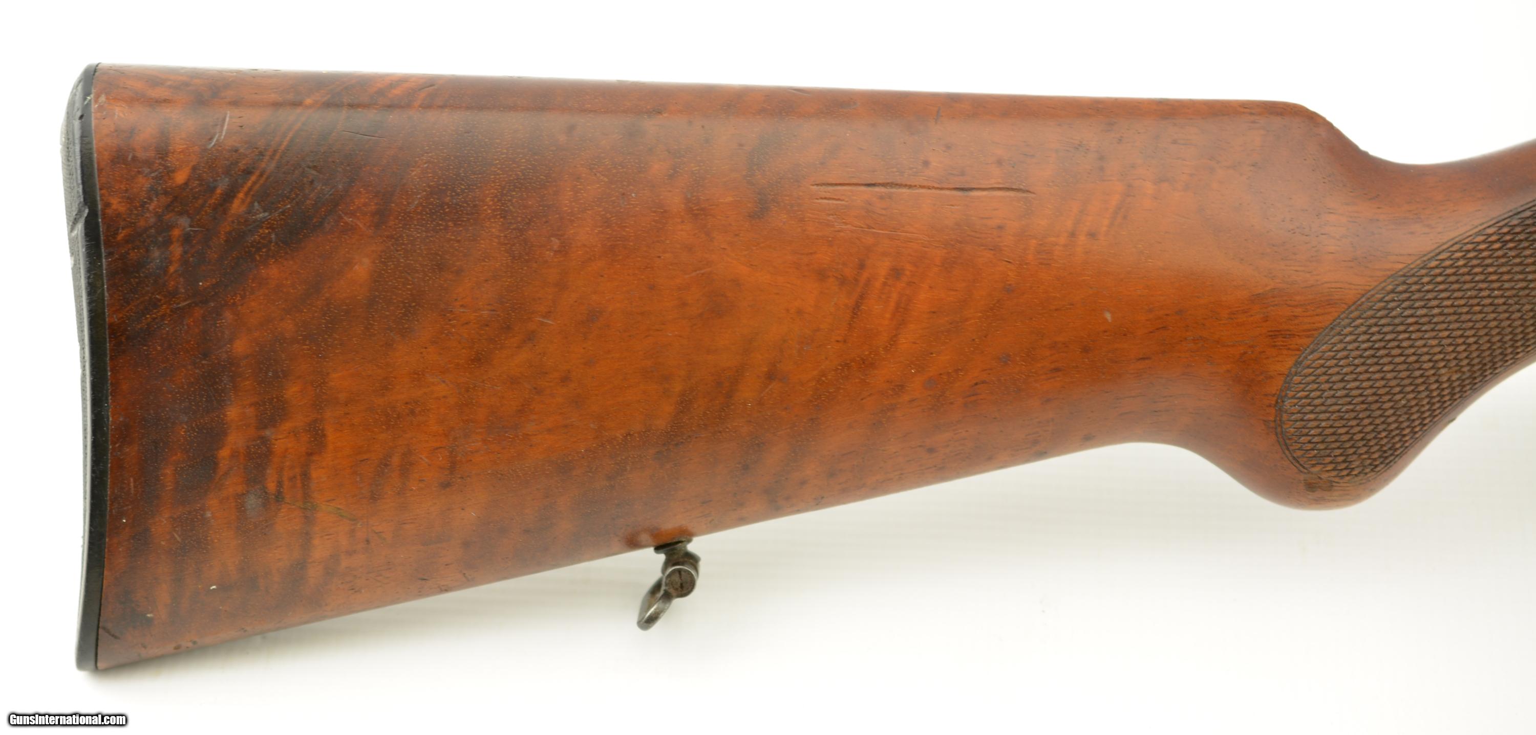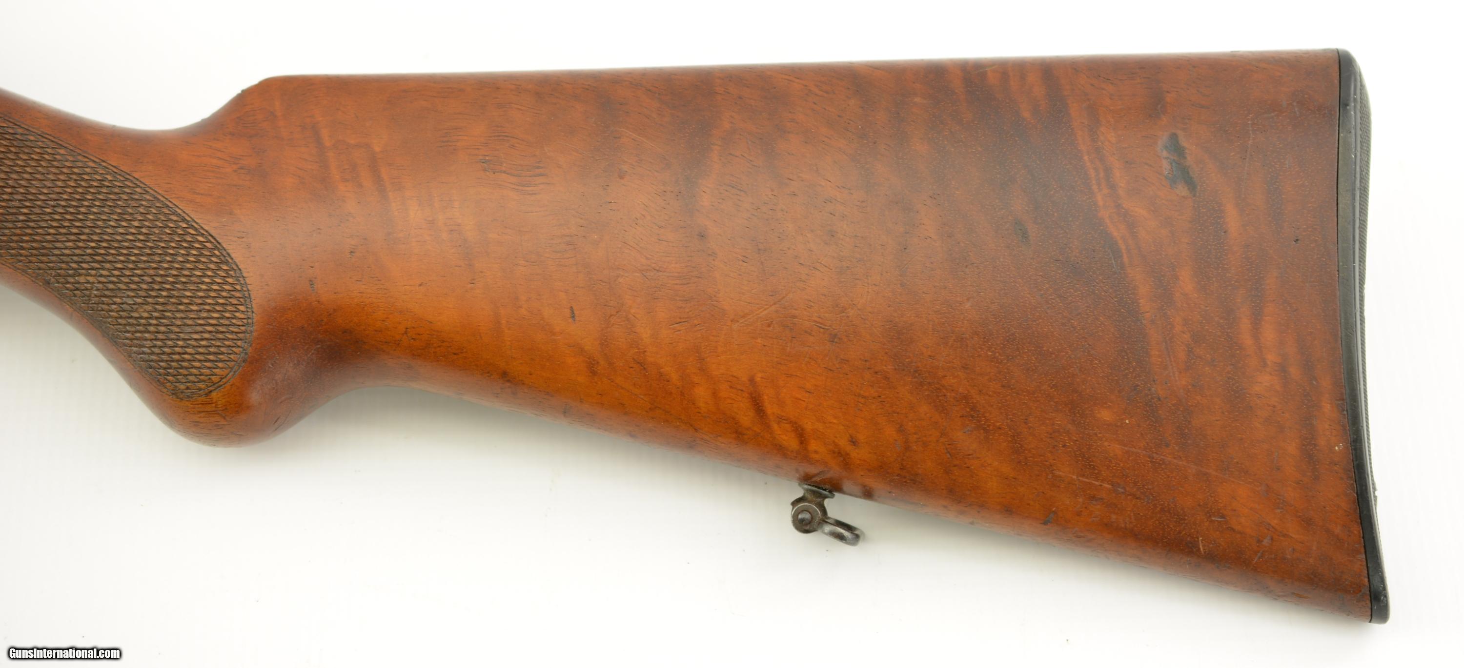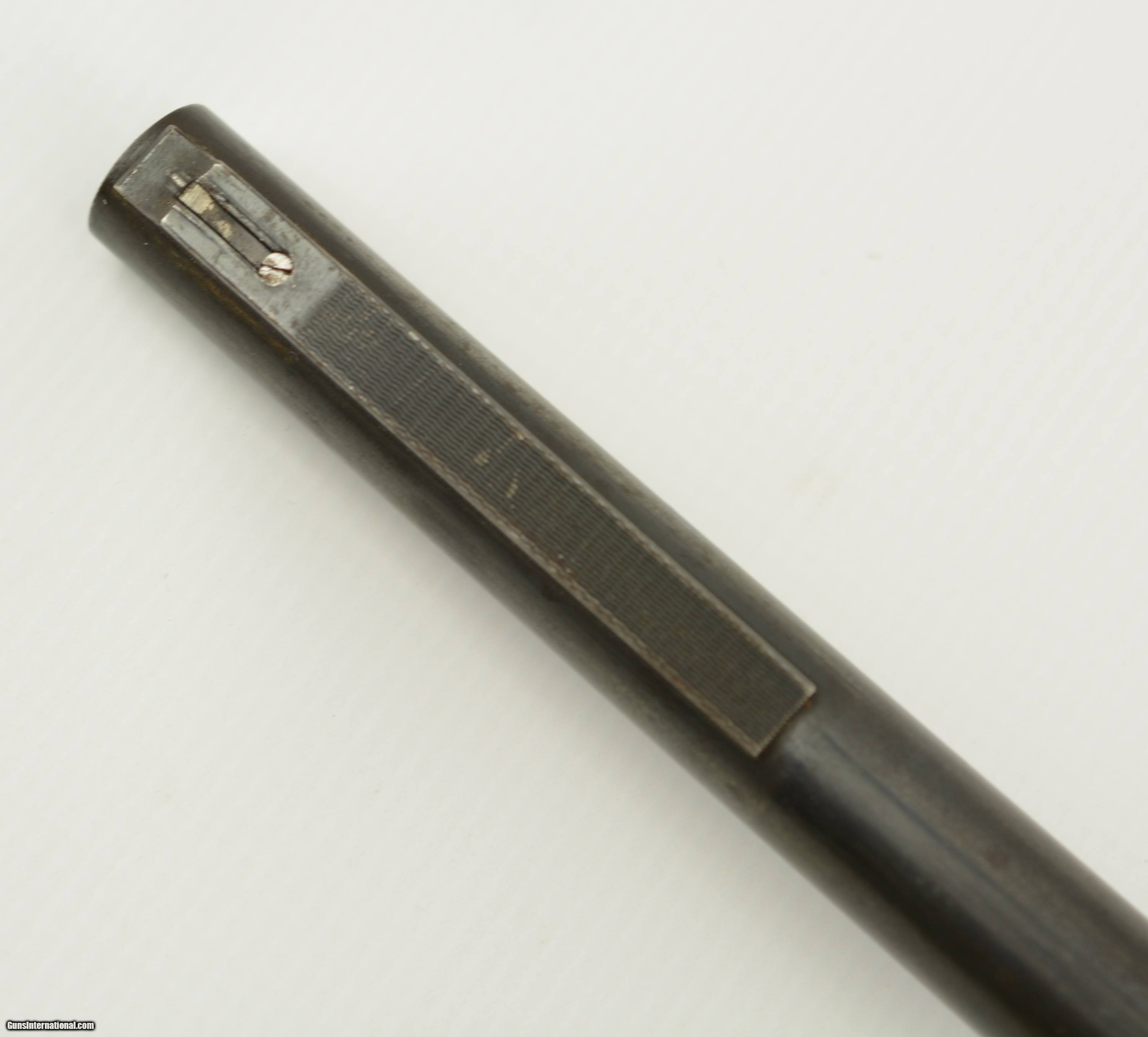 Description: Serial #27138, .22 LR, 25 1/2" barrel with an excellent, bright bore. This is a Zella-Mehlis produced, single-shot rifle, made circa-1956, with 70-75% of the original blue remaining on the barrel and receiver. There is some gray fading and silvering at the muzzle, as well as an area of mottled freckling along the top of the barrel just ahead of the rear tangent sight. The matching numbered bolt has a mostly plum-brown patina with silvering on the handle and knob. The checkered, finger-groove stock is in very good condition with scattered handling marks and minor blemishes throughout, and there is moderate flattening of the points on the pistol-grip. The rifle is missing the firing pin and the front sight. This is a very well-made, Walther .22, and rates very good overall. FFL or C&R SOLD Manufacturer: Walther Model: Sportmodell V Serial Number: 27138 Caliber Info: .22 Gauge Info: .22 |