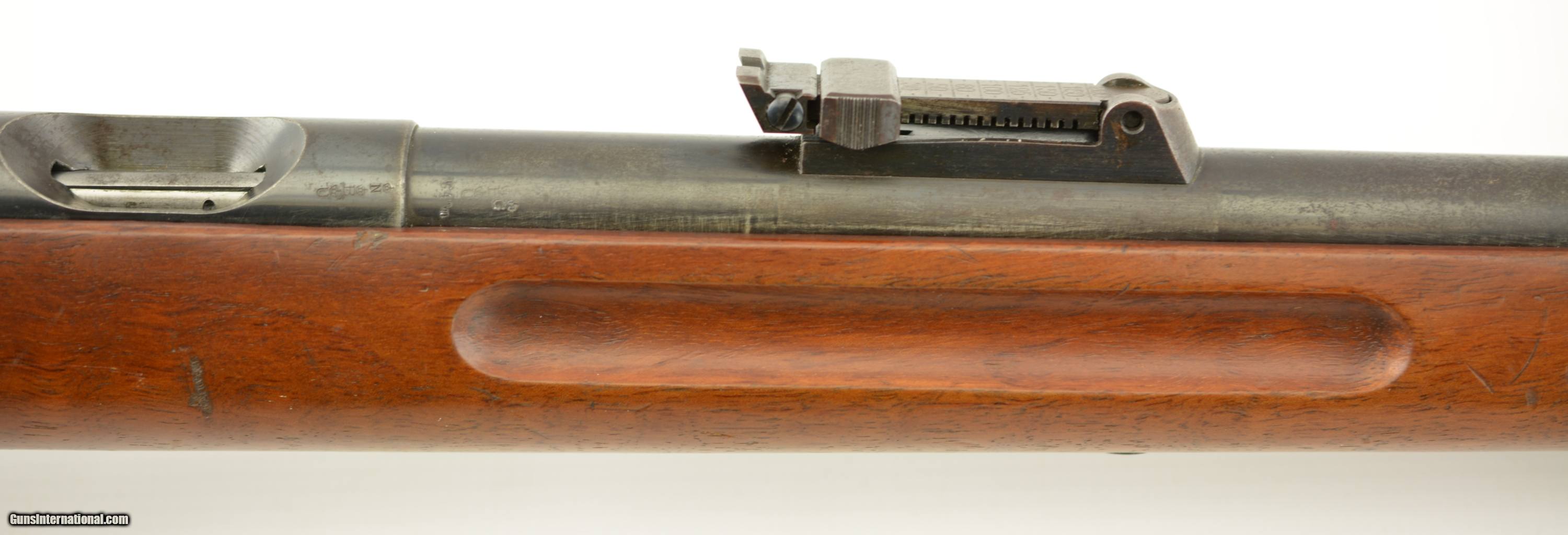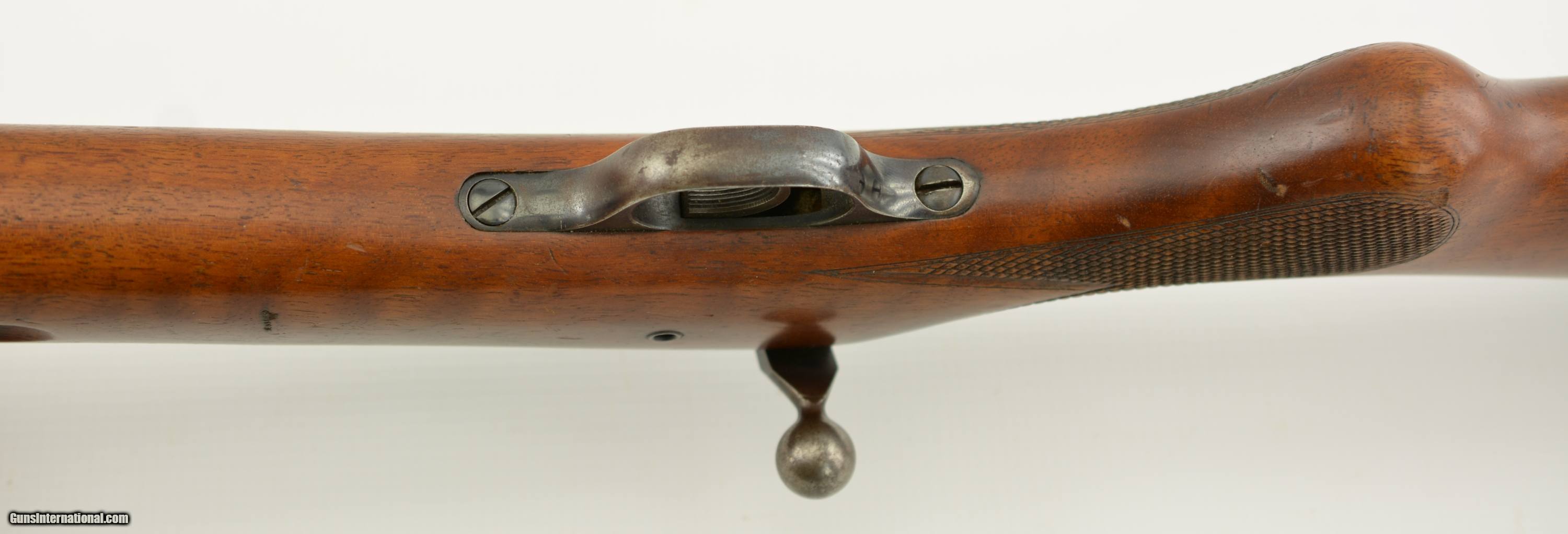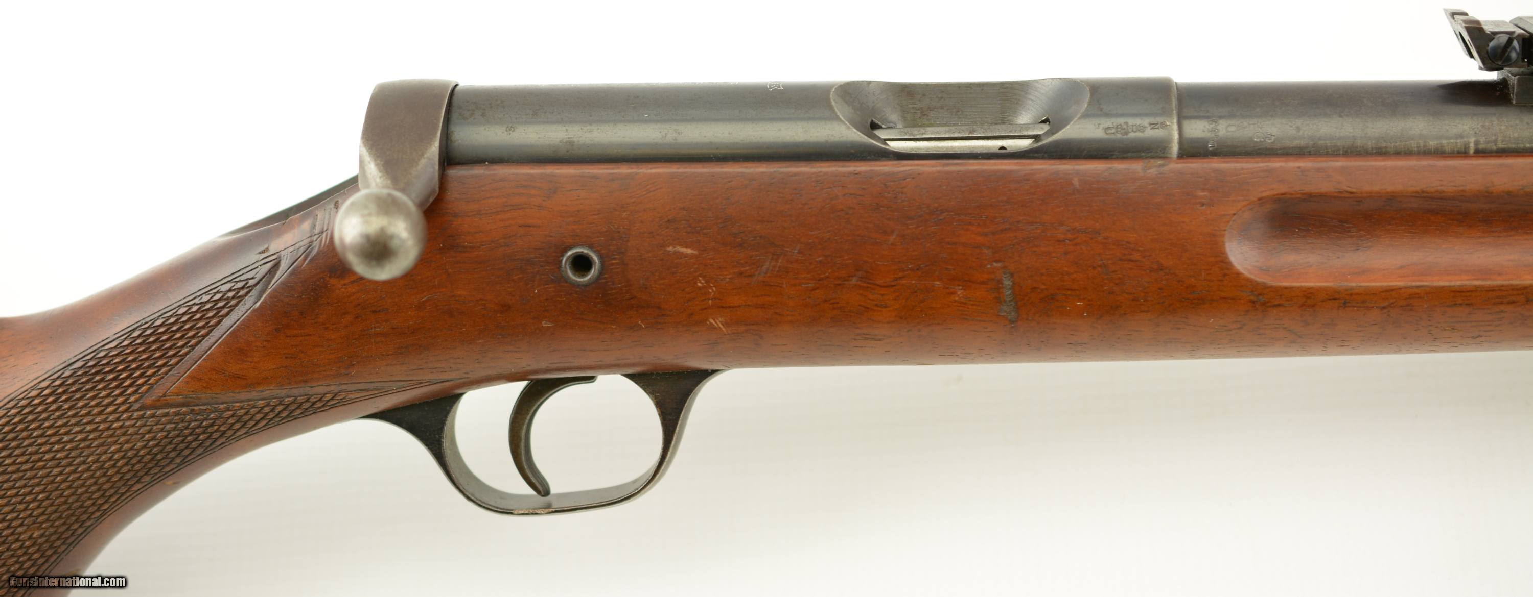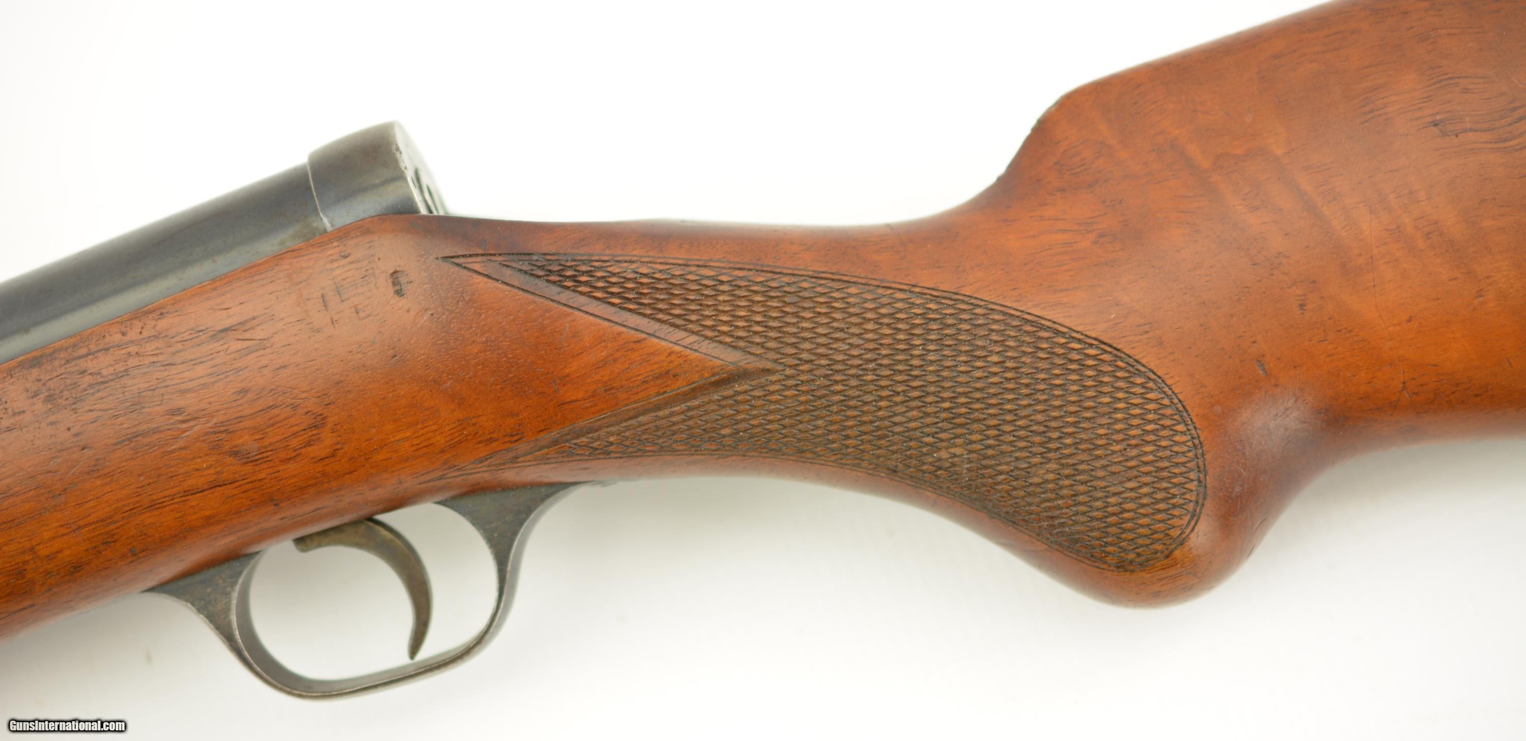 Description: Serial #27138, .22 LR, 25 1/2" barrel with an excellent, bright bore. This is a Zella-Mehlis produced, single-shot rifle, made circa-1956, with 70-75% of the original blue remaining on the barrel and receiver. There is some gray fading and silvering at the muzzle, as well as an area of mottled freckling along the top of the barrel just ahead of the rear tangent sight. The matching numbered bolt has a mostly plum-brown patina with silvering on the handle and knob. The checkered, finger-groove stock is in very good condition with scattered handling marks and minor blemishes throughout, and there is moderate flattening of the points on the pistol-grip. The rifle is missing the firing pin and the front sight. This is a very well-made, Walther .22, and rates very good overall. FFL or C&R SOLD Manufacturer: Walther Model: Sportmodell V Serial Number: 27138 Caliber Info: .22 Gauge Info: .22 |