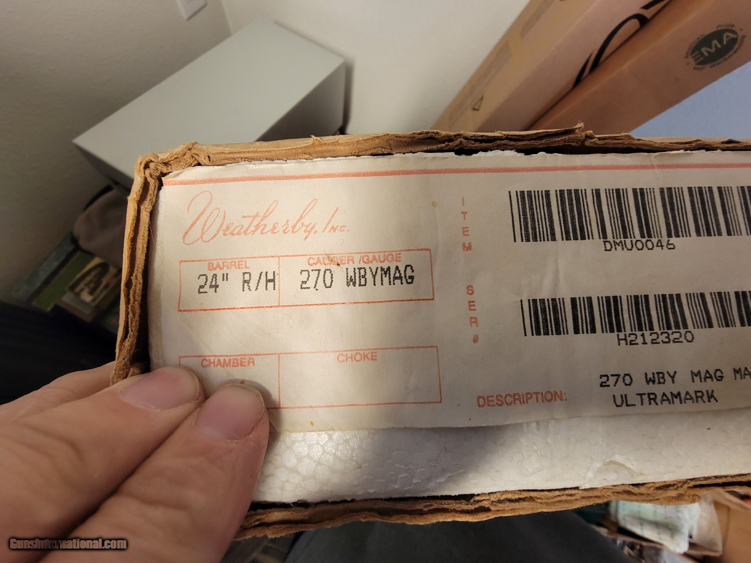 Description: For sale, NIB Weatherby Mark V UltraMark 270 wby Made in Japan 24" barrel Comes with original box Still has rubber on the bolt handle. More pictures available $2200 plus Shipping 4068501246 SOLD Rifle Caliber: .270 Weatherby Magnum Manufacturer: Weatherby Model: Mark V UltraMark Barrel Length: 24 Condition: NIB Metal Condition: NIB Wood Condition: NIB Bore Condition: NIB Action: Bolt |