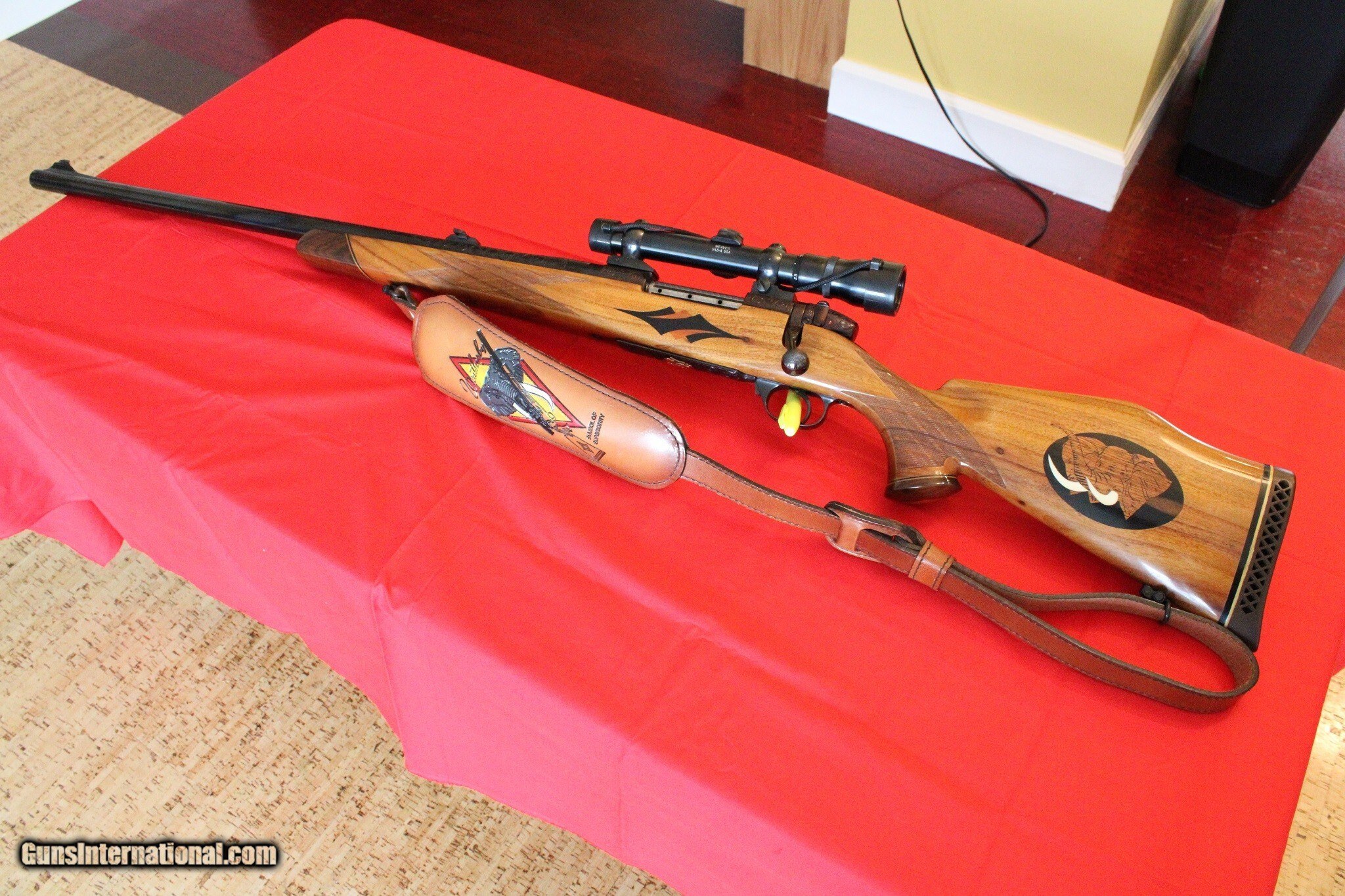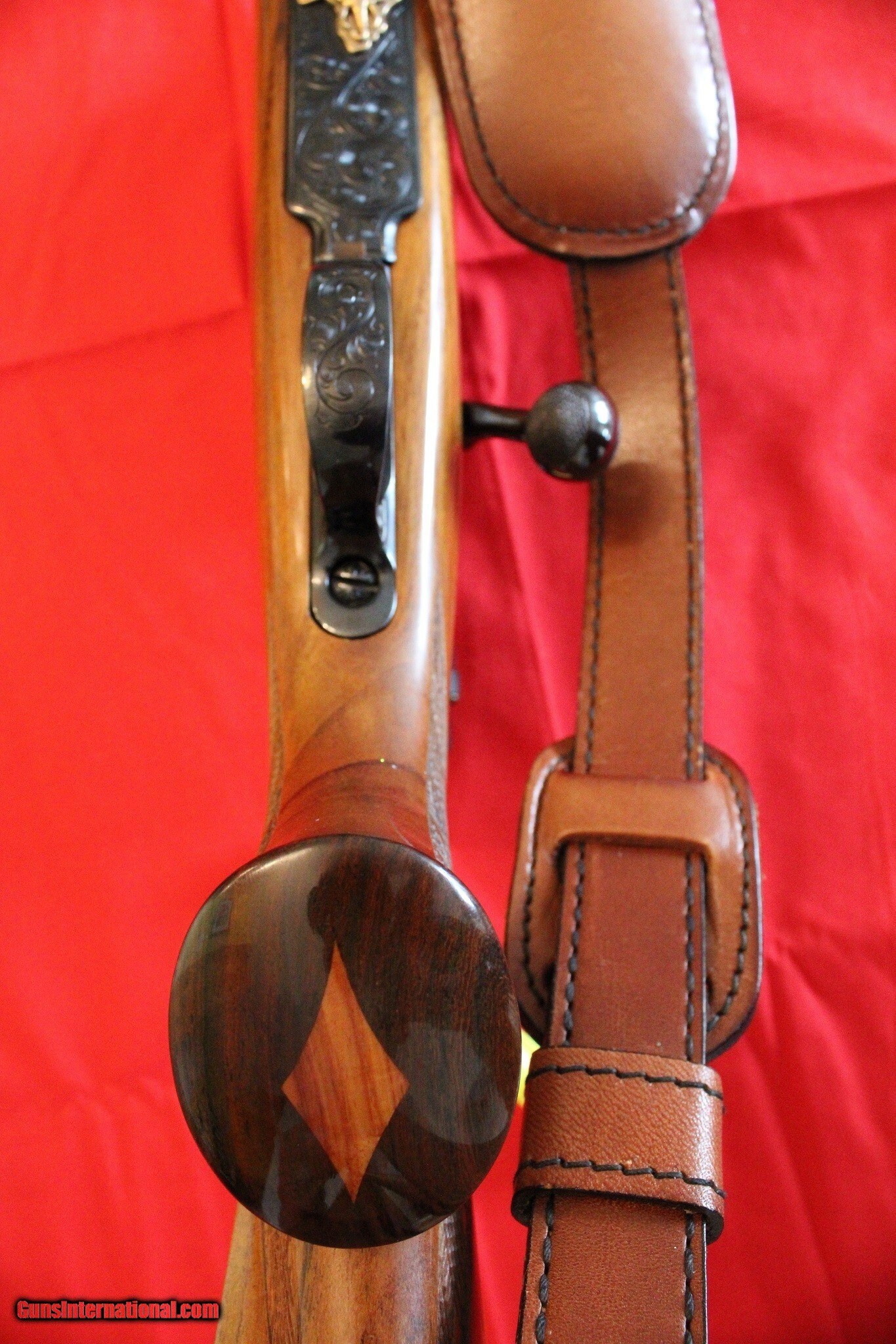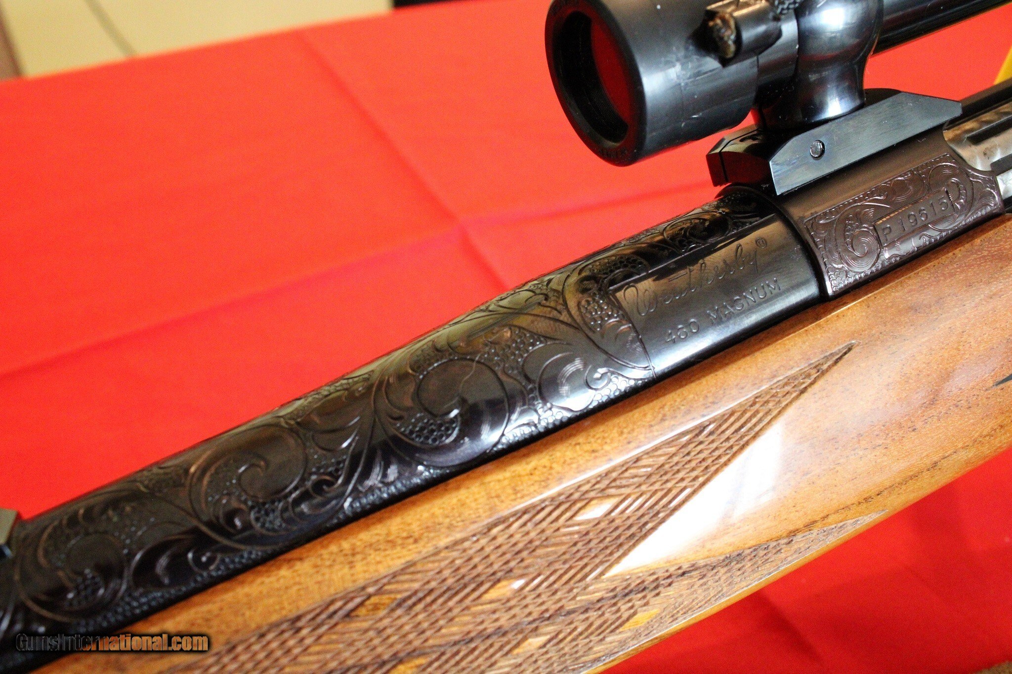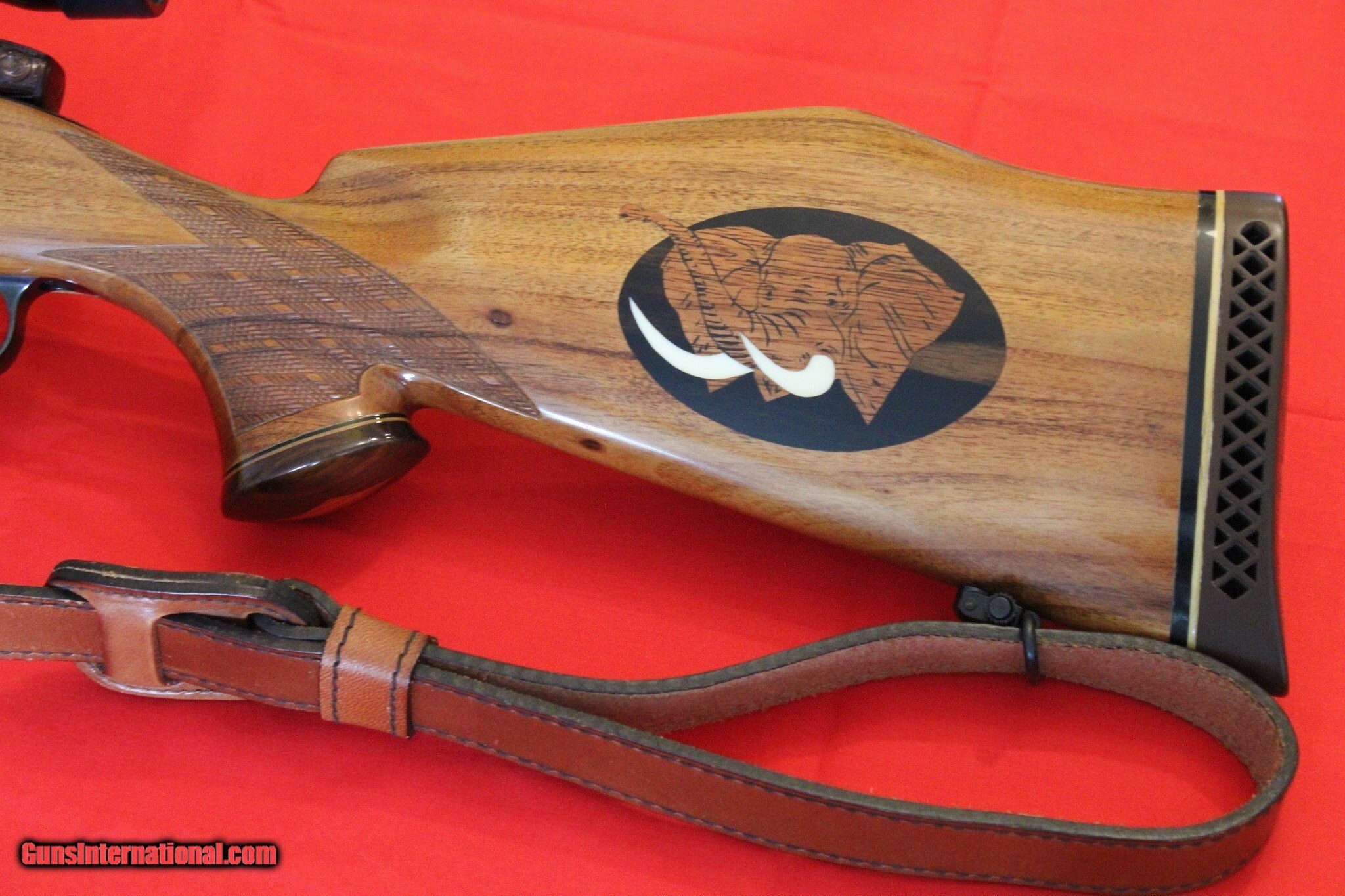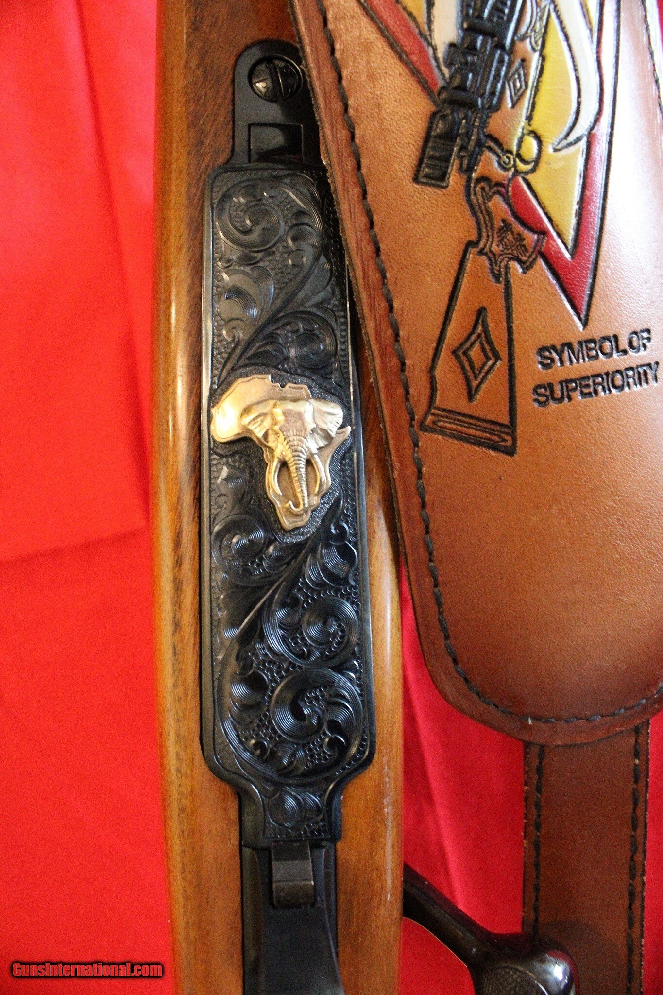 Description: serial #P19615, 460 Weatherby Magnum, Left Hand, 26” barrel with Pendleton brake and an excellent bore. The metal surfaces retain 99% original blue with some faint freckles mostly-found near the muzzle and on the brass bead front sight with the receiver and the numbers-matching bolt toning to a brownish-plum hue. The surfaces are wonderfully-engraved in a flowing scroll and punch-dot-shading motif with about 50% coverage on the barrel and receiver, full coverage on all three sides of the bolt shroud and a small wedge on the two-panel-checkered bolt handle. The floorplate completes the metal accents with an excellent engraved-in-relief gold elephant with continent of Africa background and more flowing scroll, the bolt body and follower remain bright with a tight damascened pattern. The skip-line checkered mesquite Monte Carlo stock with rosewood grip cap and forend tip, right-side cheekpiece and pattern #8 ebony and rosewood inlays is excellent with a couple very minor blemishes. The original purchaser of this rifle spared no expense, there is an unembellished gold monogram plate in the center of bottom forend inlay and a pattern #33 elephant inlay with genuine ivory tusks was placed in the left-side butt. This handsome 1966 West German rifle is equipped with open sporting sights, vintage Weaver Scope and Elephant Sling. These early Crown Customs withstand the test of time and remain Weatherby’s most attractive and sought-after offering. Curio/Relic: Yes Rifle Caliber: .460 Weatherby Magnum Price: $7,500.00 Shipping: $100.00 Buy Now Contact Seller |