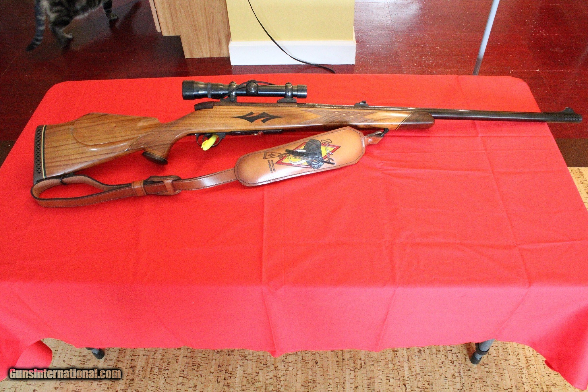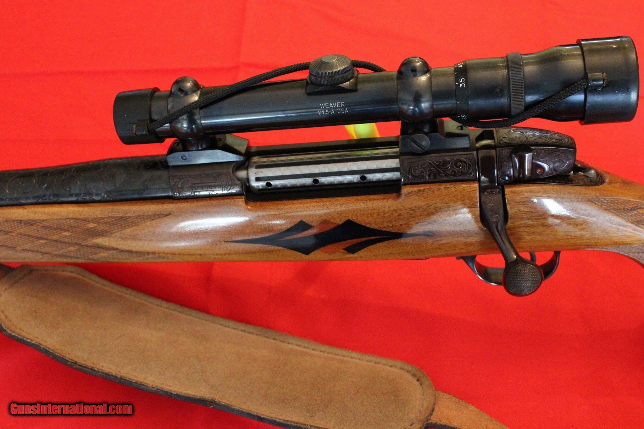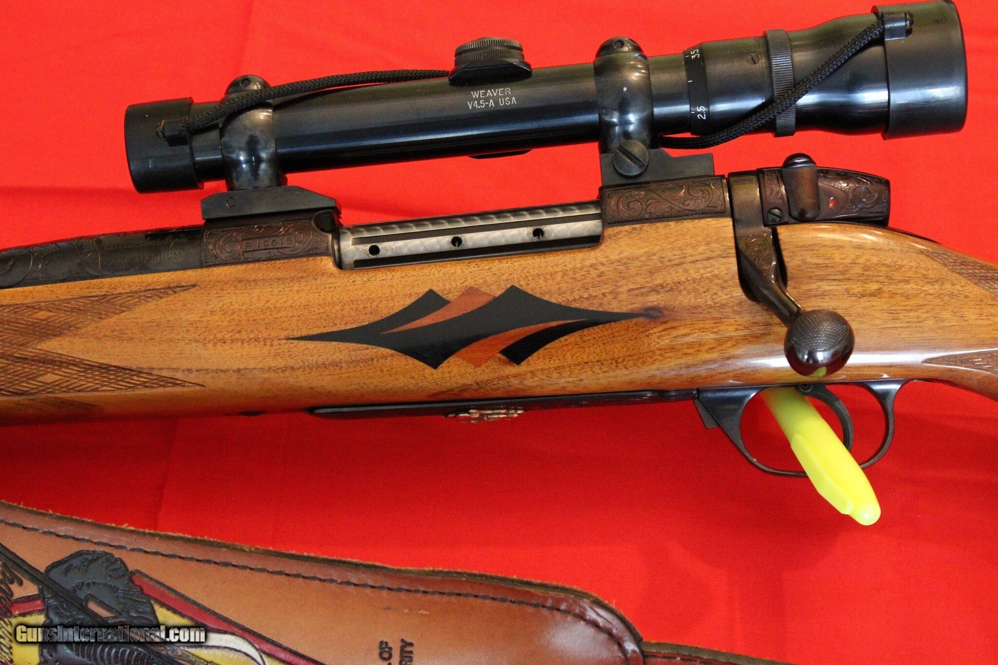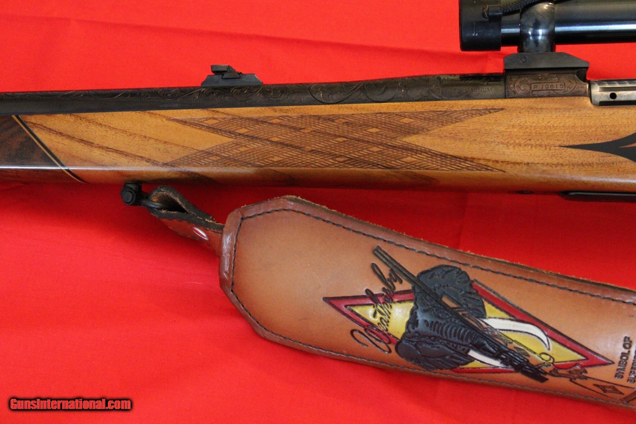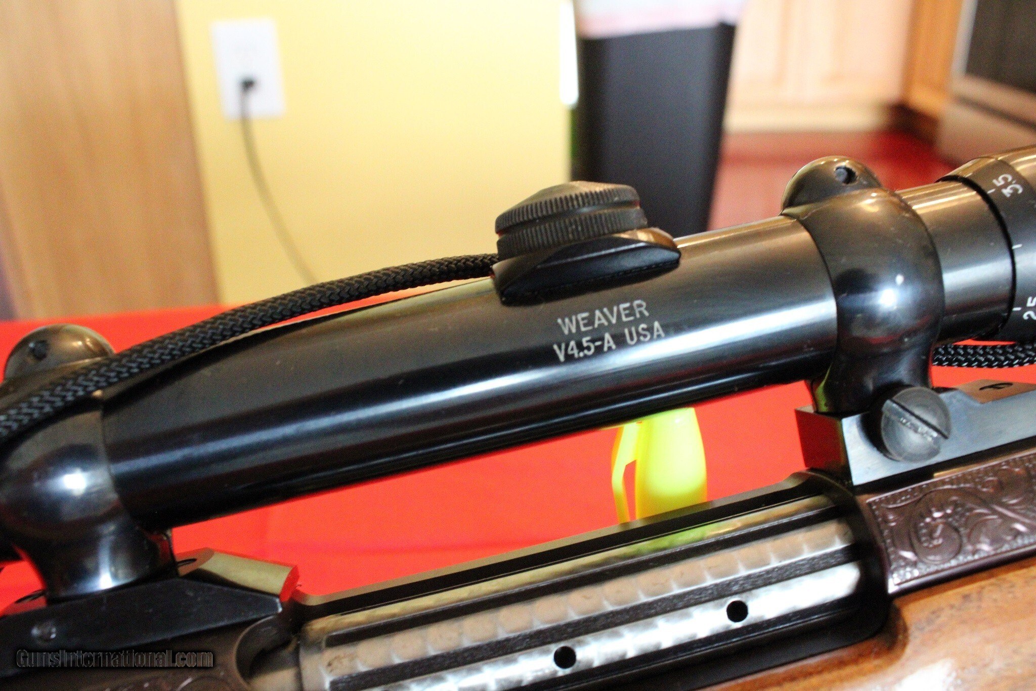 Description: serial #P19615, 460 Weatherby Magnum, Left Hand, 26” barrel with Pendleton brake and an excellent bore. The metal surfaces retain 99% original blue with some faint freckles mostly-found near the muzzle and on the brass bead front sight with the receiver and the numbers-matching bolt toning to a brownish-plum hue. The surfaces are wonderfully-engraved in a flowing scroll and punch-dot-shading motif with about 50% coverage on the barrel and receiver, full coverage on all three sides of the bolt shroud and a small wedge on the two-panel-checkered bolt handle. The floorplate completes the metal accents with an excellent engraved-in-relief gold elephant with continent of Africa background and more flowing scroll, the bolt body and follower remain bright with a tight damascened pattern. The skip-line checkered mesquite Monte Carlo stock with rosewood grip cap and forend tip, right-side cheekpiece and pattern #8 ebony and rosewood inlays is excellent with a couple very minor blemishes. The original purchaser of this rifle spared no expense, there is an unembellished gold monogram plate in the center of bottom forend inlay and a pattern #33 elephant inlay with genuine ivory tusks was placed in the left-side butt. This handsome 1966 West German rifle is equipped with open sporting sights, vintage Weaver Scope and Elephant Sling. These early Crown Customs withstand the test of time and remain Weatherby’s most attractive and sought-after offering. Curio/Relic: Yes Rifle Caliber: .460 Weatherby Magnum Price: $7,500.00 Shipping: $100.00 Buy Now Contact Seller |