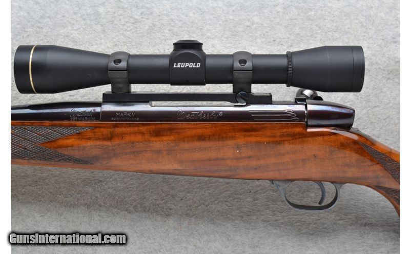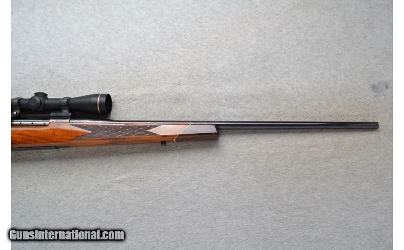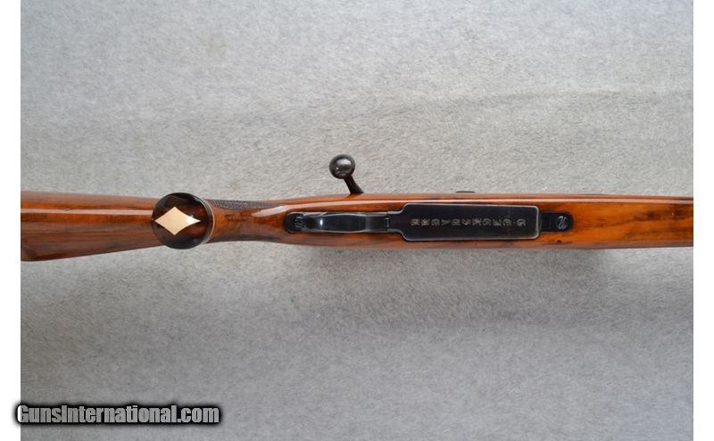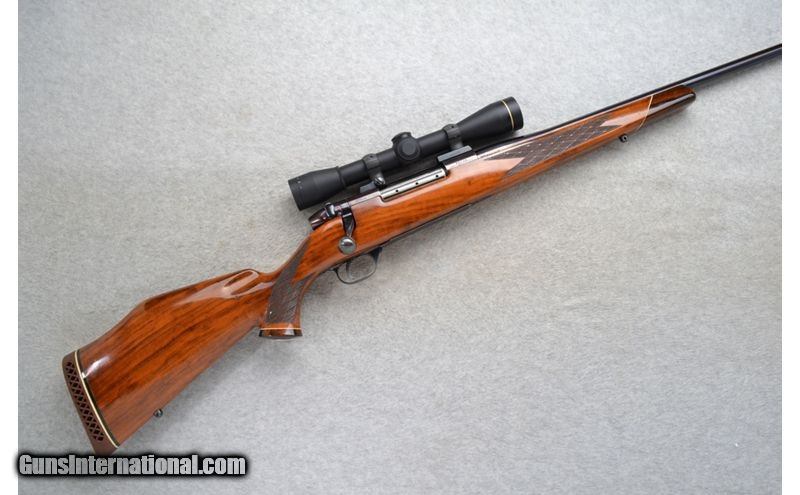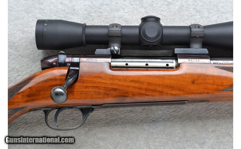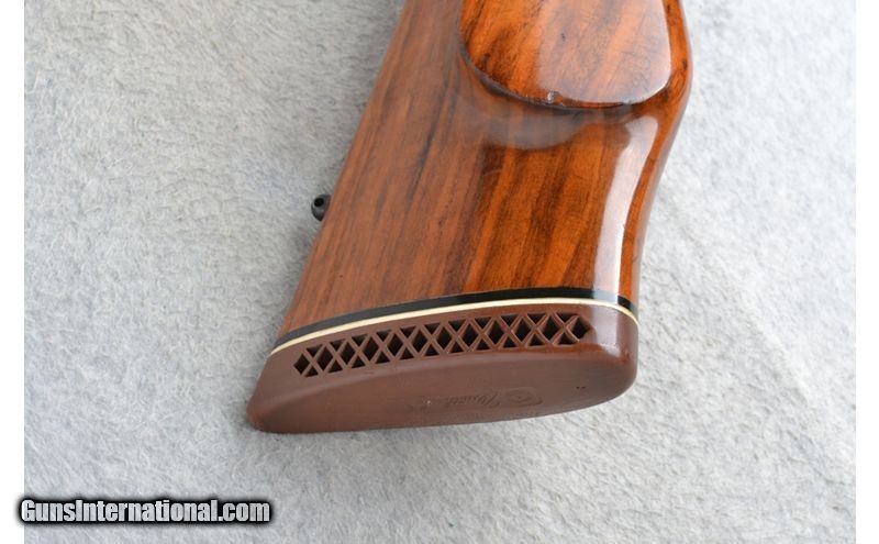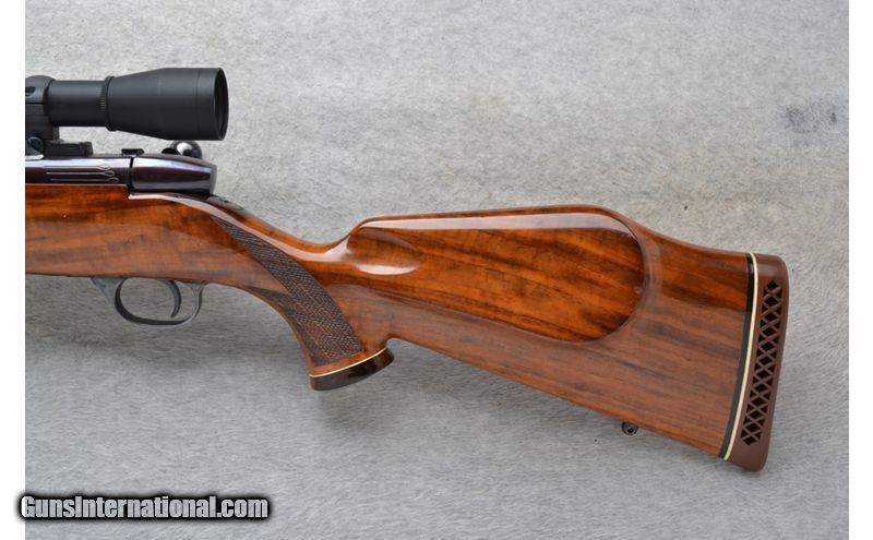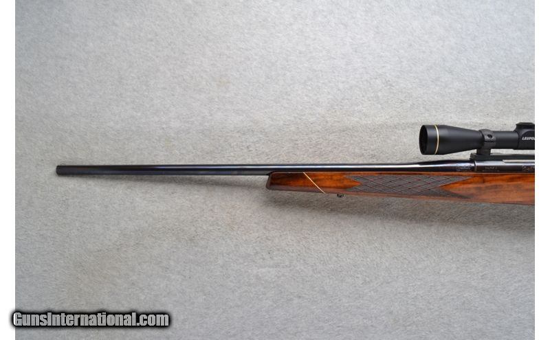 Description: This Weatherby Model Mark V is a right hand bolt action rifle in .257 Magnum Cal. It has a 24 inch barrel. It is outfitted with a Leupold FX-II 6x36mm Scope. No iron sights. The butt stock is a diamond checkered grip walnut with a raised cheek piece and rosewood cap. The forearm is a diamond checkered walnut with a rosewood tip. It has a grooved trigger. Made in W. Germany. .257 Weatherby Magnum SOLD Chambers: 4 round right hand bolt action with a hinged floor plate. Metal Condition: Fair. Has some very minor handling marks and freckling. Rust on the magazine bottom under the floorplate. A little blue wear. Wood Condition: Fair with light handling marks. Very fine line cracks in the surface lacquer finish. Bore Condition: Excellent. Barrels: 24 inch. Triggers: Grooved. Stock Dimensions: LOP 13 1/4 inches. Fore End: Diamond checkered grip walnut with a rosewood tip. Butt Pad: Weatherby rubber recoil pad. Weight: 9 LB. 1 OZ. Sights: Leupold FX-11 6x36mm Scope. Item Location: Richfield, WI |