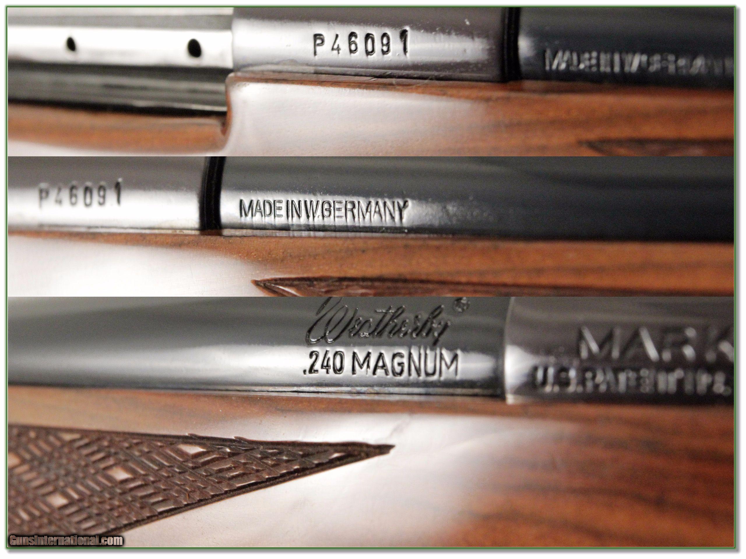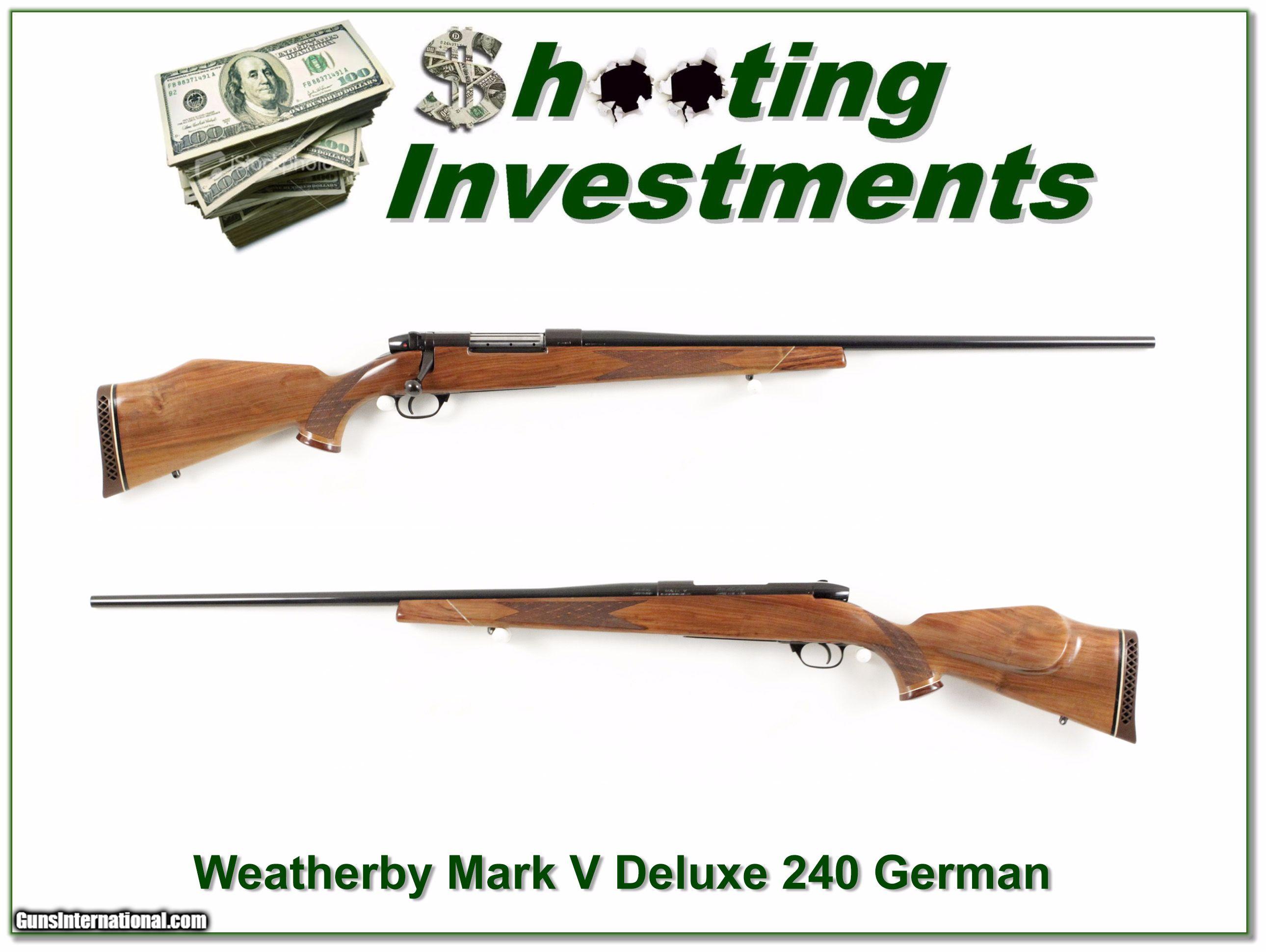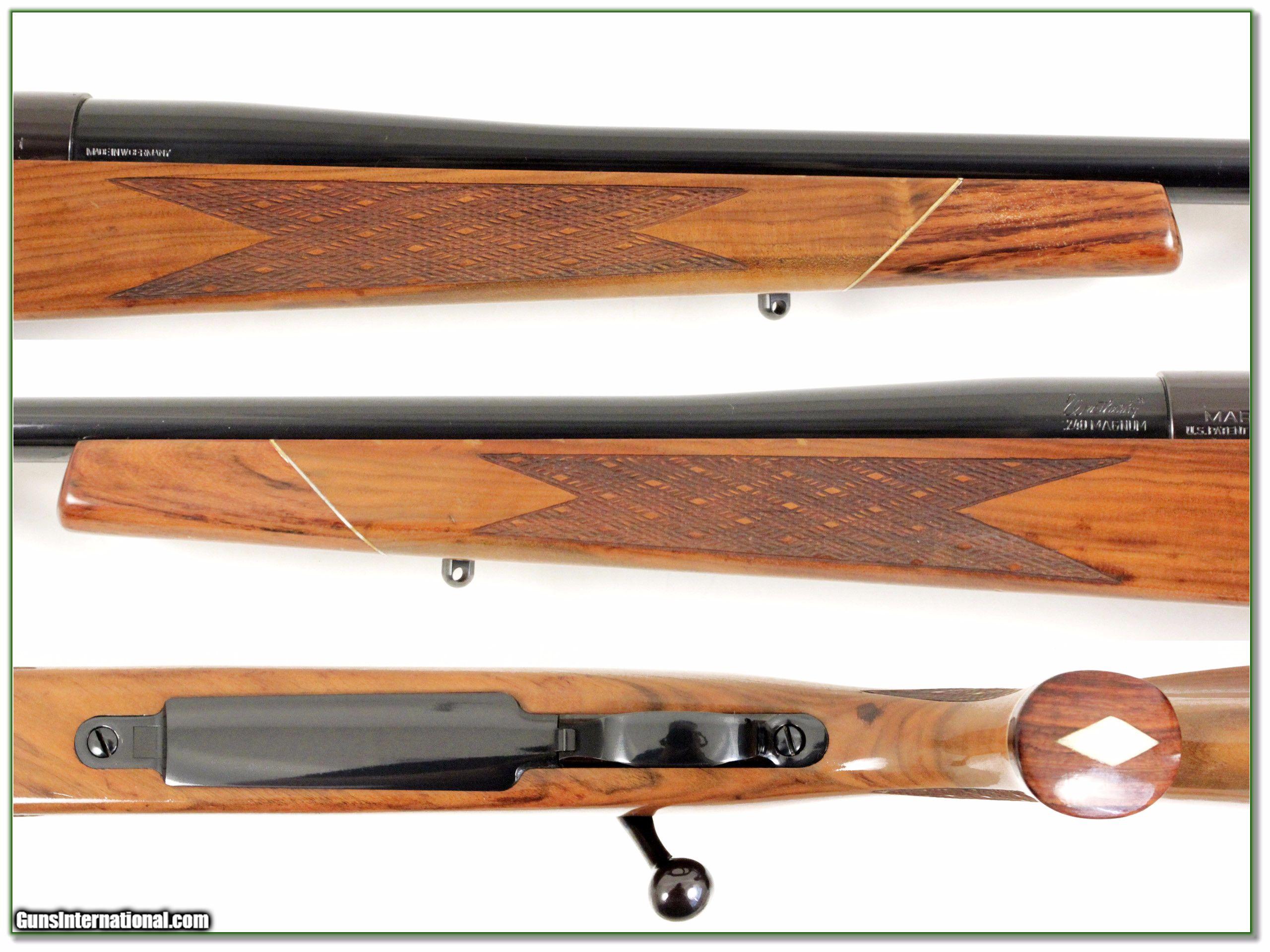Description: This is a hard to find German Mark V in 240 Weatherby Magnum. It is the even more hard to find 26in barrel. The blue on this one is excellent with no marks I see. The wood has numerous marks as seen. If the wood was as nice as the metal I’d sell this one for about $2000. It will make a classic hunting gun as is or you could have the wood restored to have a perfect classic in a hard to find caliber. Shipping and insurance is $35 or $15 more if you want it shipped in a new Plano hard case. Please email me with any questions or larger pictures. (Consign your quality firearms with Shooting Investments for only 10%! Let me know if you have any you would like to sell!) 17-1010 Payment: Payment is by Money Order, Cashiers Check or Personal Check. I can now also accept MasterCard and Visa with a 3% convenience fee. PayPal can be used for some items but never firearms. Please let us know if you would like to pay via PayPal. Shipping: The shipping charge will be listed in each description. It is $35 for most guns. Some heavy guns or those insured for over $2000 will be higher. Shipments to Alaska and Hawaii are higher because air shipment is required. Most firearms are shipped within 5 days of receipt of payment. We prefer shipping at the beginning of the week to avoid firearms in transit over weekends. We package all shipments carefully and insure them for the full purchase price, rounded up to the next $100. In the unlikely event that damage occurs, it is important that you save all packaging material for the claims process. Optics are shipped Priority Mail and most other non-firearm shipments are shipped First Class. Returns: Our return policy is simple. If for any reason you are not pleased with your purchase, you may return your item for a refund. The only exception is ammunition, it cannot be returned. It is important to us that you are happy. Guns cannot be fired or dissembled before returning them and must be returned in the same condition as received. Notification of a return must occur with-in 3 days of receipt at your dealer. Shipping, convenience and dealer fees are not refundable and are the responsibility of the buyer. Lay-a-way: If needed, we offer a 60 day lay-a-way option on most firearms. It is 1/3 now, 1/3 in 30 days and 1/3 in 60 days. Lay-a-way firearm sales are final. Consigning your firearms with Shooting Investments: We will help you get top dollar for your firearms. While most local guns shops charge 20% or more, our fee is only 10% with a minimum of $50. At your local gun shop it might take months to sell. Selling on-line provides instant access to thousands of interested buyers. You won’t find any other on-line dealer willing to sell your firearms for only 10% or listing every gun on 4 separate s. Selling through an House typically costs the seller 15% and the buyer an addition 15% (so 30%) and you have to wait several months to sell and longer to receive funds. If properly priced, we will sell your firearms in a week or two. Send us an email or give us a call and we’ll explain how easy it is for you to get top dollar. Trading: We collect guns and usually just trade for guns we want to add to our collections. We often sell guns for others wanting to purchase one of ours. We find this the most fair to both of us. Our Commission is only 10% and we hold the gun you want until yours sells. Please contact us if you want to sell one of yours to buy one of ours. Help for California Buyers: We are happy to ship to California. It is the buyer’s responsibility to make sure any item you buy is legal in your state. We are also happy to help with your purchase of a firearm from someone other than us. If you see a gun you would like to buy but the seller can’t or won’t ship to California we can help. You buy the gun and have it shipped to us. We’ll then ship it to your California dealer. The cost for this service is only $30 + shipping. Let me know if we can help! SOLD |