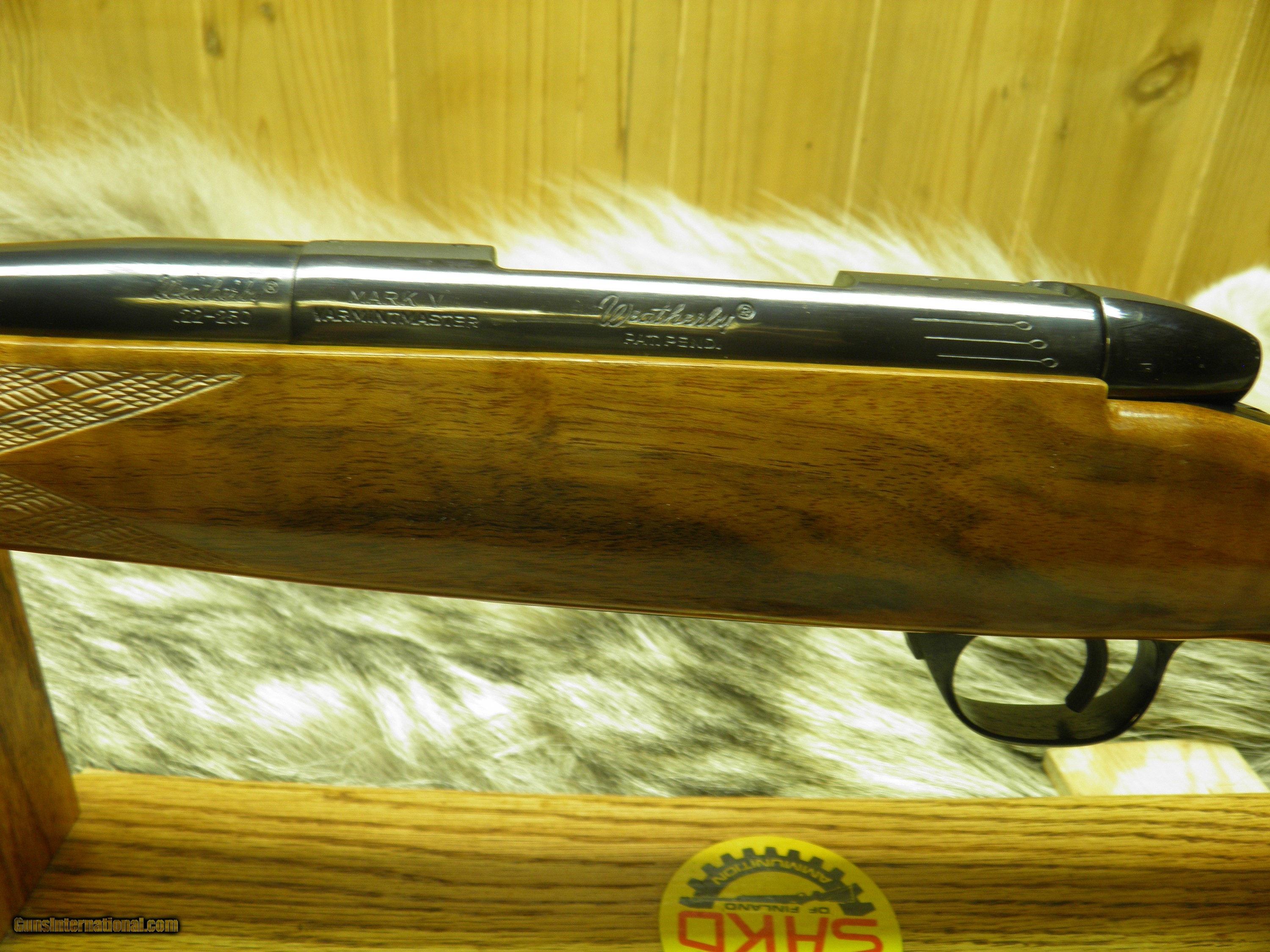 Description: Description: WEATHERBY MARK V DELUXE VARMINTMASTER CAL: 22/250 GERMAN, MANF: IN 1966, BARREL LENGTH 24" WITH A 1 - 14 TWIST, OVERALL LENGTH 43", LENGTH OF PULL 13 1/2", APPROX: WEIGHT 6 1/2 LBS, MAGAZINE CAPACITY 4 ROUNDS, BOLT HAS SIX PRECISION LOCKING LUGS, , , BEAUTIFUL FIGURED HIGH GRADE SELECT AMERICAN WALNUT IN A MONTE-CARLO STYLE STOCK WITH CHEEK-PIECE, ROSEWOOD FOREND TIP AND GRIP CAP WITH WHITE DIAMOND INLAY, BEAUTIFUL HAND-CUT SKIP-LINE DIAMOND CUT CHECKERING, WOOD FINISHED IN A DURABLE HIGH GLOSS, METAL SURFACES ARE A DEEPLY HIGH GLOSS LUSTRE BLUE. OVERALL CONDITION, "WOOD" 99.9%, "BLUE" 98.9%++, IN THE WEATHERBY LINE THE VARMINTMASTERS ARE MY FAVORITE, LOVE THE SHORT ACTION. SOLD |