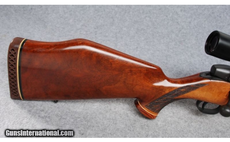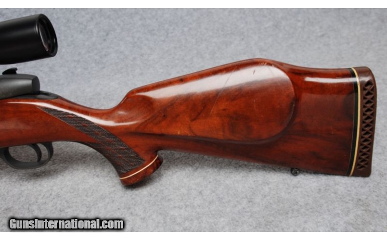 Description: SOLD Caliber Info: 7 mm Magnum Metal Condition: Shows minor handling marks. Wood Condition: Shows numerous contact and handling marks. Bore Condition: Bright with strong rifling. Barrels: 26". Refinished to matte finish. Stock: Fancy Walnut with skip-line checkered pistol grip. Maple spacer and Rosewood grip cap. Monte Carlo. Stock Dimensions: 13 1/2" LOP Fore End: Checkered walnut with Rosewood tip and Maple spacer. Butt Pad: Weatherby vented rubber. Weight: 9 Lbs. 9 Oz. Sights: Sightron 3-9x40 scope. Extras: Scope, bases and rings. Item Location: Billings, MT |