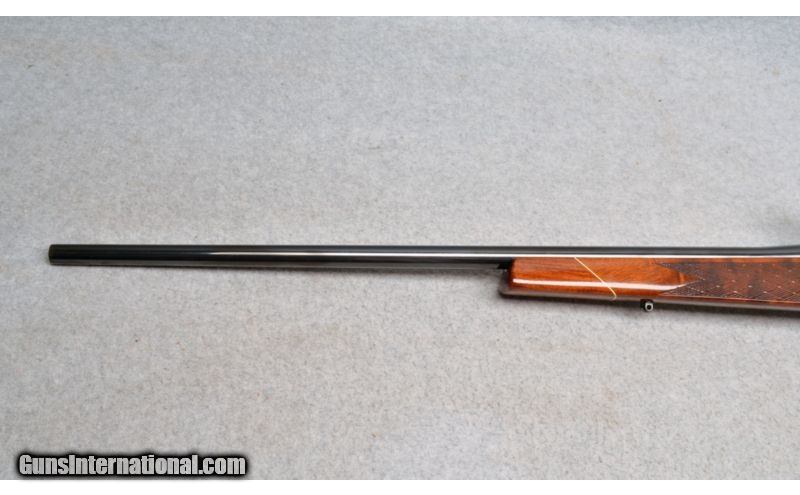 Description: The Weatherby Mark V Varmintmaster rifle was introduced in 1963 as a lightened and scaled down version of the standard Mark V. This was acheived by reducing the size of most of the standard Mark V parts by 20%. featured a 5-round internal box magazine with a hinged floorplate, a 2-position bolt-mounted safety, and was factory drilled and tapped for optics. The Mark V Varmintmaster was made in West Germany for a total of 9 years from 1963 to 1972, with only 7159 manufactured over that time period. There is a little finish loss on the muzzle crown at the highest point, some thinning finish on the bolt knob. SOLD Manufacturer: Early 1960's to early 1970's. Manufactured for 9 years by J.P. Sauer & Son. Caliber Info: .224 Weatherby Magnum. Metal Condition: Very good with few handling marks. Wood Condition: Very good with few handling marks. Bore Condition: Bright and shiny. Barrels: 24 Inch blued barrel, drilled and tapped with scope rings. Triggers: Blue Steel. Stock: Checkered Walnut with a high gloss finish. Stock Dimensions: 15 inches with spacer. Fore End: Checkered Walnut with a high gloss finish. Butt Pad: Black rubber recoil pad Weight: 7 lbs 12 oz. Sights: Drilled ant tapped for scope with rings. Extras: Comes with scope rings. Item Location: Reno, NV |