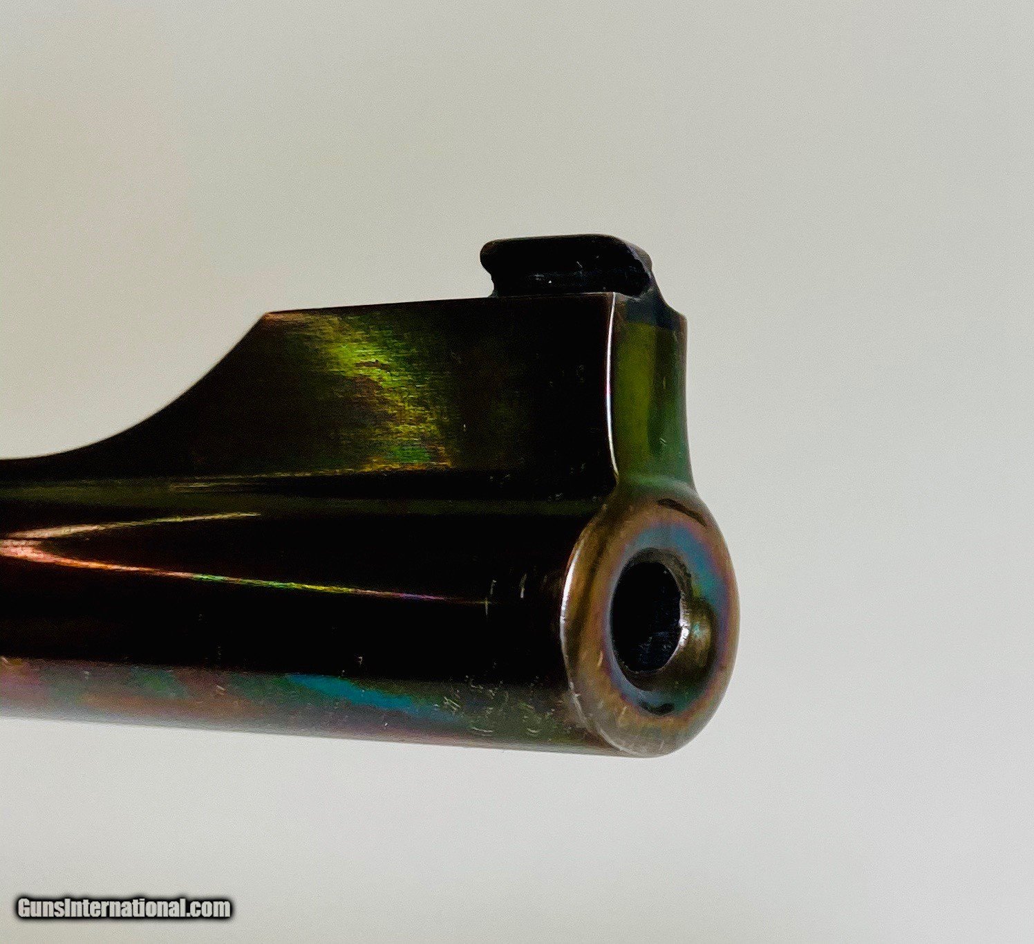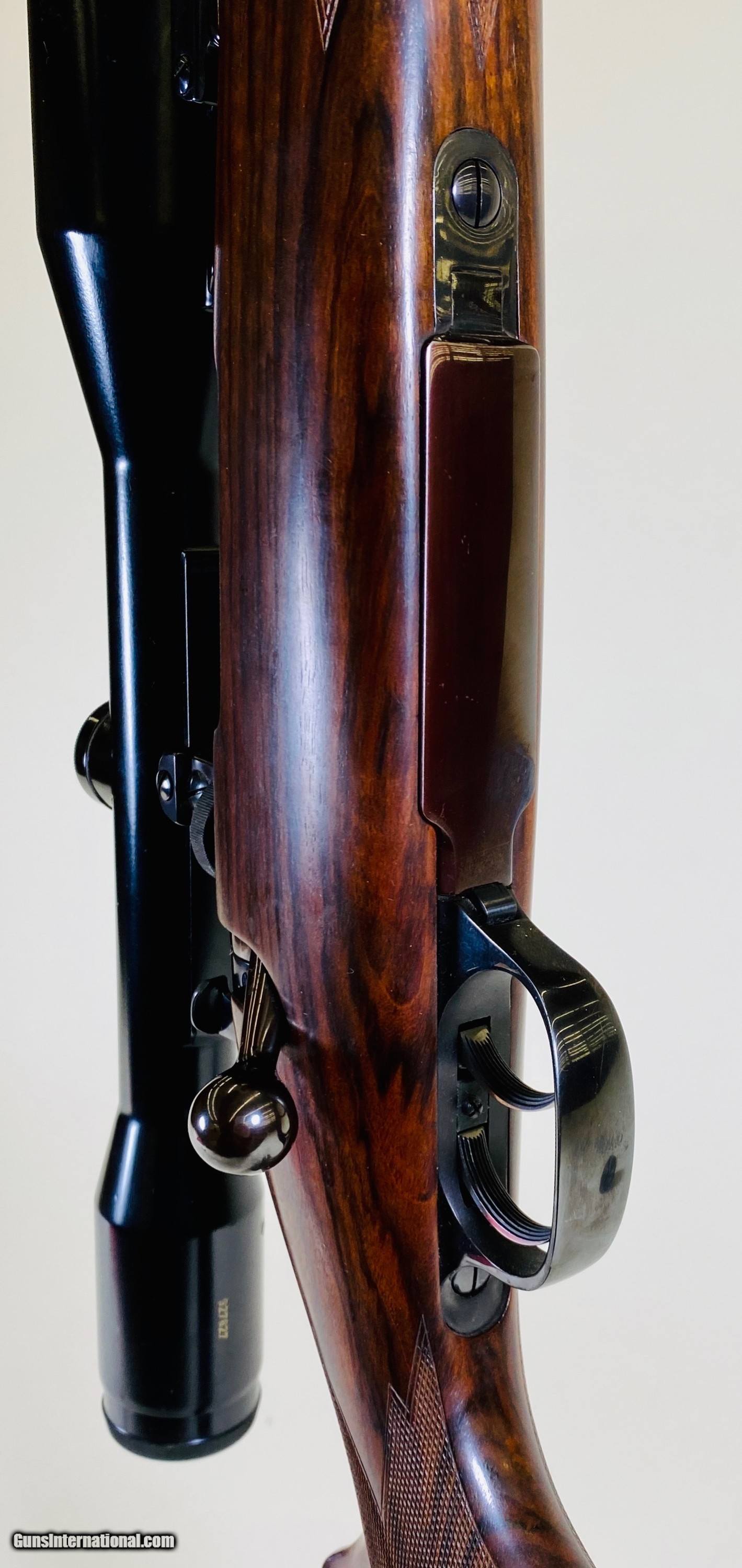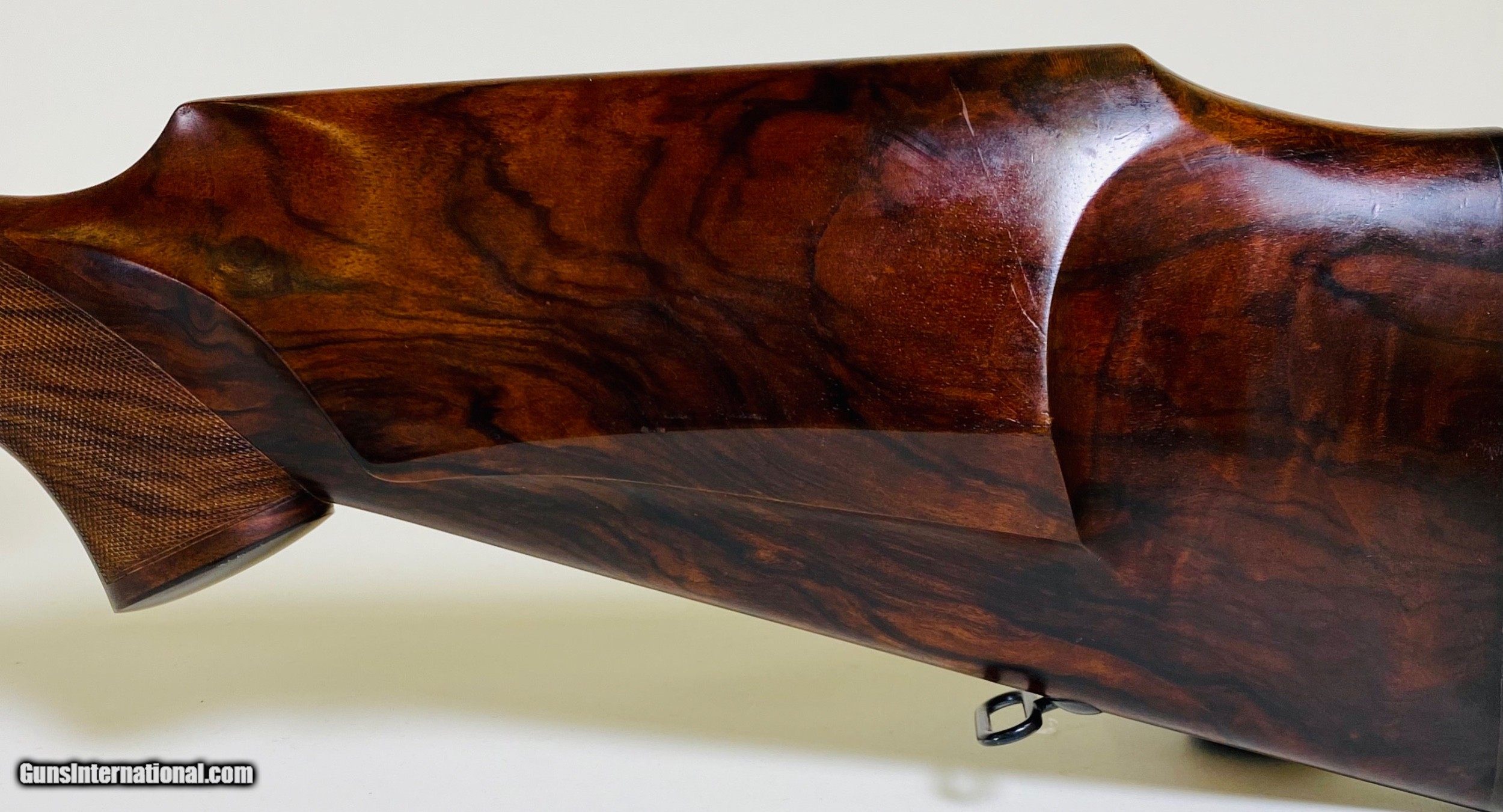 Description: WEATHERBY SAUER RIFLE - GERMANY. MODEL: JUNIOR AS CUSTOMIZED BY SEIDLER IN WIEN (VIENNA) AUSTRIA. SEIDLER IS A RESPECTED AND MULTI-GENERATION SPECIALTY GUNSHOP IN VIENNA (STILL IN BUSINESS TODAY). CAL: 22-250 REM. SN: S7065. 27" BOHLER ANTINIT BARREL WITH 1/4 LENGTH OCTAGONAL PROFILE AND MACHINED FULL INTEGRAL TOP RIB AND RAMPED FRONT SIGHT. DOUBLE SET TRIGGERS. NICELY GRAINED EUROPEAN WALNUT SCHNABEL FOREND STOCK WITH ECCENTRIC BAVARIAN CHEEKPIECE AND HORN BUTTPLATE AND PISTOL GRIP CAP. QUICK DETACHABLE SLING SWIVELS. CLAW MOUNTED ZEISS DIATAL 6X42 SCOPE WITH FULL DUPLEX RETICLE. 14 1/2 LOP. WEIGHT: 7LB12OZ W/ SCOPE, 6LB12OZ W/O SCOPE. CONDITION: GUN IS IN BEAUTIFUL OVERALL CONDITION AS CUSTOMIZED. BORE CLEAR AND BRIGHT. ACTION SMOOTH. DOUBLE TRIGGERS FLAWLESS IN PERFORMANCE. GENTLEMEN, THIS IS A BEAUTIFUL CUSTOM RIFLE, BUILT ON THE FAMOUS SAUER-WEATHERBY MARK V ACTION, AND A UNIQUE CUSTOM RIFLE FOR SURE. FFL REQUIRED. BUYER TO PAY FLAT $65 S/H/I. FOXTROT IS A FFL DEALER. SOLD Manufacturer: SAUER WEATHERBY Model: JUNIOR CUSTOM Serial Number: S7065 Caliber Info: 22-250 Condition: EXCELLENT Metal Condition: EXCELLENT Wood Condition: EXCELLENT Bore Condition: EXCELLENT |