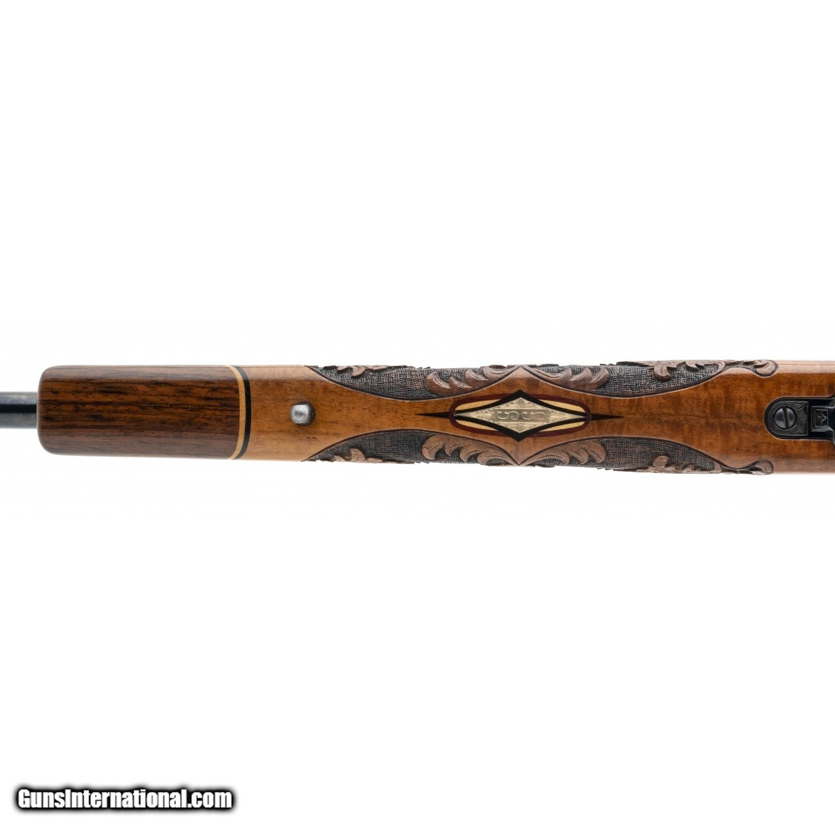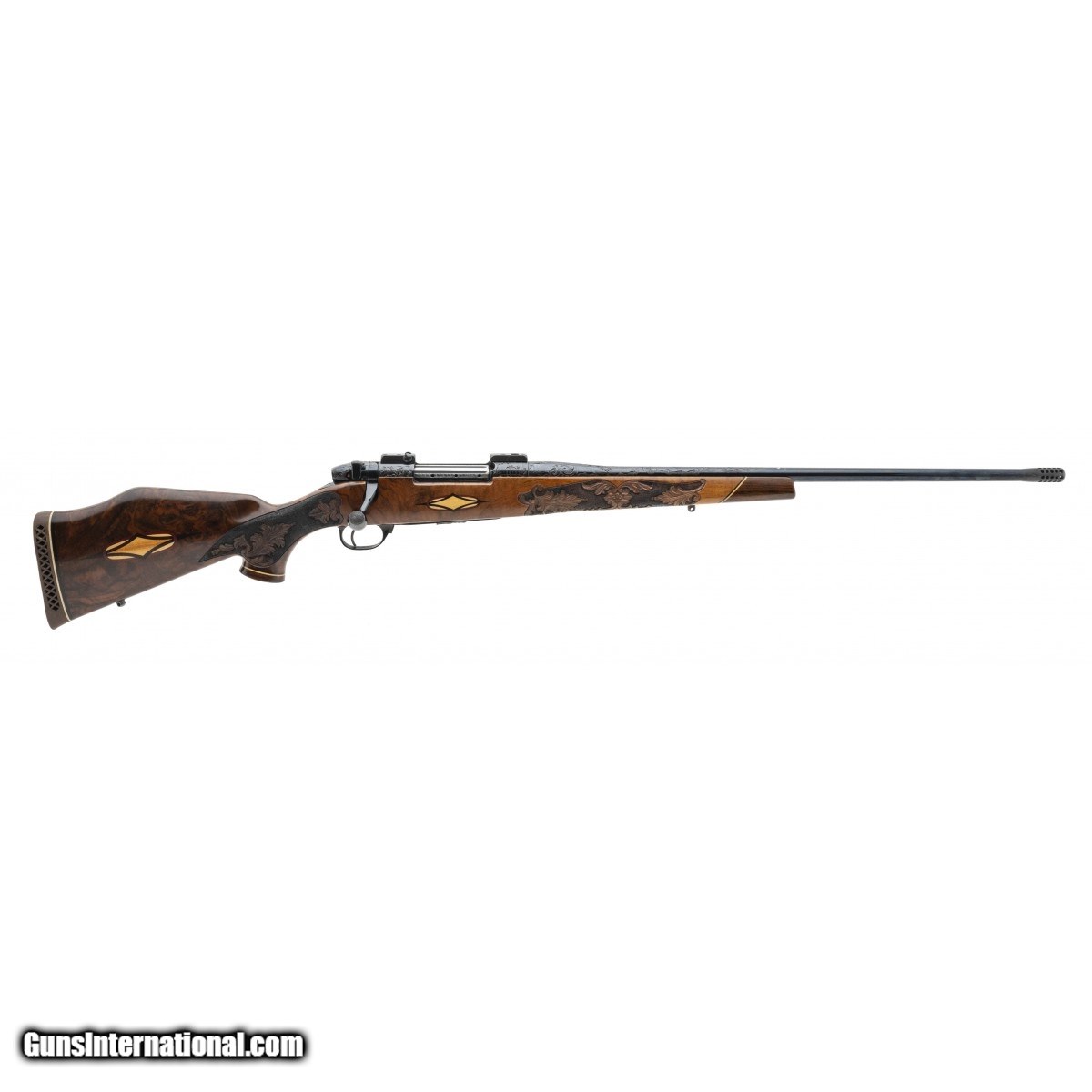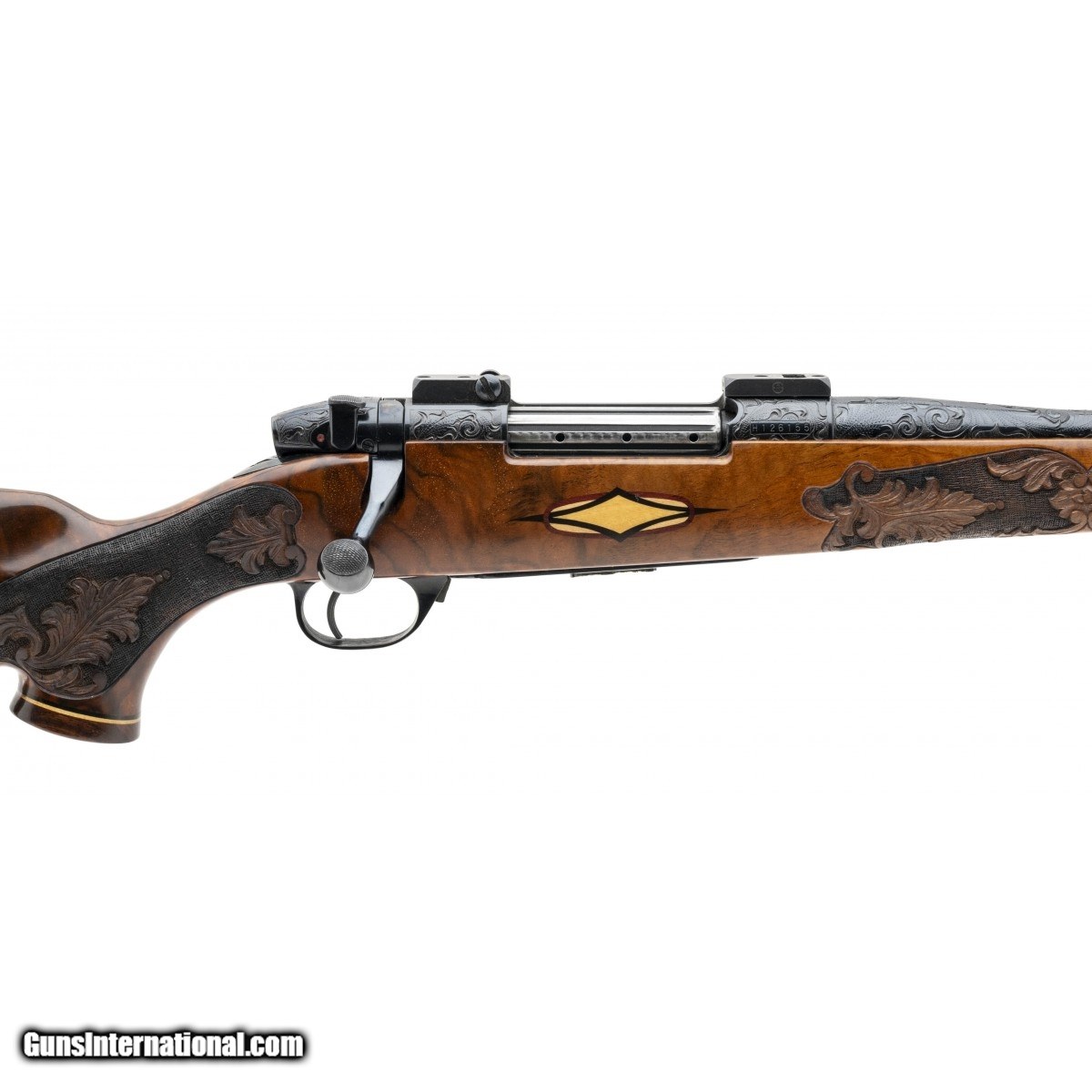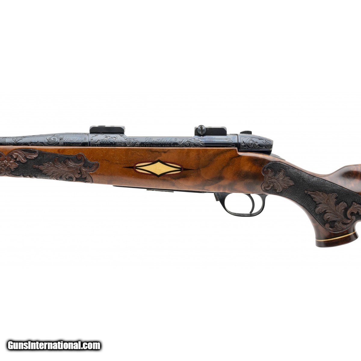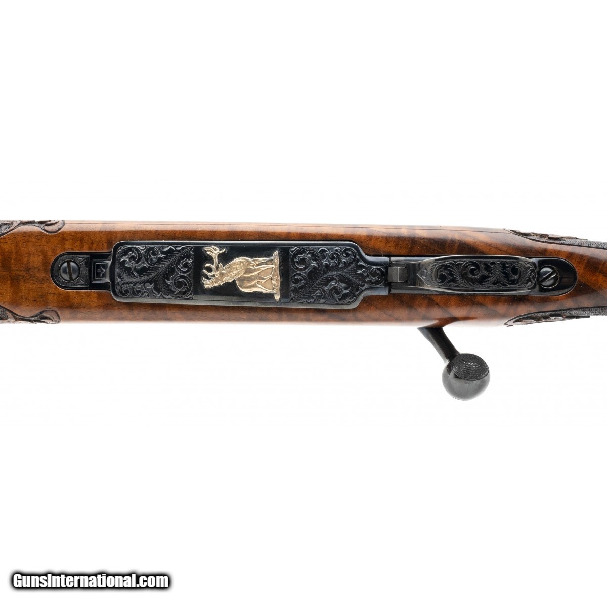 Description: " SN: H126155. 1980's vintage .300 Wby Mag with a 24"" barrel. Bore is excellent. Custom grade Mark V rifle. The metal is scroll engraved with a gold inlaid elk on the floor plate. The stock is deluxe figured walnut with fancy inlays and carving. The barrel has a muzzle brake. A beautiful rifle, in excellent condition. Consignment. SOLD |
