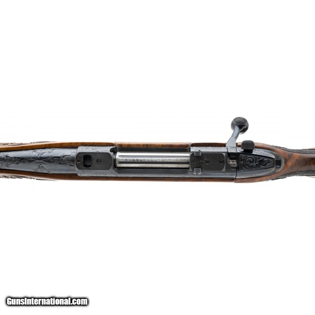 SN: H126155. 1980's vintage .300 Wby Mag with a 24"" barrel. Bore is excellent. Custom grade Mark V rifle. The metal is scroll engraved with a gold inlaid elk on the floor plate. The stock is deluxe figured walnut with fancy inlays and carving. The barrel has a muzzle brake. A beautiful rifle, in excellent condition. Consignment.