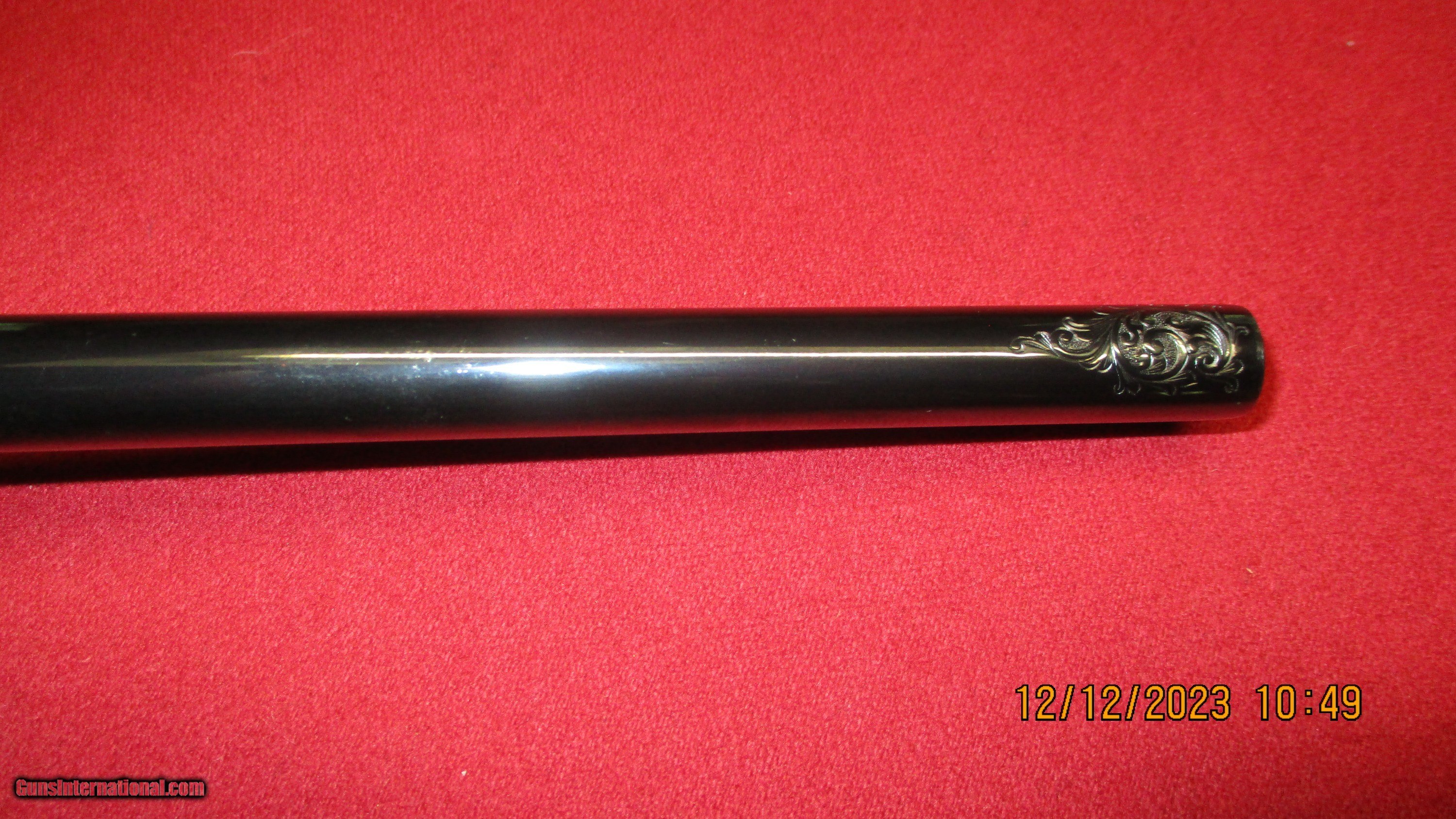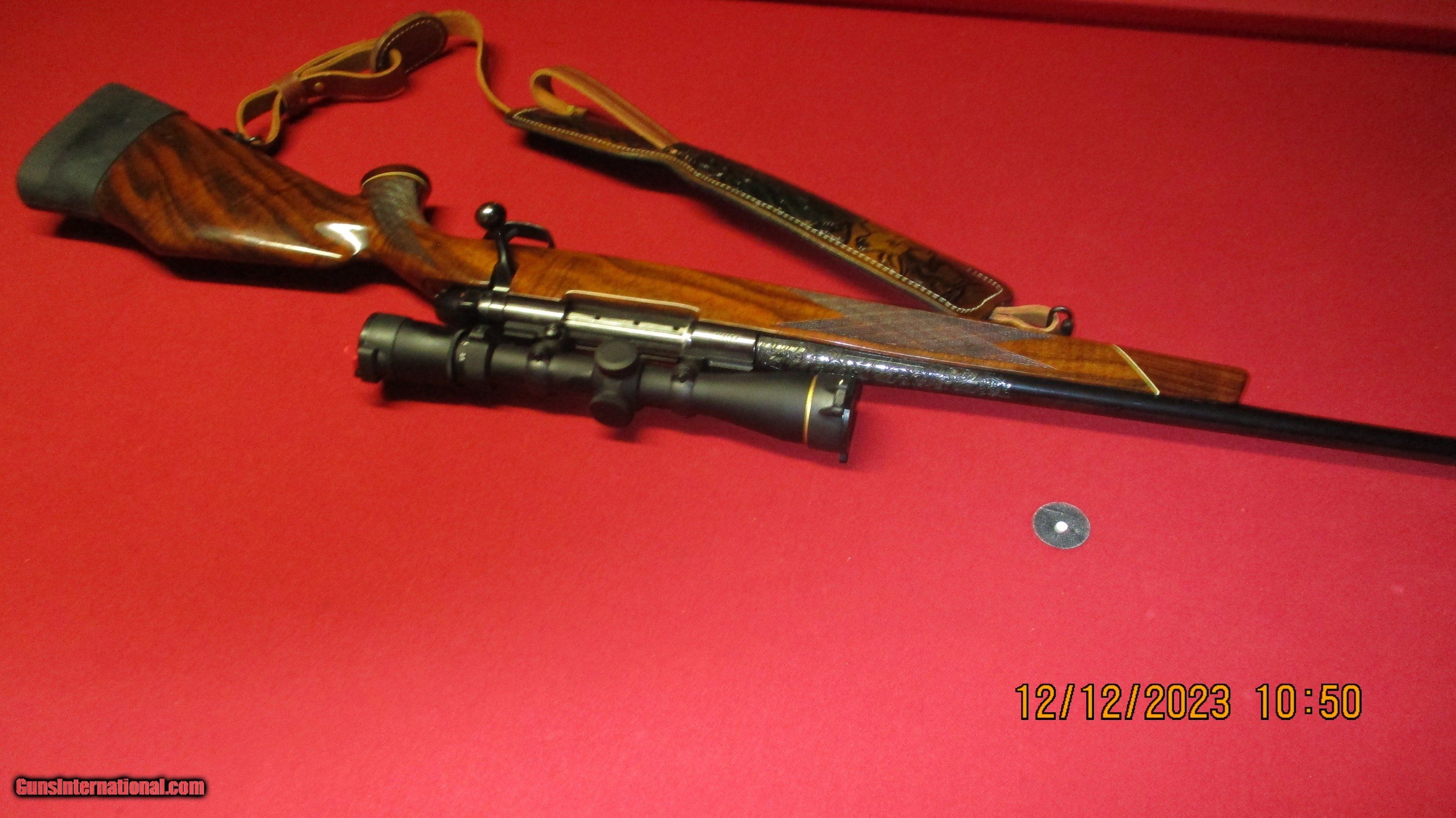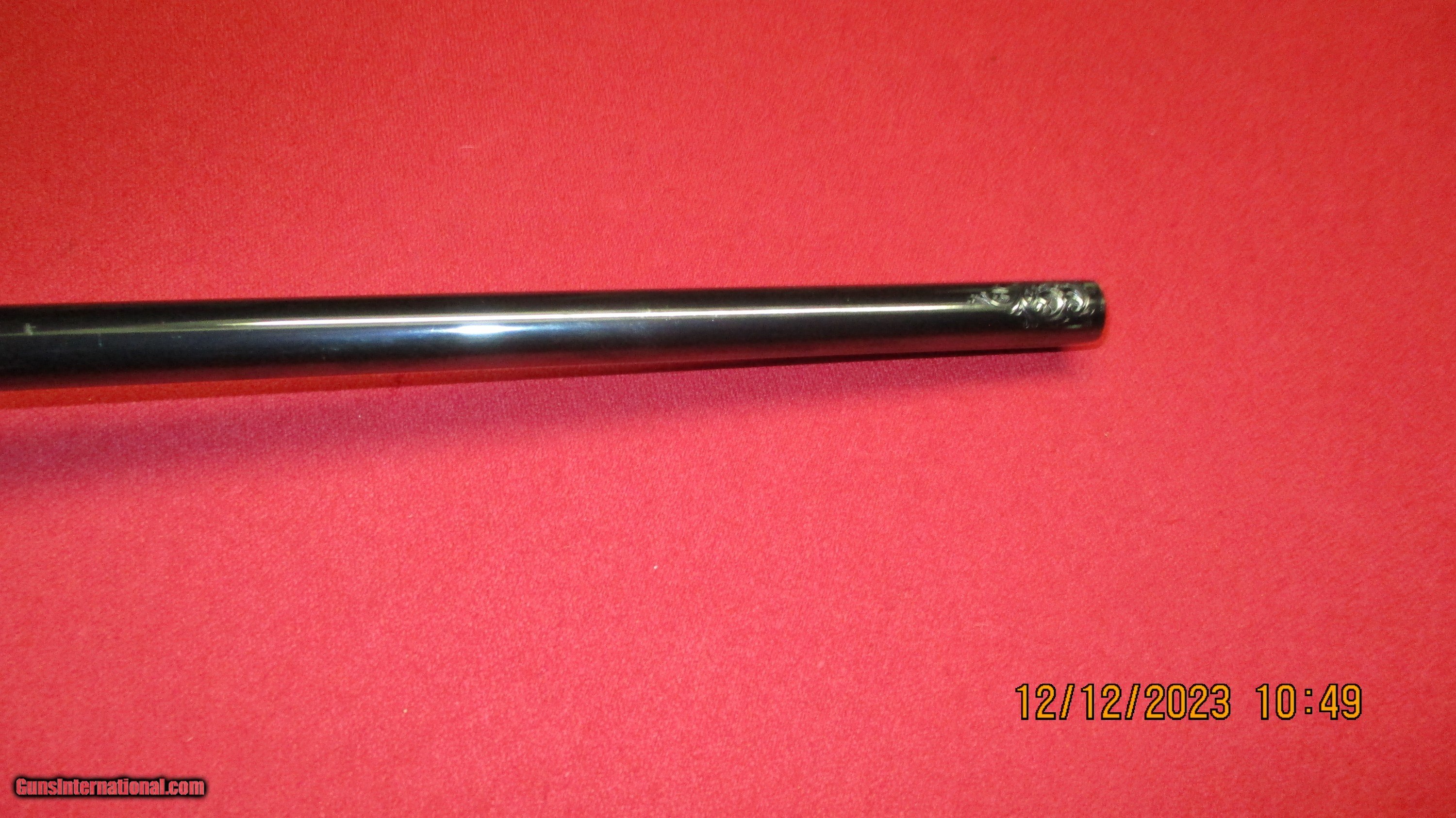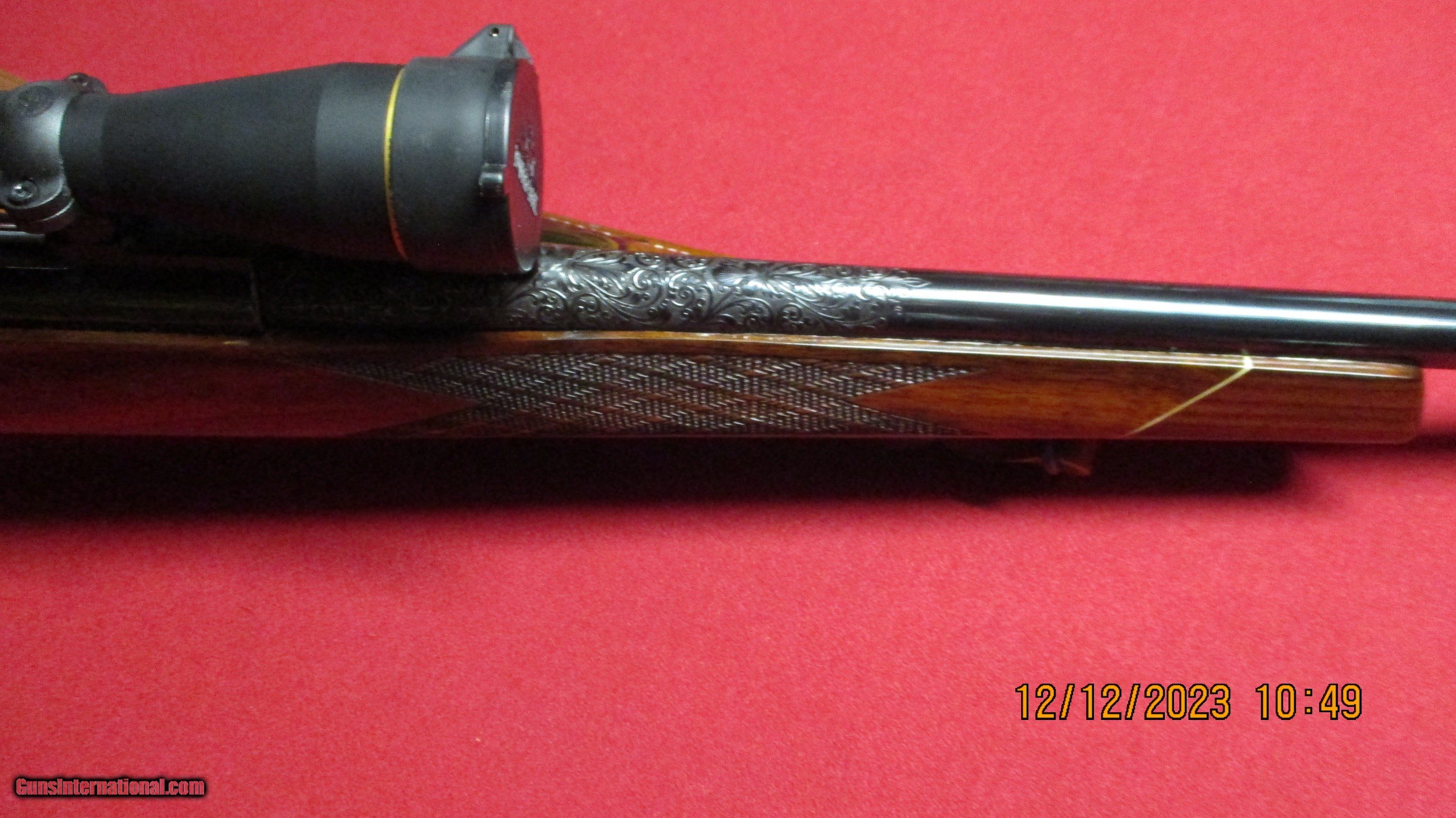 Description: Custom Weatherby Mark V Deluxe Left Hand Bolt Action Rifle. Serial #P53500, 300 Weatherby Magnum,24" barrel with an excellent bore. The metal surfaces retain 99% quality maker blue with crisp markings, the fluted bolt body remains bright, there is a bright damascened pattern on the follower and the numbers-matching smooth-knob bolt handle and receiver have deep plum undertones.The barrel is a later addition and has been expertly-engraved with about 6" of flowing scroll projecting out from the breech and a small wedge on top of the muzzle,"HERITAGE 300 WEATHERBY" is marked inside the engraving on the left side. The high gloss checkered walnut Monte Carlo stock with right side cheekpiece is very good with deep, rich color throughout. There are scattered handling marks typically associated with a hunted arm and basket weave checkering is sharp with rosewood forend tip and grip cap.Leupold VX-3i 2.5- 8x36 Matte 1" Duplex 170678 scope, Leupold 2 piece backcountry scope mounts integral 30mm rings Weatherby Mark V matte black. Hunter custom padded deer design leather rifle sling brown. This is a solid custom West German Weatherby with attractive accents in a potent hunting caliber.(Dr. James D. Morgan Collection) Ml-3 SOLD Rifle Caliber: .300 Weatherby Magnum Manufacturer: Weatherby Model: MarkV Serial Number: P53500 Condition: excellent Metal Condition: excellent Wood Condition: excellent |