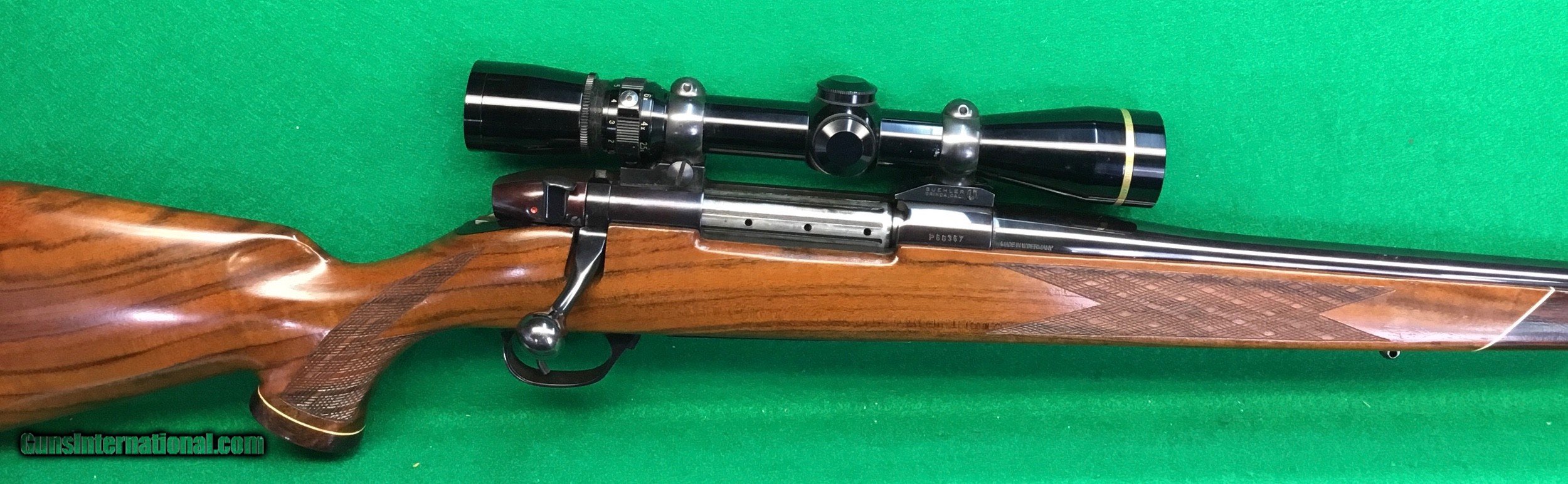 Description: Early German Mk-V with absolutely stunning wood in 300 Weatherby. 24 inch barrel showing a touch of blue wear at the muzzle. complete with Leupold 2.5-8X Var-X lll scope in classic Buehler mounts. Shows little sign of being fired. $1498 includes insured shipping. Lengthy Layaway available. No credit cards and no trades. SOLD |