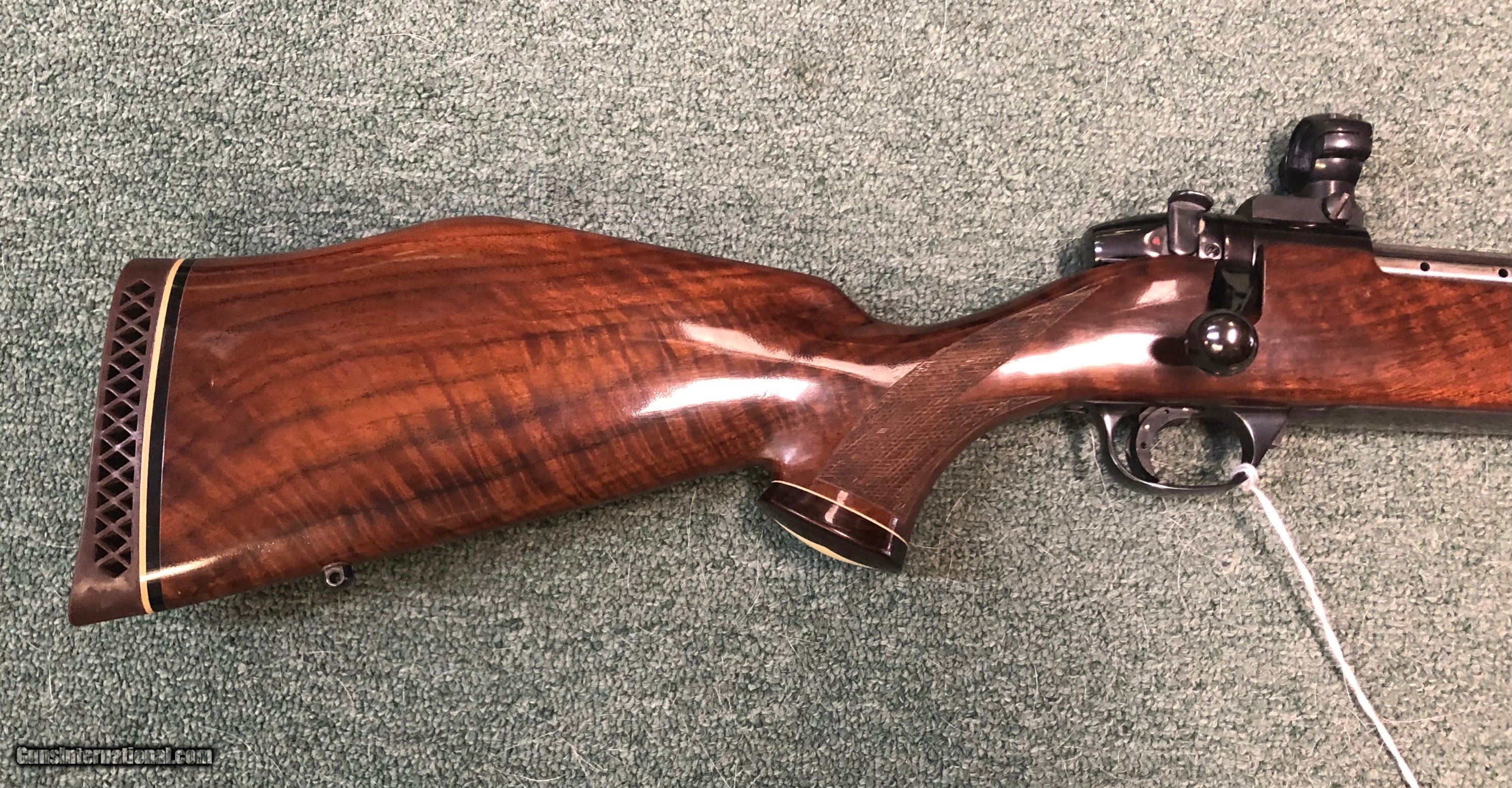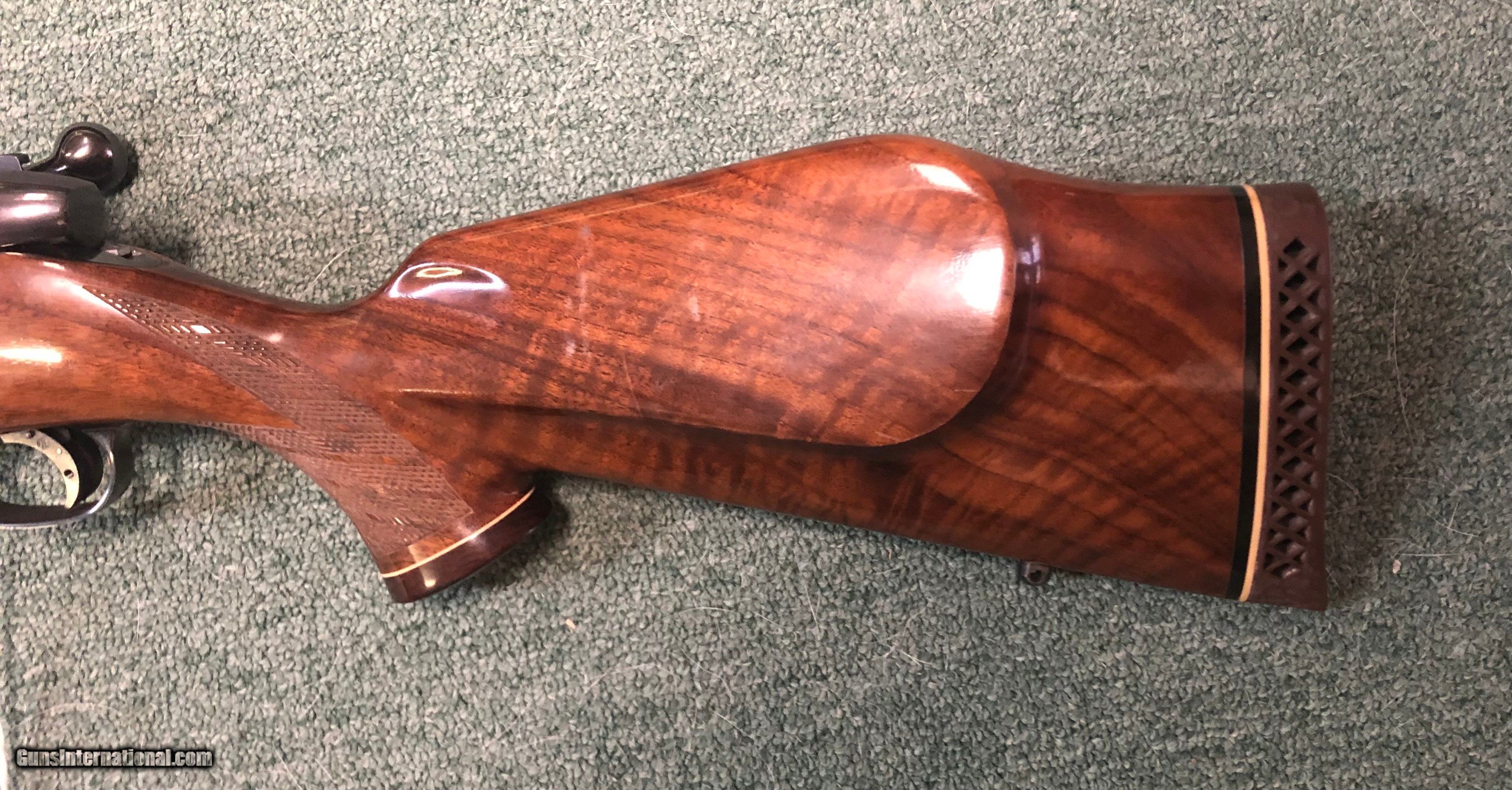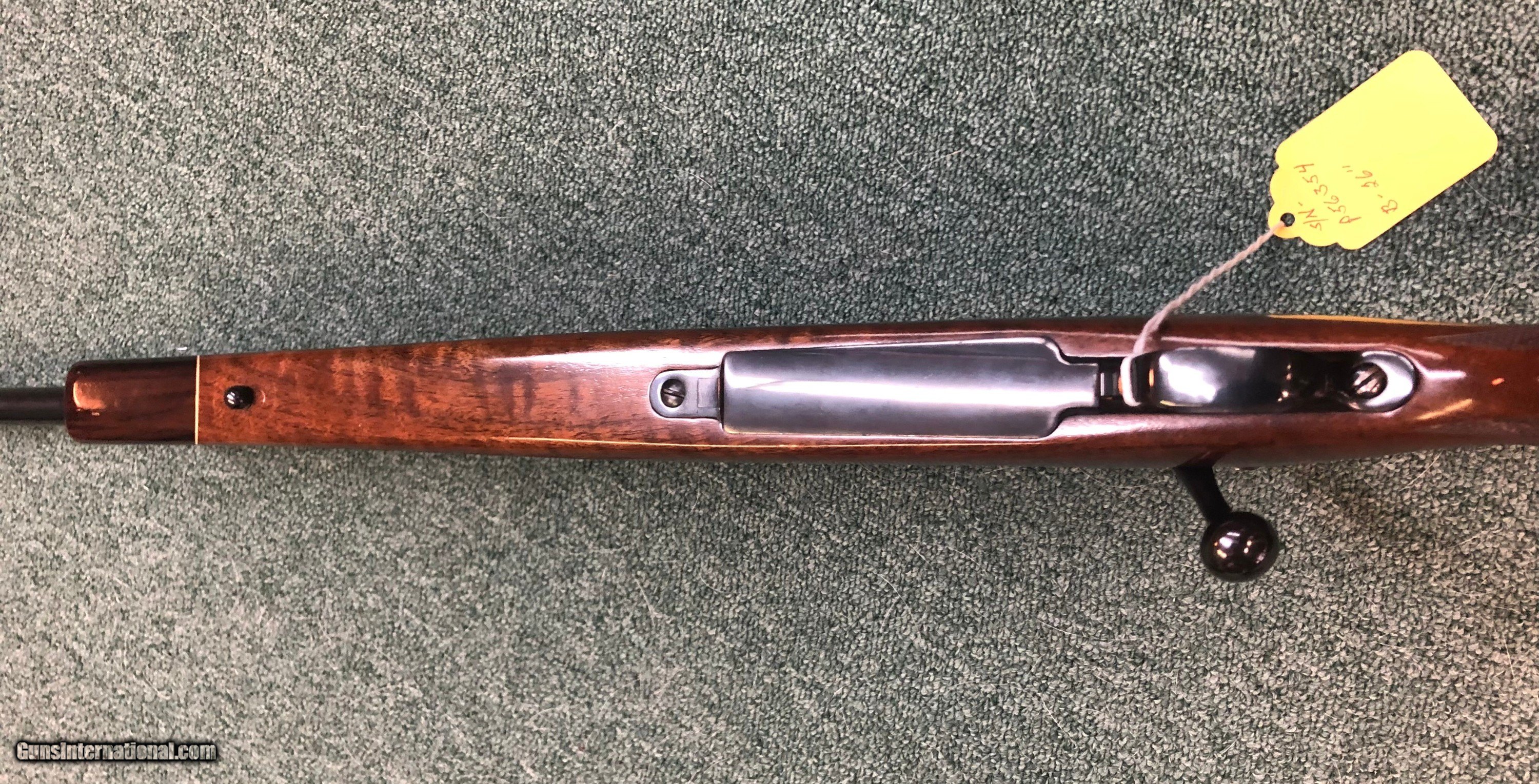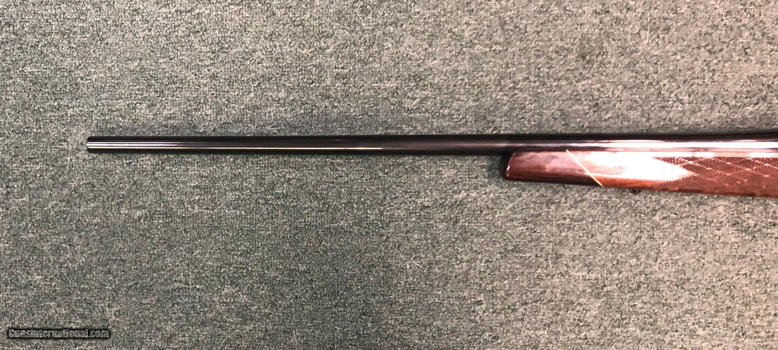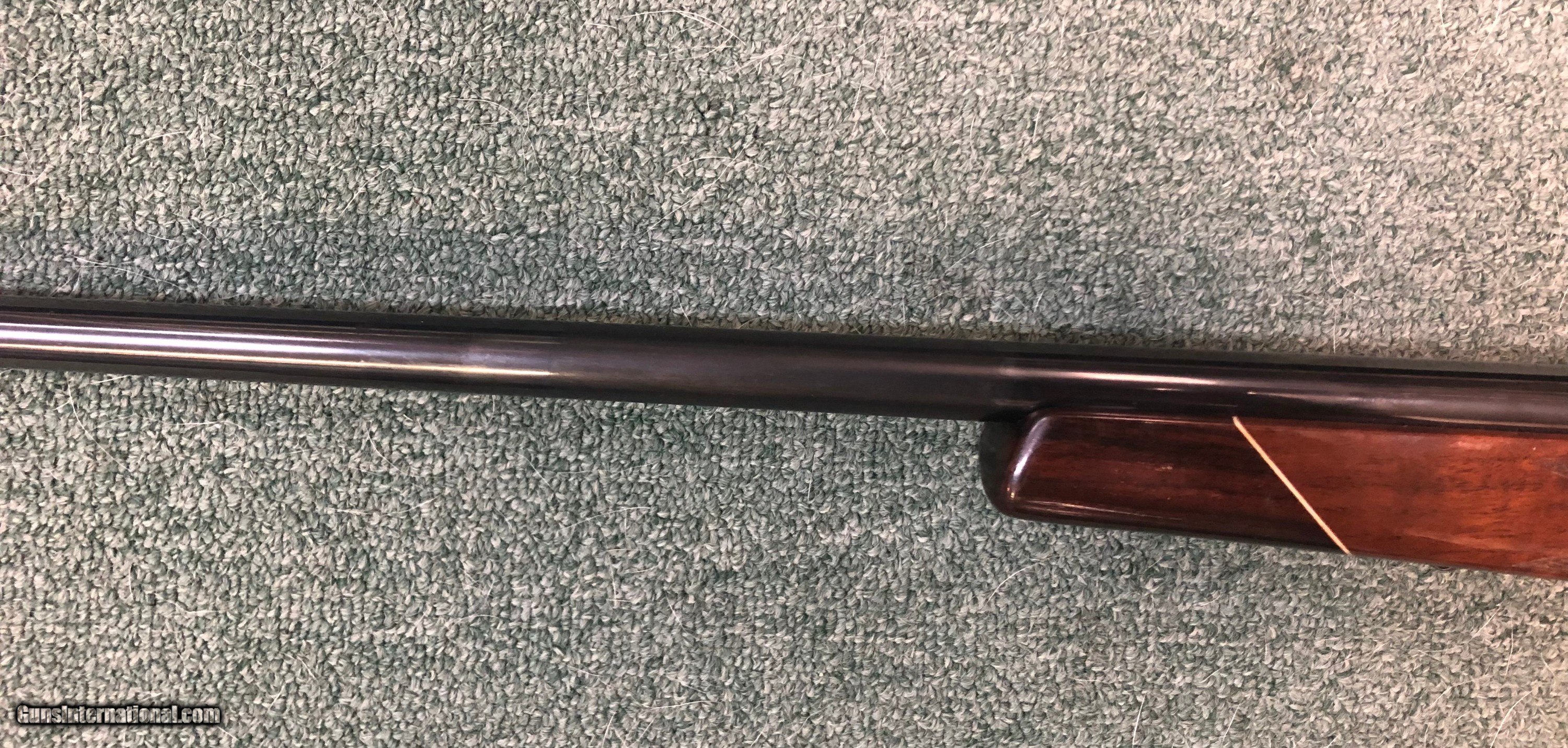 Description: Estate item, Weatherby 240 Weatherby magnum. Made in Germandy. Very good condition overall. A small area of the 26" barrel was cold blued for an unknown reason. The area is about 4" on the left side just in front of the end of the stock. The rest of the blue finish is all original. No cracks or major dings to the stock. Mat Canjar set trigger. 13.5" LOP, scope mounts in place. The bore is very good plus. S/N - P5635 S/H - $45.00 CON US, C/C Fee 4% SOLD Rifle Caliber: .240 Weatherby Magnum Manufacturer: Weatherby Model: Mark 5 Serial Number: P56354 Barrel Length: 26 Condition: Very Good LOP: 13.5 |