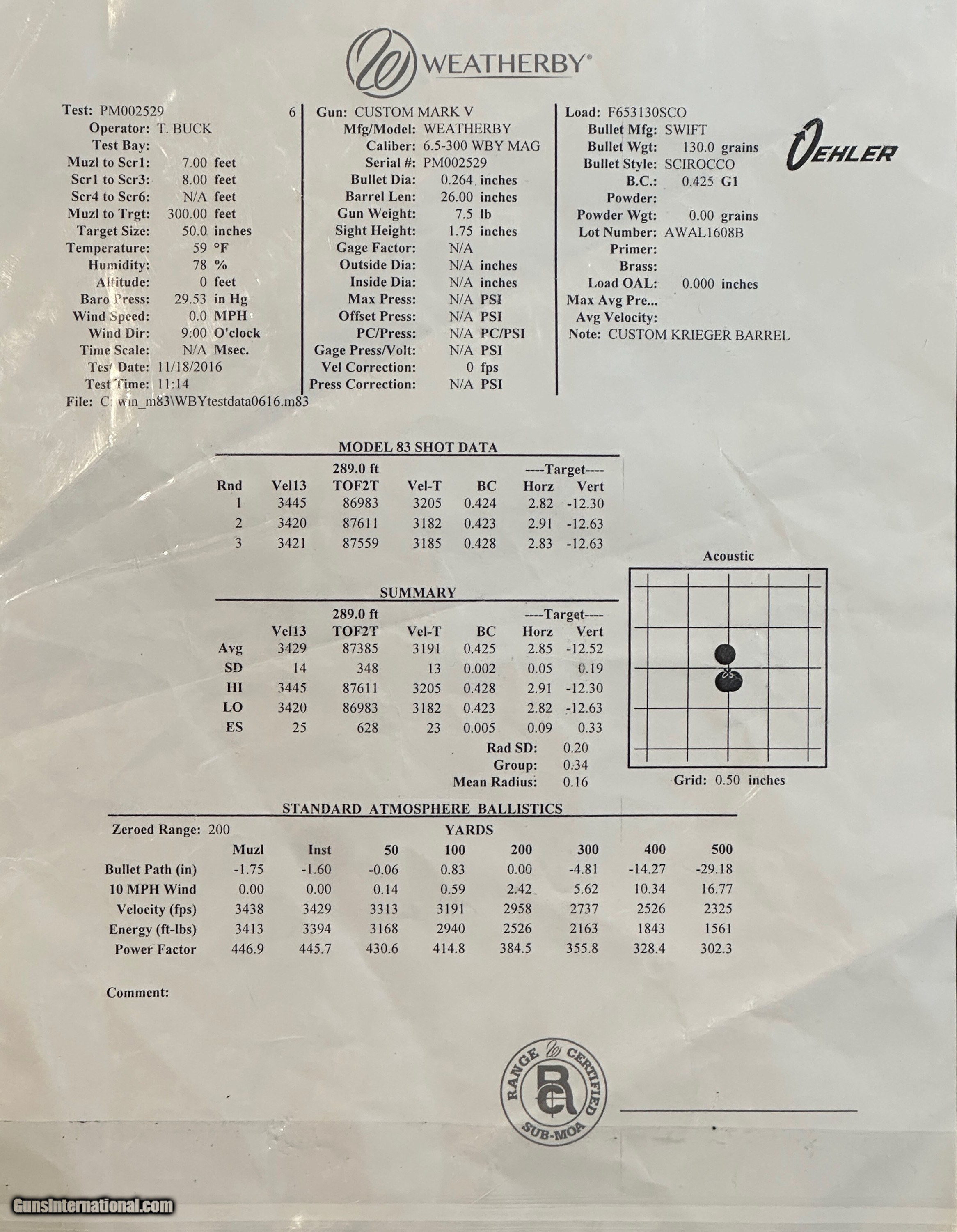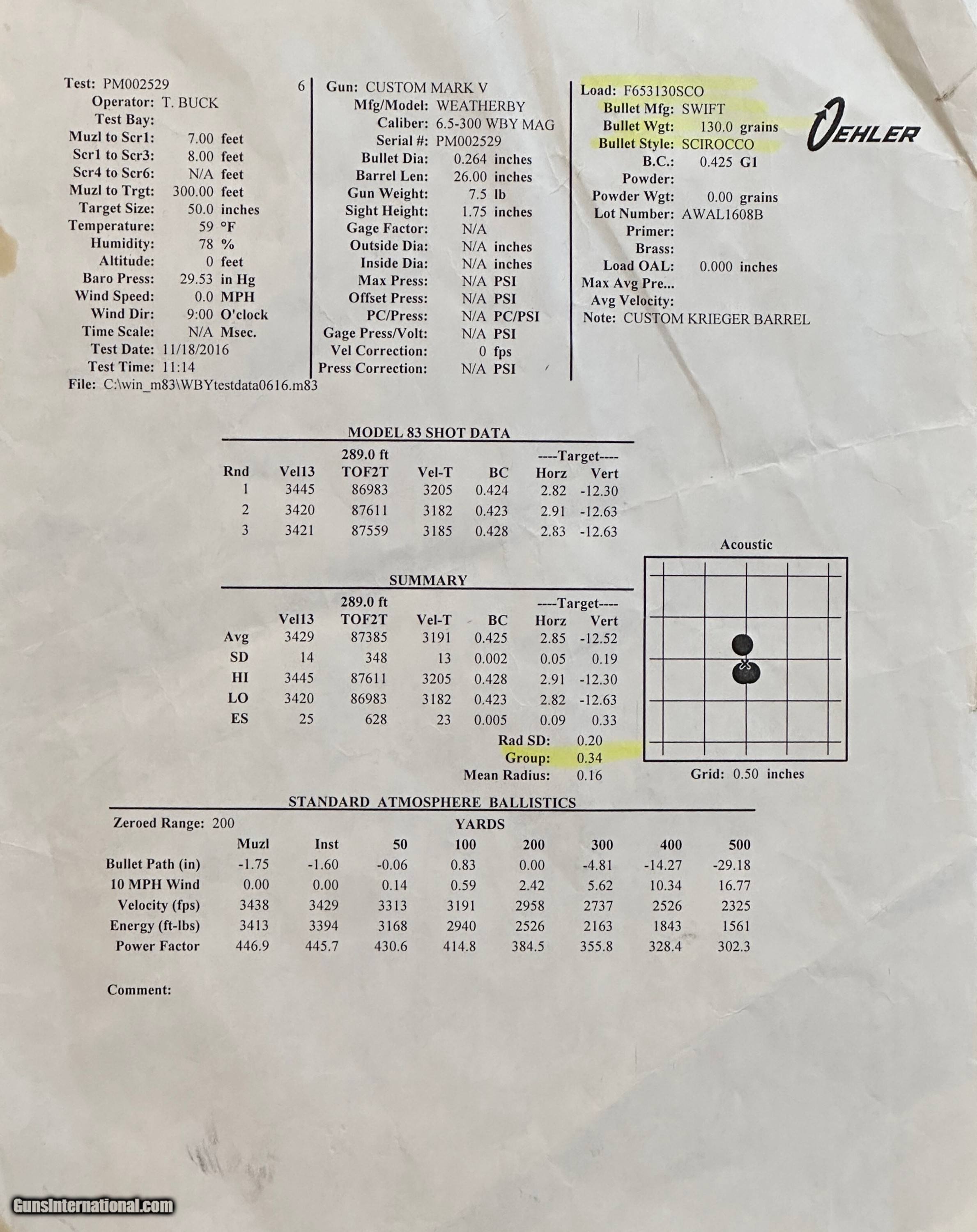 Rifle Caliber: 6.5-300 Weatherby Magnum Manufacturer: Weatherby Custom Shop Model: Mark V Custom Serial Number: PM002529 Barrel Length: 28 w/o brake Condition: Pre-owned Price: $4,200.00 Shipping: $55.00 Buy Now Contact Seller |