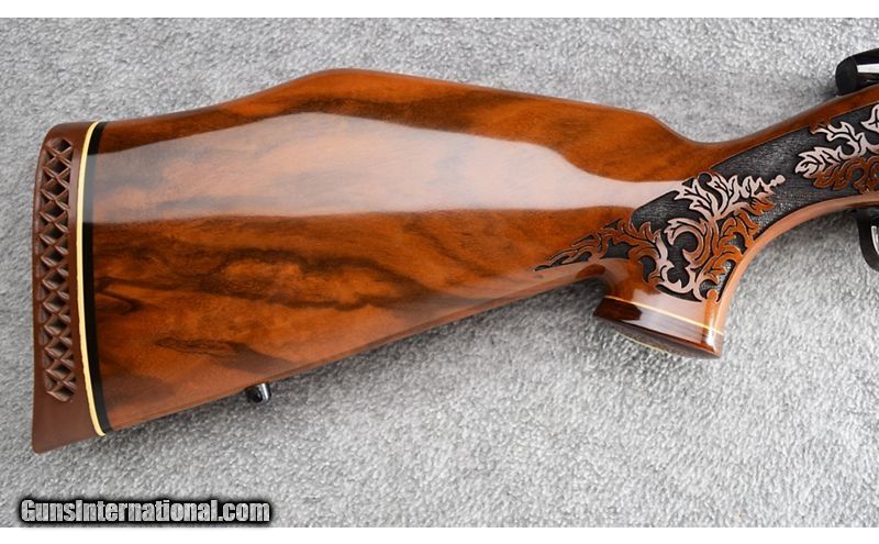 Description: The Japanese manufactured Weatherby Mark V was manufactured between 1972 and 1994. This gun remains in beautiful condition showing only some light use. Wood has beautifully figured high grade walnut, Blue is excellent but has some residual Loctite on top of receiver where scope was. Bore is excellent. No box. Absolutely beautiful! .300 Weatherby Magnum SOLD Metal Condition: Excellent Wood Condition: Excellent Bore Condition: Excellent Barrels: 24 Triggers: Factory Stock Dimensions: 13 1/2" LOP Fore End: Checkered High Grade Walnut with Rosewood Pistol Grip Cap - Checkered High Grade Walnut Forend with Rosewood Forend Cap Butt Pad: Weatherby Brown Vented Rubber Butt Pad Weight: 6 lbs Sights: None - Factory Drilled Item Location: Wheeling |