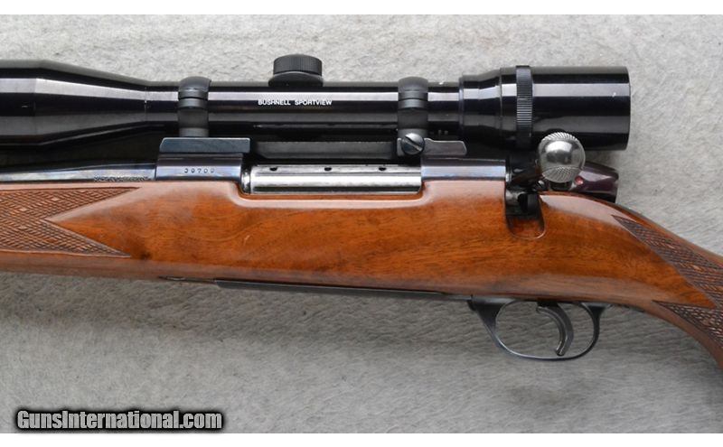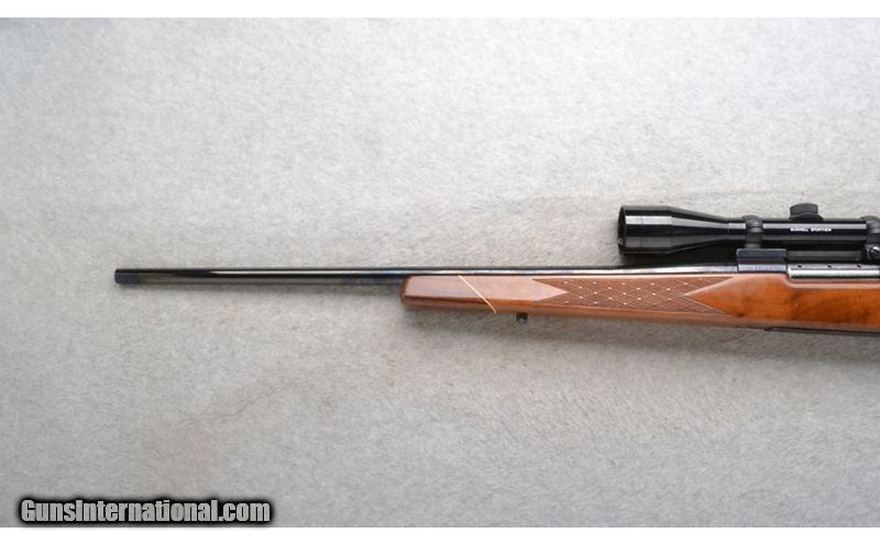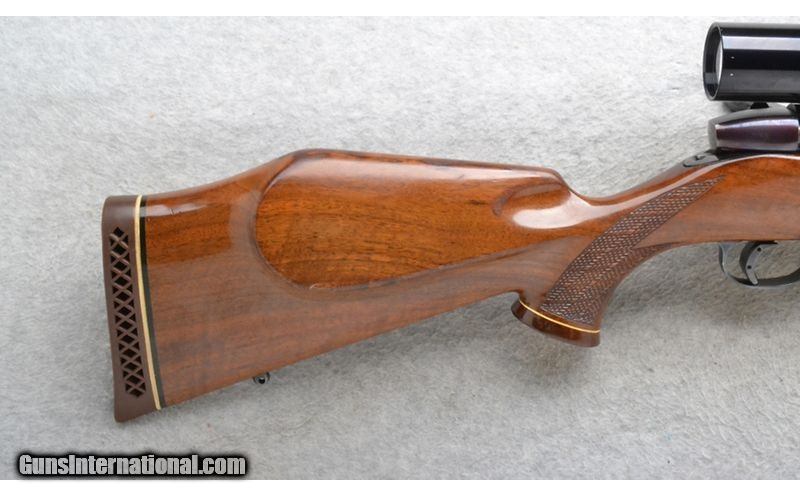 Description: This Weatherby Model Mark V is a left hand bolt action rifle in .257 Magnum Cal. It has a 22 inch barrel. It is outfitted with a Bushnell Sportview Scope. The butt stock is a diamond checkered grip walnut pistol grip with a raised cheekpiece and rosewood cap. The forearm is a diamond checkered grip walnut with a rosewood tip. Made in W.-Germany. .257 Weatherby Magnum SOLD Chambers: Internal Magazine with a hinged floorplate. Metal Condition: Barrel has a very small light rust spot left side 2 inches in front of the scope. Wood Condition: Good. Some minor handling marks and minor finish blemishes. Bore Condition: Excellent. Barrels: 22 inch. Stock Dimensions: LOP 13 3/8 inches. Fore End: Diamond checkered grip walnut with a rosewood tip. Butt Pad: Weatherby brown rubber recoil pad. Weight: 8 lb. 14 oz. Sights: Bushnell Sportview Scope. Item Location: Richfield, WI |