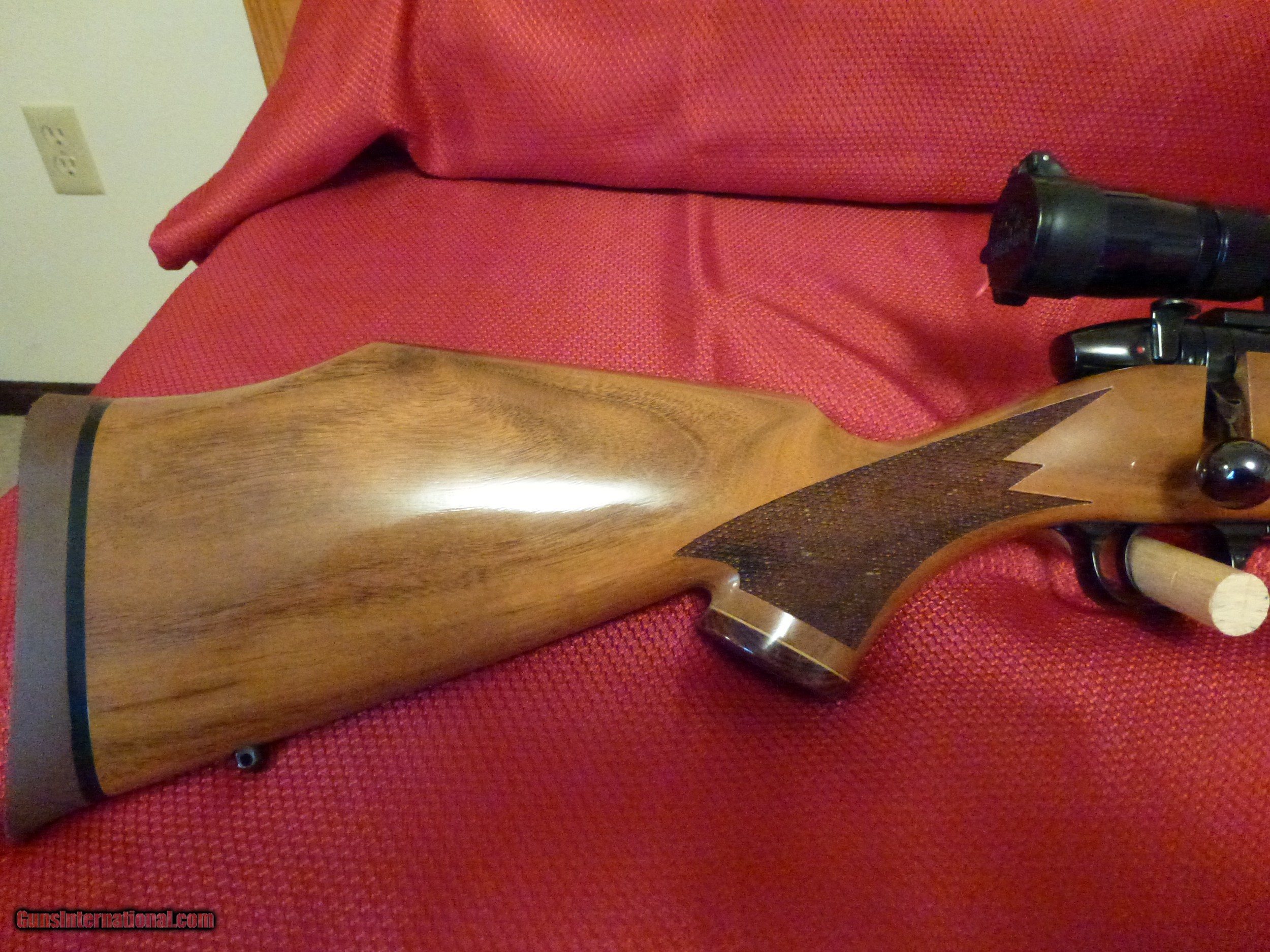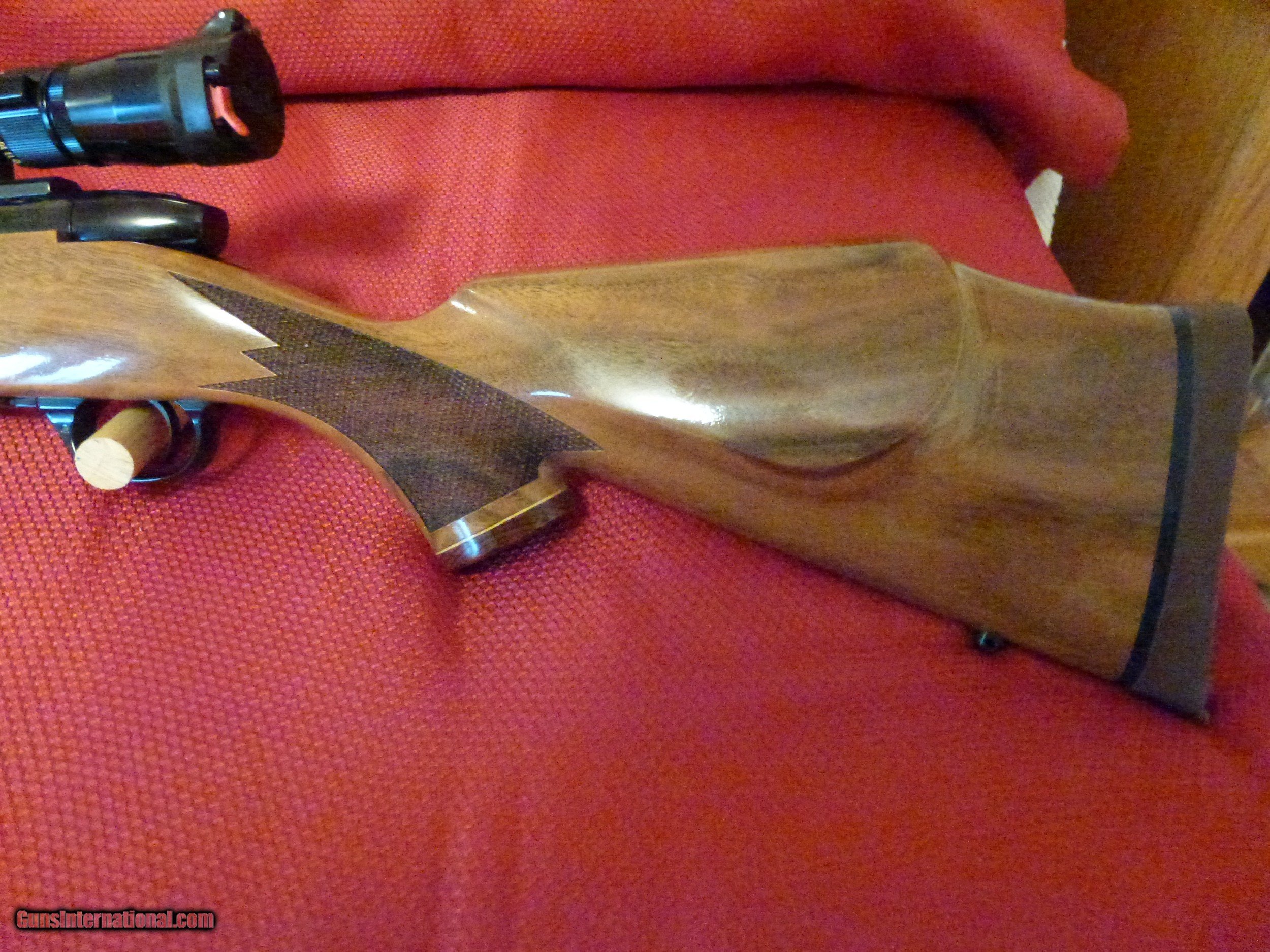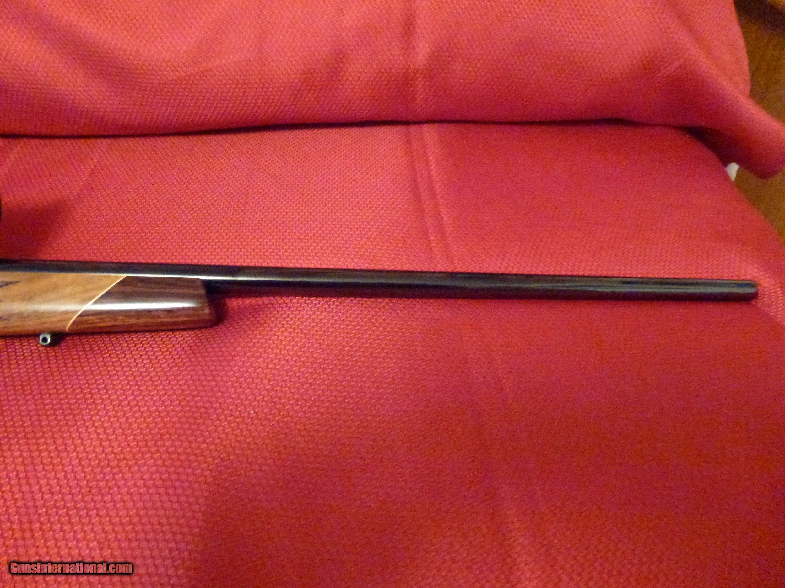 Description: This is a beautiful Weatherby Mark V bolt action rifle in the popular .257 WBY MAG caliber. The rifle has a Nikon Monarch UCC 4-12X scope in Leupold mounts with Butler Creek scope covers. There are a couple of finish nicks in th grip cap and a 3/4 inch by 1/8 inch compression mark on the right side of the forearm just above the front end of the checkering. The rest of the gun looks as it did when it left the factory. The receiver is marked MARK V Weatherby ATASCADERA, CA. MADE IN U.S.A. The rifle has a 26 inch barrel and a 1 in 10 inch twist so it will stabilize the heavier bullets. Please e-mail any questions that you may have as NO RETURNS ARE ALLOWED. I will pay to ship and insure this item to your FFL. SOLD Rifle Caliber: .257 Weatherby Magnum Manufacturer: Weatherby Model: Mark V Serial Number: SB060584 Barrel Length: 26 Bore: 10 twist Condition: Excellent Metal Condition: 99% Wood Condition: 98% Bore Condition: Excellent Barrels: 26 inch Action: Bolt Rifle Stock: Checkered Gloss Walnut Fore End: Rosewood Butt Pad: Weatherby LOP: 13.5 inches Finish: Blued |