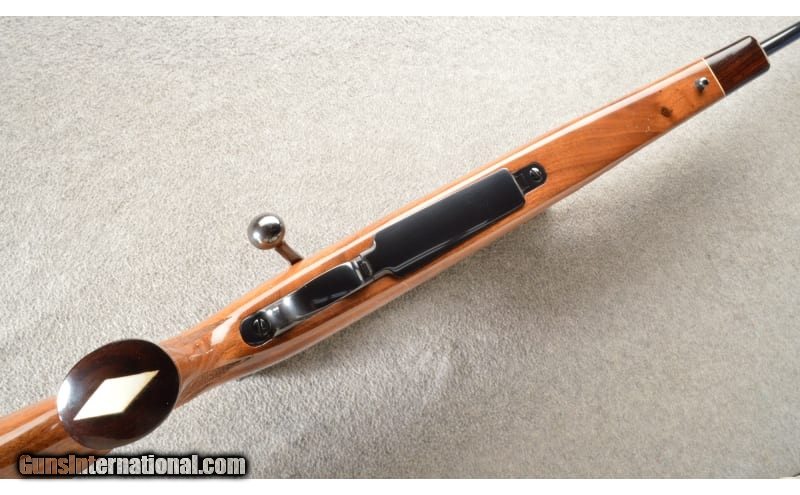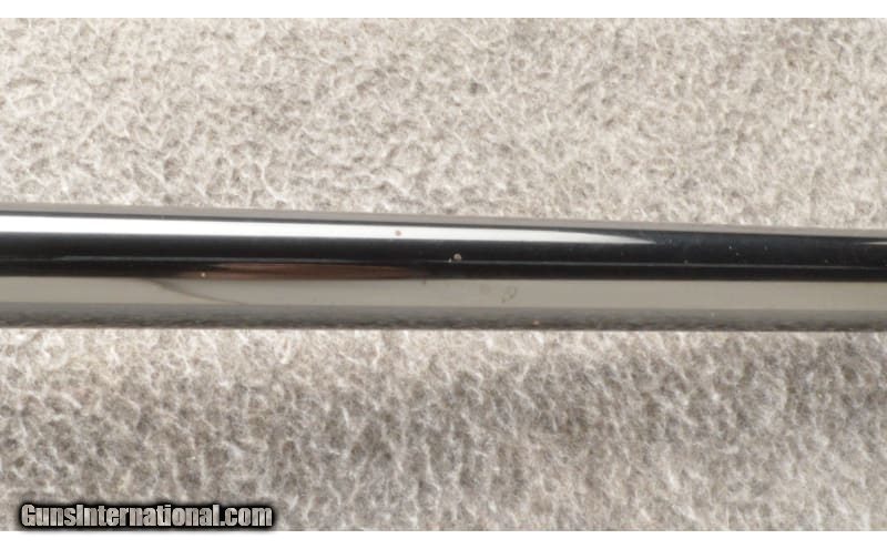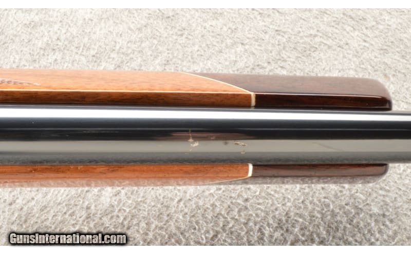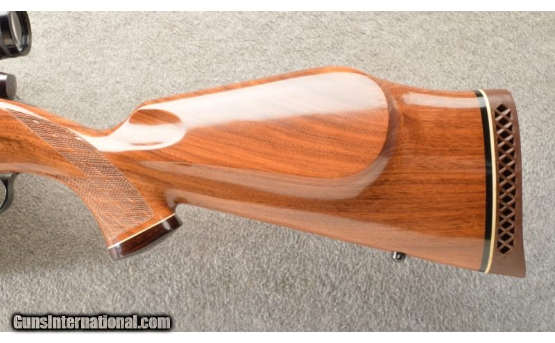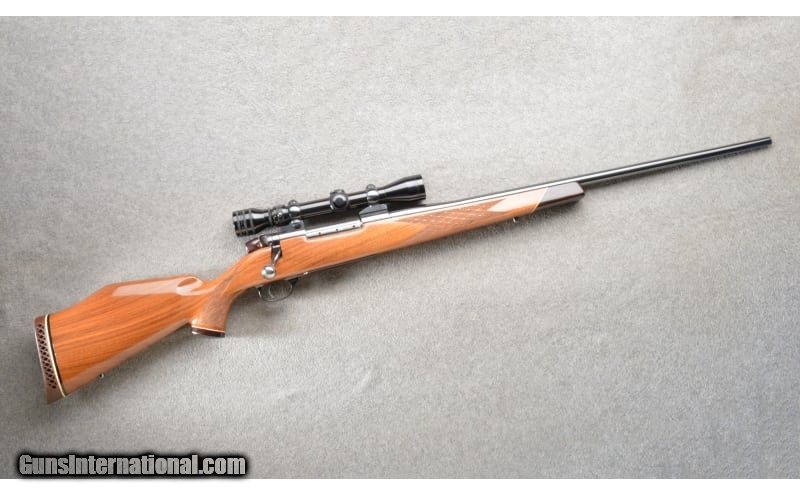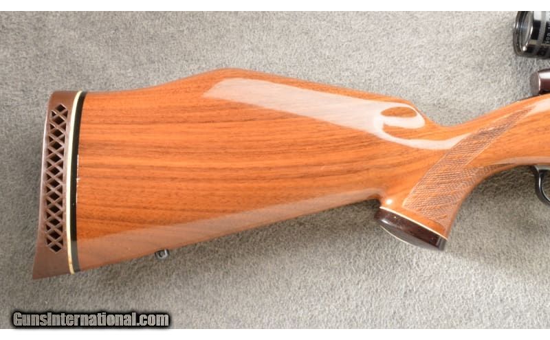 Description: Weatherby Mark V bolt action rifle chambered in .270 Weatherby magnum with a gloss blued finish and 24" barrel. The left side of the barrel shank is marked "Weatherby / .270 MAGNUM". The right side of the chamber ring is marked with the serial number "P29252". The left side of the receiver is marked "MARK V", "Weatherby", and has three pin markings at the rear. The right side of the barrel shank is marked "MADE IN W. GERMANY". The top of the receiver has a pair of bases and rings holding a REDFIELD 2X-7X scope. The stock is one piece skip-line checkered walnut with a high gloss finish, a raised Monte Carlo comb with a cheekpiece, a capped pistol grip, and a solid brown rubber Weatherby recoil pad. This has a rosewood grip cap with tan spacer and a tan diamond piece at the bottom of the grip. There also is a rosewood nose cap with a tan spacer. There is sling stud in the belly and on the forend. This gun is in lightly used excellent condition. .270 Weatherby Magnum SOLD Chambers: Bolt action. Metal Condition: 99%. A couple scratches on top of the barrel and a few scattered corrosion freckles by the muzzle. Wood Condition: "98% - 99%. Fine handling marks with a couple scratch marks by the left side trigger guard, nothing major. Bore Condition: "The bore is bright, and the rifling is sharp. Barrels: 24" barrel. Triggers: Single. Stock Dimensions: LOP 13.5". Fore End: Checkered. Butt Pad: Rubber. Weight: 8.5 lbs Sights: Scope. Item Location: Owatonna, MN |