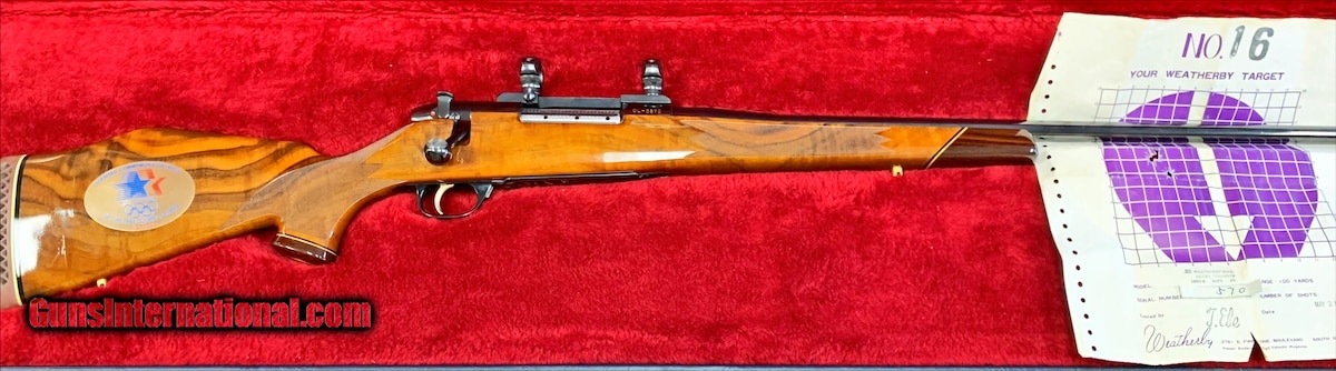 Description: Guns Listing ID: 647711 Weatherby Mark V 1984 Los Angeles Olympic Games 1 of 1000 Commemorative Bolt Action Rifle with Case Manufactured in 1984. The barrel is manufactured without sights. The receiver is tapped and drilled from scope mounting. Jeweled fluted bolt, checkered bolt knob and gold wash trigger. The lettering is all gold accented and hinged floor plate is gold accented in floral design with a banner marked \"XXIIIrd OLYMPIAD-1984\ SOLD Manufacturer: WEATHERBY Model: MARK V Caliber Info: .300 WBY MAG Condition: Used - Non-Certified Barrels: 2.6 BARREL Finish: WOOD |