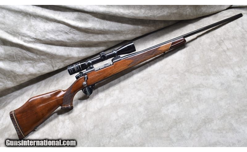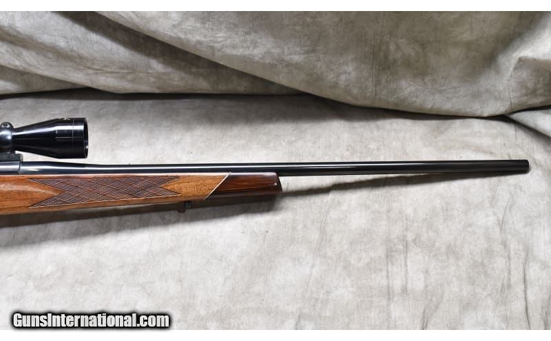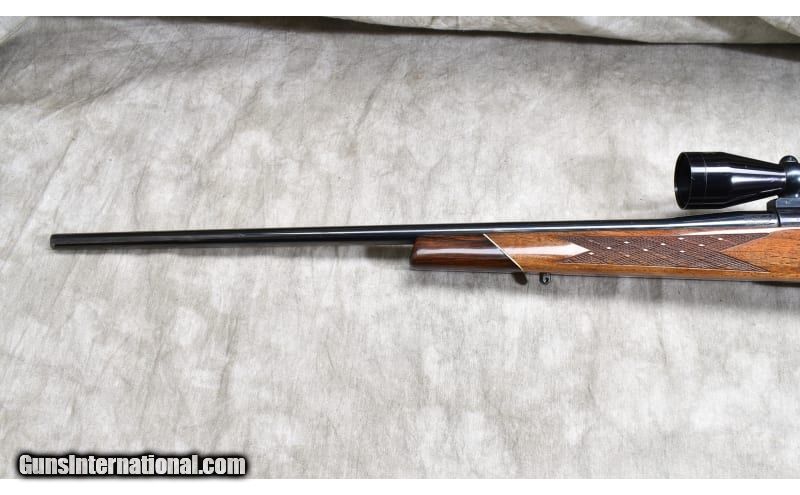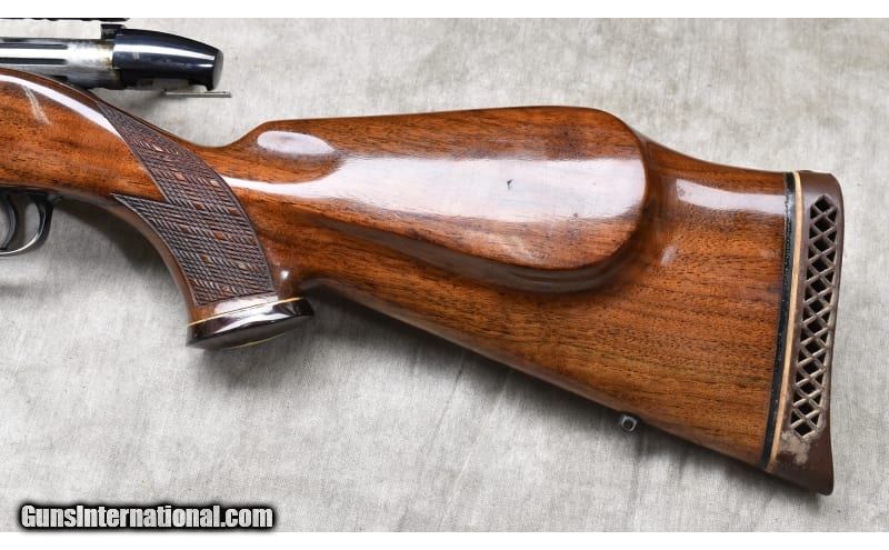 Description: This rifle features very nice Monte Carlo walnut stock with skip line checkering, rosewood tip and grip caps. The bolt is the low lift 9-lug design. It is no rack rascal, but it is in good repair. .300 Weatherby Magnum SOLD Chambers: 4 Metal Condition: "Good. Blue is good, but there are handling scuffs on the barrel and the floor plate. Wood Condition: Good. There are a number of small handling marks. None appear through the finish. Bore Condition: "Shiny, but a little dark. Barrels: 24-inch Triggers: Factory trigger Stock Dimensions: 13-1/4 inch LOP. Fore End: Rosewood tip and grip caps. Butt Pad: Ventilated rubber pad. Weight: 9 lb - 1 oz Sights: "Set up for scope, outfitted with a vintage Weatherby Premier 3x9 power scope. Item Location: Rogers |