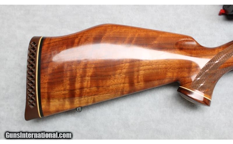 Description: Weatherby Mark V Bolt Action Rifle .300 Weatherby Magnum. This Weatherby Mark V Deluxe was manufactured in West Germany by J.P. Sauer and remains in excellent condition. Features a 24-inch black finish steel barrel, with 3 Round magazine. The rifle is based on a 9-lug, push-feed action that has long been considered the strongest action in the world. The bolt has a very short rotation of 54° allowing for quicker reloads and the ability to mount scopes as close to the bore as possible. The forged, one-piece bolt is fluted and has relief ports and a full shroud to protect the user in the case of an ammunition failure. A smooth and silent two-position safety also serves as a bolt lock when in the 'SAFE' position. .300 Weatherby Magnum SOLD Metal Condition: Excellent with finish worn at muzzle. Wood Condition: Excellent with very minor handling marks Bore Condition: Bright Barrels: 24 inches Triggers: Factory Stock Dimensions: LOP 13 1/2 inches Fore End: Double Skip Line Checkered Pistol Grip with Rosewood Pistol Grip Cap & Monte Carlo Cheek Piece - Double Skip Line Checkered Walnut with Rosewood Forend Cap Butt Pad: Rubber pad Sights: Weatherby 3-9X Scope Item Location: La Vista, NE |