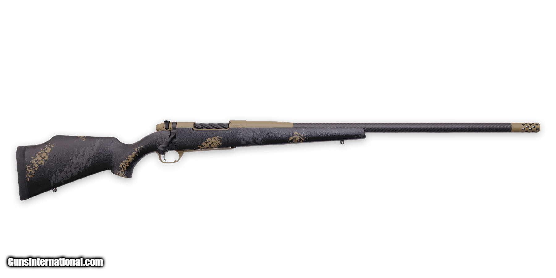 Description: Guns Listing ID: prod284103 Using a 416R stainless steel match barrel roll-wrapped with a carbon fiber sleeve loaded under tension to create strength and reduce overall weight. 95% of the carbon fiber does not touch the barrel allowing air to foil around the steel and rapidly cool the barrel, adding rigidity and reducing overall weight. This creates an incredibly strong barrel that dissipates heat very well and provides consistent accuracy with high shot counts. The 5/8×24 threaded barrel accepts a muzzle brake or suppressor to increase your shooting experience. - CALIBER .300 WBY MAG - MAGAZINE INTERNAL 3rd capacity - BARREL 28” (26\" barrel + 2\" muzzle brake), #4 Tensioned Carbon Fiber - MUZZLE 5/8x24 TPI w/Accubrake ST - TRIGGER Trigger Tech - STOCK Monte Carlo Fiberglass Stock SOLD Manufacturer: WEATHERBY Model: MARK V CARBONMARK Caliber Info: .300 WBY MAG Condition: new Barrels: 28 BARREL Finish: BLACK WITH TAN AND GREEN SPONGE PATTERNS |