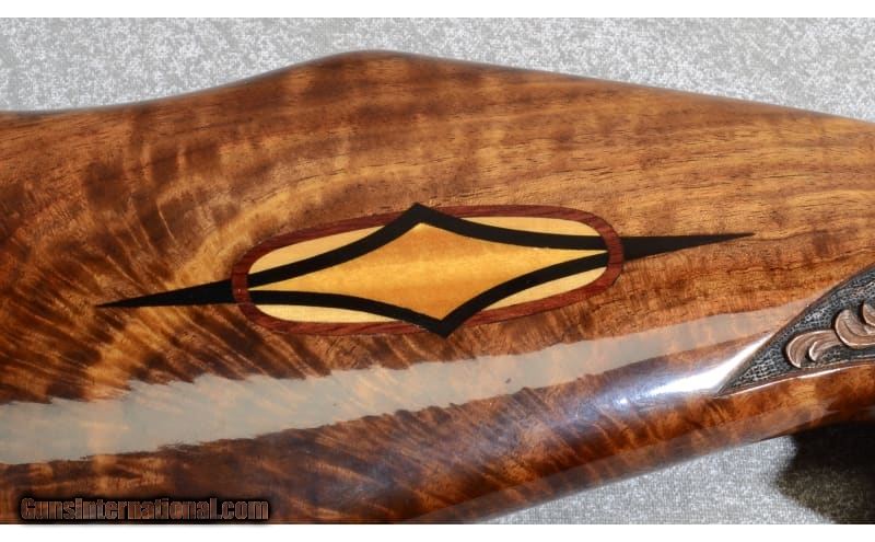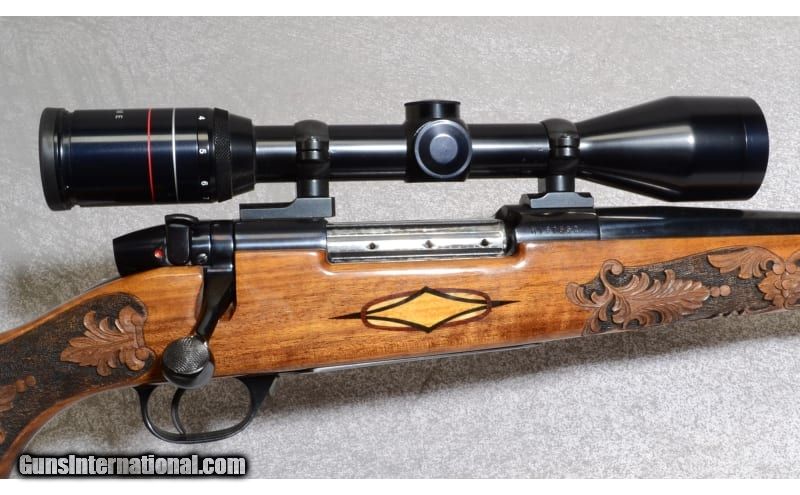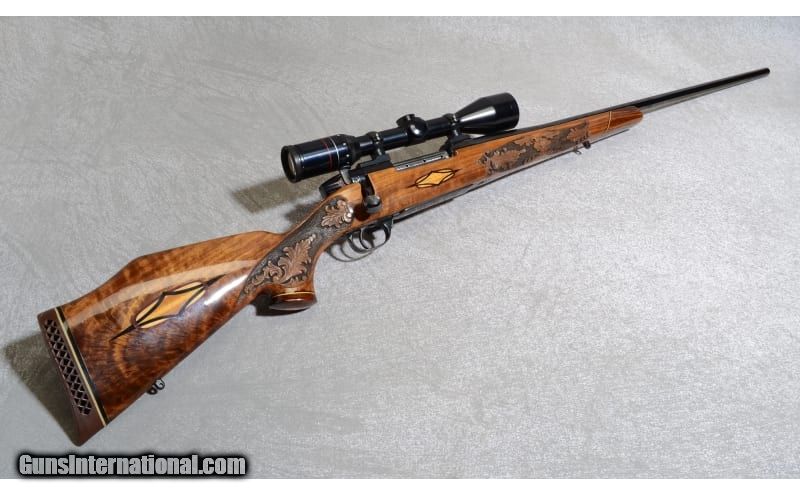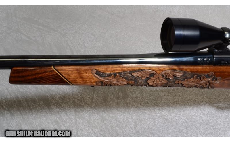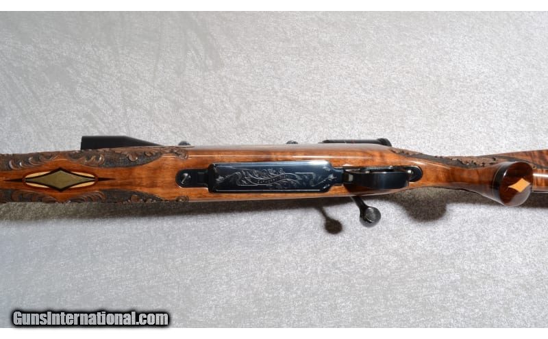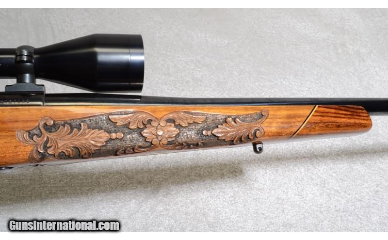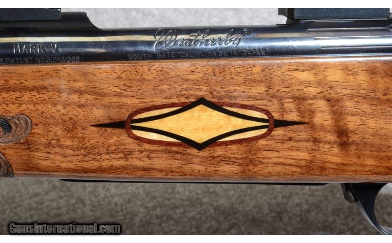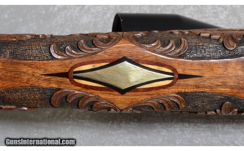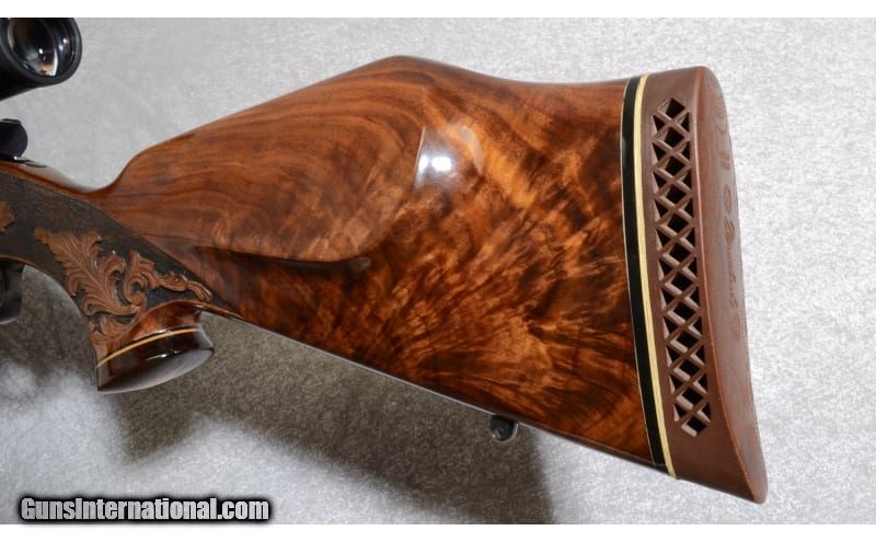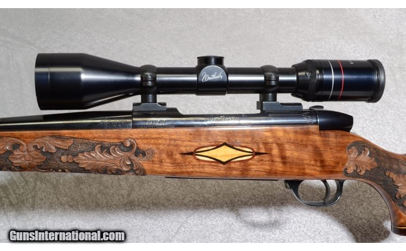 Description: This dangerous game rifle comes with a 26" Barrel dark blued and high polished. It is chambered in .340 Weatherby Magnum. This rifles stock is also adorned with beautiful hand carving and inlay on the fore end and wrist on the stock. The Weatherby bolt is a Strong 9-lug bolt with jeweled finish as is the follower. The magazine floor plate is engraved with "Weatherby Custom". It was made for Weatherby in Japan. The overall condition of this masterpiece, which has all matching serial numbers, is 99+% with gorgeous select high gloss claro walnut with strong detail in the grain and a factory original correct recoil pad.?It has a Weatherby Supreme 3-9 x 44 . The bore is bright and glossy and the factory original bluing is deep and brilliantly polished.?This is the finest example of a highly desirable piece for the serious Weatherby collector or dangerous game hunter. .340 Weatherby Magnum SOLD Metal Condition: Excellent Wood Condition: Beautiful Claro Walnut with Wood Inlays and Hand Carved Oak Leaf Motif with Rosewood Fore Cap and Pistol Grip Cap. Bore Condition: Excellent Unfired Barrels: 26"Deep Blued High Polished Barrel Stock Dimensions: 13 5/8" LOP Fore End: Hand-Carved Oak Leaf Motif Weight: 10 1/2 Sights: Weatherby Supreme 3 - 9 x 44 Scope Item Location: Tulalip, WA |