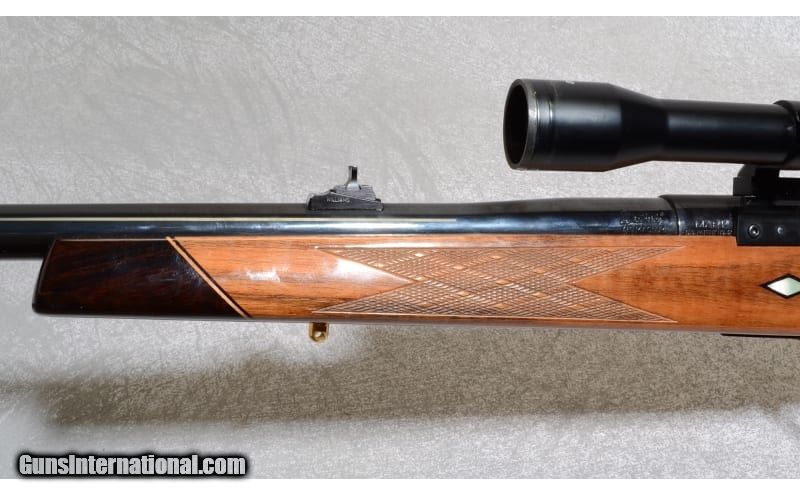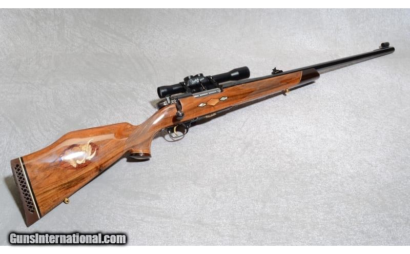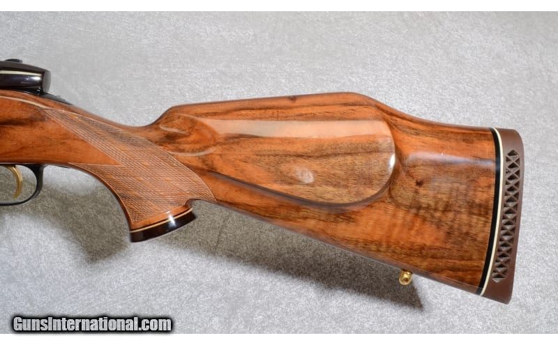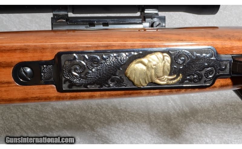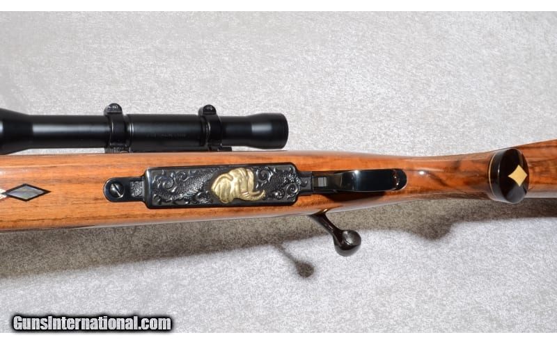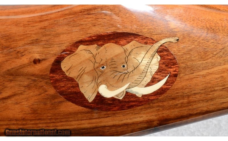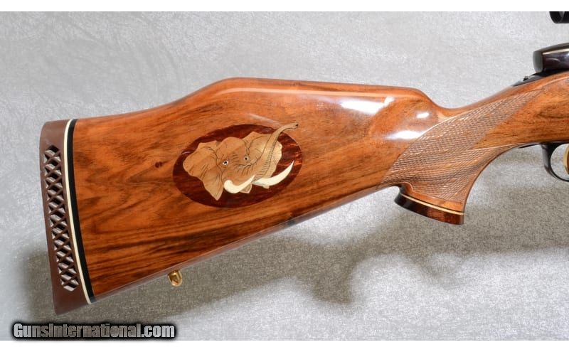 Description: This was the 'top of the line" for Weatherby rifles through 2010, and it comes with skip checkering, hand engraving on the barrel, receiver, scope mounts and scope rings. This beautiful bolt action rifle has a 9-lug bolt and was made in West Germany by J.P. Sauer & Sohn, established in year 1751---probably the second oldest gun maker in the world.? There is a jeweled bolt and follower, and the rifle has all matching serial numbers. The overall condition of this masterpiece is 99+% with gorgeous select woods, mother-of-pearl inlays on the stock and a factory original correct recoil pad.? There is a gold elephant on the hand engraved floor plate, and a elephant inlaid on the stock. The bore is bright and glossy and the factory original bluing is brilliant.?This is the finest example of a highly desirable piece for the serious Weatherby collector. Enjoy the pictures! .460 Weatherby Magnum SOLD Chambers: Bolt Action Metal Condition: High Polished Deep Bluing. Custom Magazine Cover with Gold On Lay Wood Condition: Highly Figured Claro Walnut Monte Carlo Stock Bore Condition: Excellent Bright Bore Barrels: 26" Compensated Triggers: Factory Trigger Stock Dimensions: 13 5/8" LOP Fore End: Skip Checkered with Rosewood Fore Cap with Mother of Pearl Inlay Butt Pad: Factory Butt Pad Weight: 11.5 lbs. Sights: Side Mount Weatherby 2 3/4" x 90 Scope and Iron Sights Item Location: Tulalip, WA |
