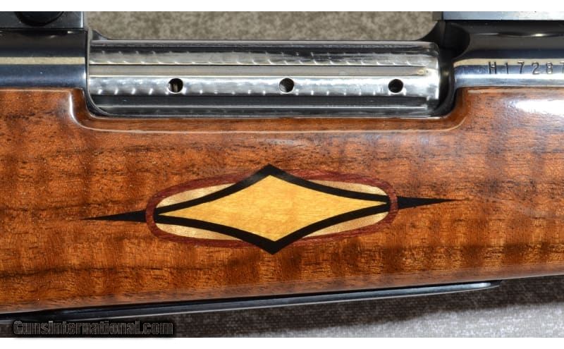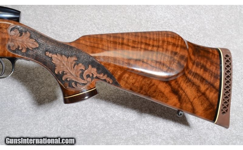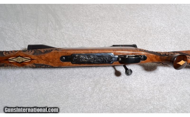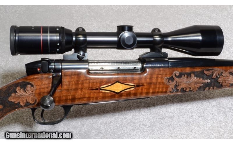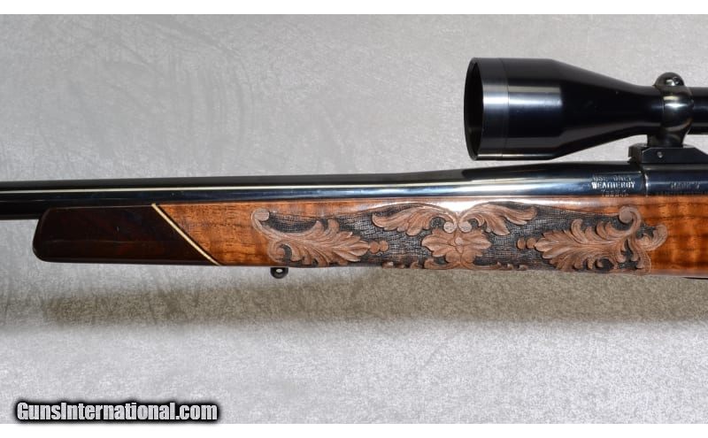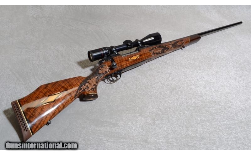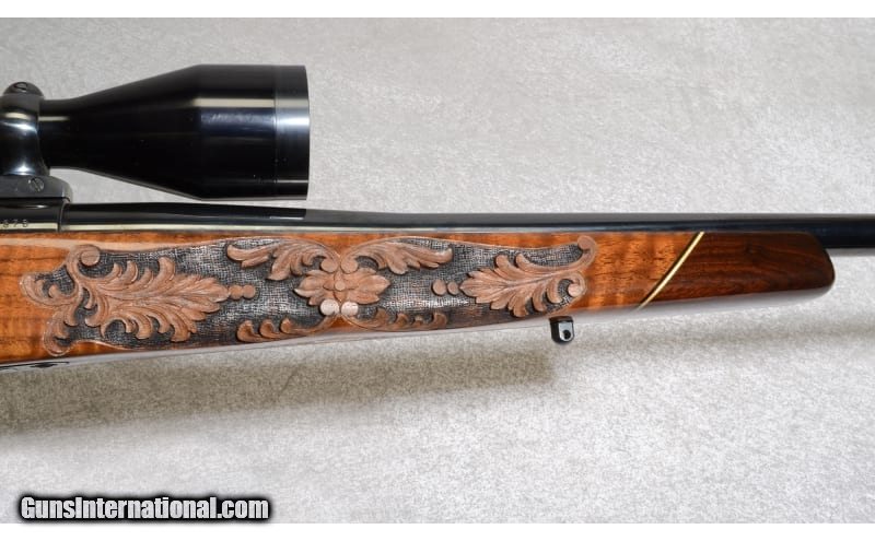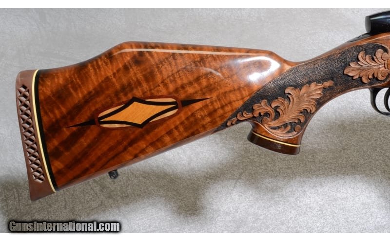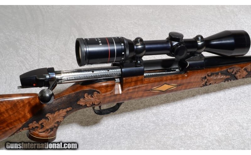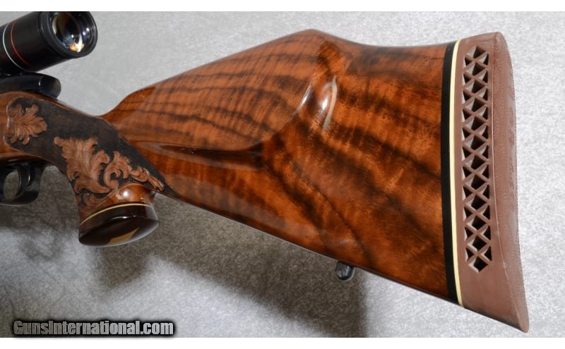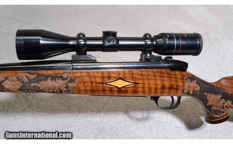 Description: This gun chambered in 7mm Weatherby Magnum cartridge. This example is also adorned with hand carving on the fore end and wrist on the stock with intricate and ornate oak leaves and acorns. There are several inlaid designs on the stock as well as a jeweled follower. This beautiful bolt action rifle has a 9-lug bolt and was made in Japan For Weatherby.? The overall condition of this masterpiece, which has all matching serial numbers, is 99+% with gorgeous select high gloss walnut with deep color and eye catching striping, and a factory original correct recoil pad. 7mm Weatherby Magnum SOLD Chambers: Bolt Action Metal Condition: Excellent High Polished with Deep Bluing Wood Condition: Excellent with Amazing Hand Carving Bore Condition: Excellent Bright and Shiny Barrels: 26 Stock Dimensions: 13 3/8" LOP Fore End: Fine Walnut with Beautiful Hand Carved Design and Rosewood Fore Cap Weight: 10 lbs. Sights: Weatherby Supreme 3 -9 x 44 Scope Item Location: Tulalip, WA |
