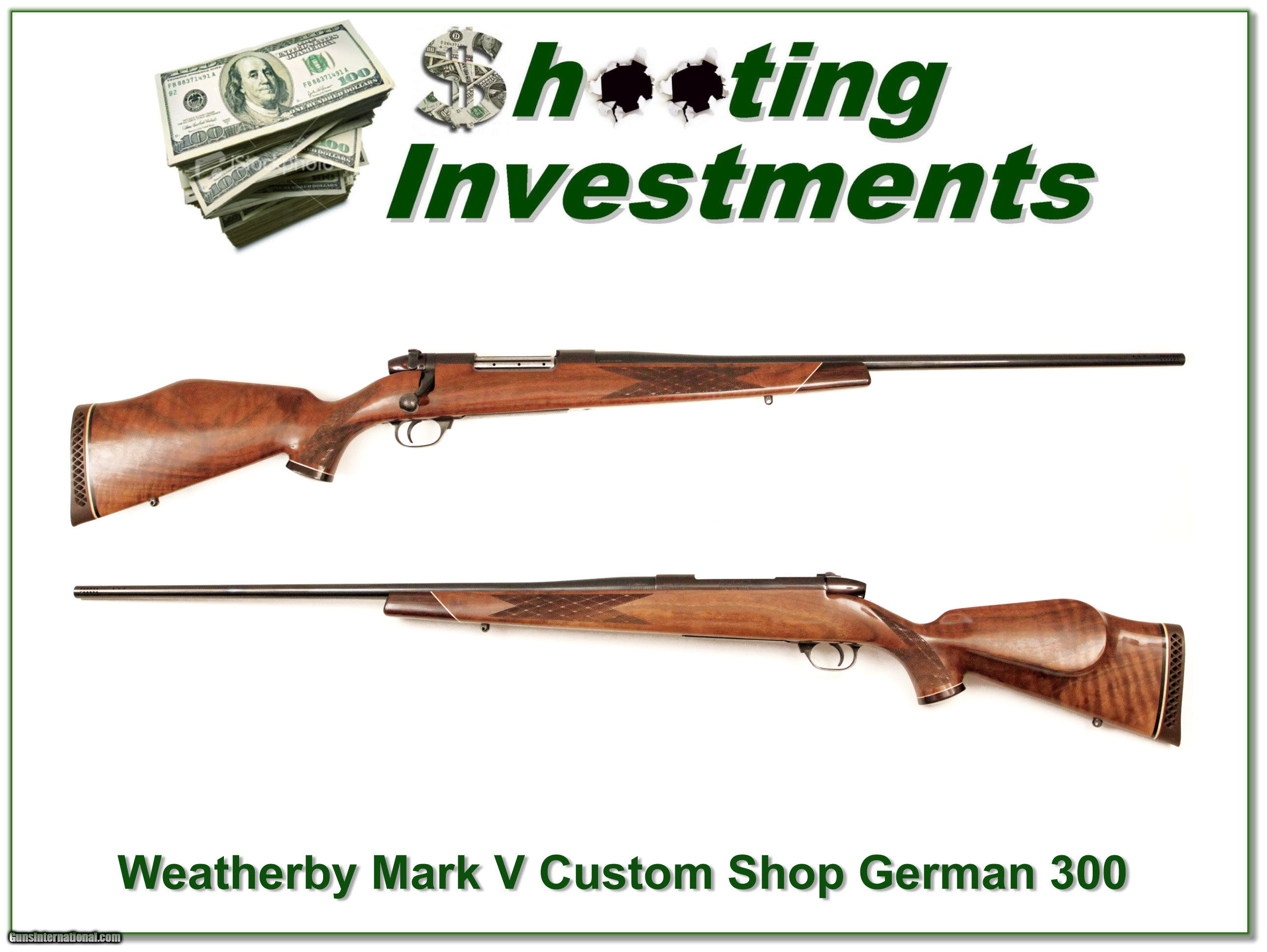 Description: Collectors and hunters, this is a German made Weatherby Mark V Custom Shop gun in 300 Wthy Magnum. It is in excellent collector condition with beautiful wood as shown. It has a harder to find 26in barrel. The Custom Shop guns are getting hard to find. If currently available, the list price would be about $3500. This one is a no-brainer for either a hunter or collector wanting old world quality! I am selling this one on consignment and as such lay-a-way can’t be used. It does of course have the standard 3 day inspection. Shipping and insurance is $45 or $15 more if you want it shipped in a new Plano hard case. Please email me with any questions or larger pictures. (I now consign quality firearms only 10%! Let me know if you have any you would like to sell!) [16-0534] Payment: Payment is by Money Order, Cashiers Check or Personal Check. I can now also accept MasterCard and Visa with a 3% convenience fee. PayPal can be used for some items but never firearms. Please let us know if you would like to pay via PayPal. Shipping: The shipping charge will be listed in each description. It is $35 for most guns. Some heavy guns or those insured for over $2000 will be higher. Shipments to Alaska and Hawaii are higher because air shipment is required. Most firearms are shipped within 5 days of receipt of payment. We prefer shipping at the beginning of the week to avoid firearms in transit over weekends. We package all shipments carefully and insure them for the full purchase price, rounded up to the next $100. In the unlikely event that damage occurs, it is important that you save all packaging material for the claims process. Optics are shipped Priority Mail and most other non-firearm shipments are shipped First Class. Returns: Our return policy is simple. If for any reason you are not pleased with your purchase, you may return your item for a refund. The only exception is ammunition, it cannot be returned. It is important to us that you are happy. Guns cannot be fired or dissembled before returning them and must be returned in the same condition as received. Notification of a return must occur with-in 3 days of receipt at your dealer. Shipping, convenience and dealer fees are not refundable and are the responsibility of the buyer. Lay-a-way: If needed, we offer a 60 day lay-a-way option on most firearms. It is 1/3 now, 1/3 in 30 days and 1/3 in 60 days. Lay-a-way firearm sales are final. Consigning your firearms with Shooting Investments: We will help you get top dollar for your firearms. While most local guns shops charge 20% or more, our fee is only 10% with a minimum of $50. At your local gun shop it might take months to sell. Selling on-line provides instant access to thousands of interested buyers. You won’t find any other on-line dealer willing to sell your firearms for only 10% or listing every gun on 4 separate s. Selling through an House typically costs the seller 15% and the buyer an addition 15% (so 30%) and you have to wait several months to sell and longer to receive funds. If properly priced, we will sell your firearms in a week or two. Send us an email or give us a call and we’ll explain how easy it is for you to get top dollar. Trading: We collect guns and usually just trade for guns we want to add to our collections. We often sell guns for others wanting to purchase one of ours. We find this the most fair to both of us. Our Commission is only 10% and we hold the gun you want until yours sells. Please contact us if you want to sell one of yours to buy one of ours. Help for California Buyers: We are happy to ship to California. It is the buyer’s responsibility to make sure any item you buy is legal in your state. We are also happy to help with your purchase of a firearm from someone other than us. If you see a gun you would like to buy but the seller can’t or won’t ship to California we can help. You buy the gun and have it shipped to us. We’ll then ship it to your California dealer. The cost for this service is only $30 + shipping. Let me know if we can help! SOLD |
