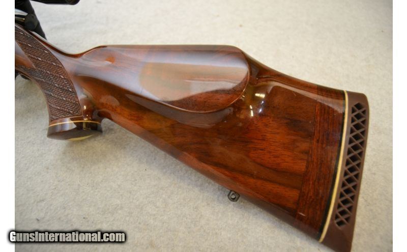 Description: Overall condition of this rifle is very good. The finish is in very good condition with some occasional minor inactive pitting and some thinning around the muzzle. The stock is in good shape but does have some minor dents and some scuffs. As is obvious in the pictures; the stock had been shortened at some point in its life and then professionally extended again. The bore is in excellent condition with great shine and strong lands/grooves. The magazine floor plate has been engraved with a floral themed "L S".This rifle has the standard trimmings of the Mark V line. A fluted bolt body reduces weight and bearing surface to eliminate binding and enhancing the smoothness of the action. The 54-degree bolt lift quickens follow-up shots and improves clearance with the scope saving both it and your fingers. SOLD Caliber Info: .204 Weatherby Magnum Chambers: Bolt-action fed from a 5-round integral magazine with hinged floor plate. Metal Condition: Very good. Wood Condition: Very good. Bore Condition: Excellent. Barrels: 26" With high gloss bluing. Triggers: Narrow matte black metal with grooved surface. Stock: Diamond-point skipline checkering on walnut in Monte Carlo Style with rosewood grip cap. Stock Dimensions: 14" LOP Fore End: Side panel diamond-point skipline checkering on walnut with rosewood tip. Butt Pad: Ventilated brown rubber pad with Weatherby name/logo on it. Weight: 10lbs Sights: No iron sights; has a Leupold 3-9x40mm Vari-X II scope with duplex reticle. Item Location: Green Bay, WI |