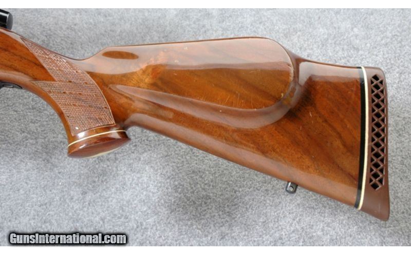 Description: SOLD Manufacturer: 1972-74 Caliber Info: .300 Wby. Mag. Metal Condition: Fair, scattered scratches, nicks and finish wear. Name scratches into floor plate. Wood Condition: Fair, with nicks, dents, scratches and some finish cracking Bore Condition: Very good, bright and sharp Barrels: 24 inch Stock: Skip line checkered walnut Monte Carlo stock with cheek piece Stock Dimensions: 13 1/2 inch LOP Fore End: Skip line checkered walnut with rosewood cap Butt Pad: Weatherby recoil pad Weight: 8 lbs. 14 oz. with scope Sights: Redfield 3-9x scope Item Location: Lehi, UT |
