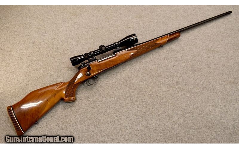 Description: This is a Japanese made Weatherby Mark V Deluxe in .340 Weatherby Magnum with a Leupold 3-9 riflescope .340 Weatherby Magnum SOLD Metal Condition: "Good condition overall with a number of small scratches, freckling on barrel and bolt plus some wear in the bluing on the floor plate, trigger guard and bolt handle Wood Condition: Good overall condition with a number of small scratches and dents plus some compression to the heel of the pad Bore Condition: Clean with some wear to the rifling Barrels: 26 Stock Dimensions: 13 1/2" LOP Fore End: Checkered walnut Butt Pad: Weatherby pad Weight: 9 lbs. 10 oz. Sights: Leupold Vari-X IIc 3-9x40mm riflescope Item Location: Glendale, AZ |