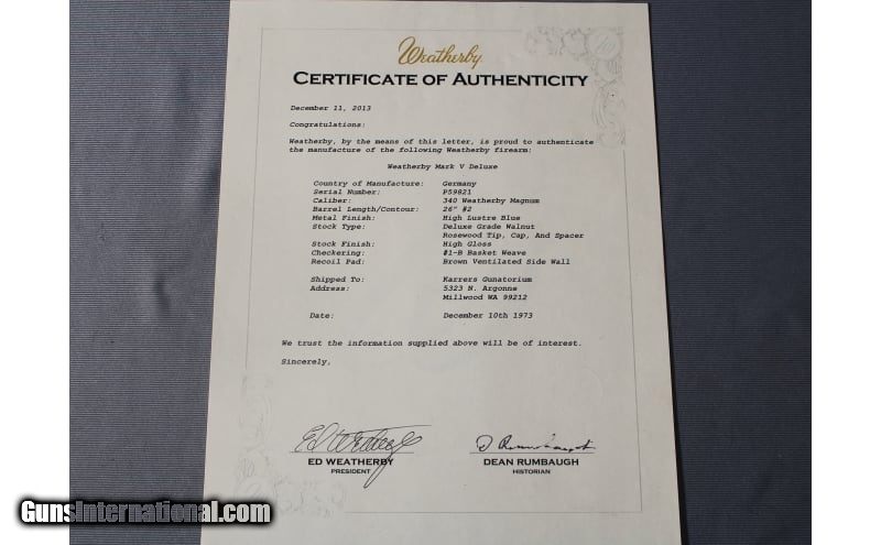 Description: For the high end collector - Weatherby Mark V Deluxe in near pristine condition. Made in 1973 with a high gloss deluxe grade walnut stock with rosewood accents. This left handed bolt action rifle is chambered in .340 Weatherby Magnum and I don't know if it's ever had a round through it. Comes with a certificate of authenticity from Weatherby detailing the rifle. .340 Weatherby Magnum SOLD Metal Condition: very good Wood Condition: very good Bore Condition: bright Barrels: 26" barrel; contour #2 Stock Dimensions: 14 Fore End: Basket weave wood Butt Pad: Weatherby rubber Weight: 8 lb - 2 oz. Sights: none Item Location: Council Bluffs, IA |